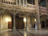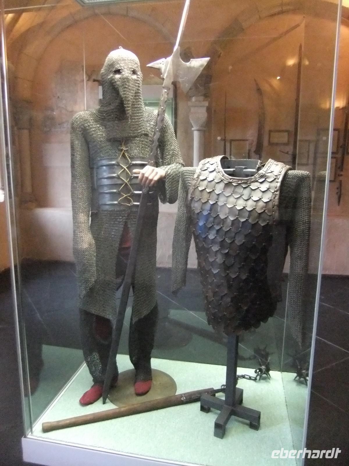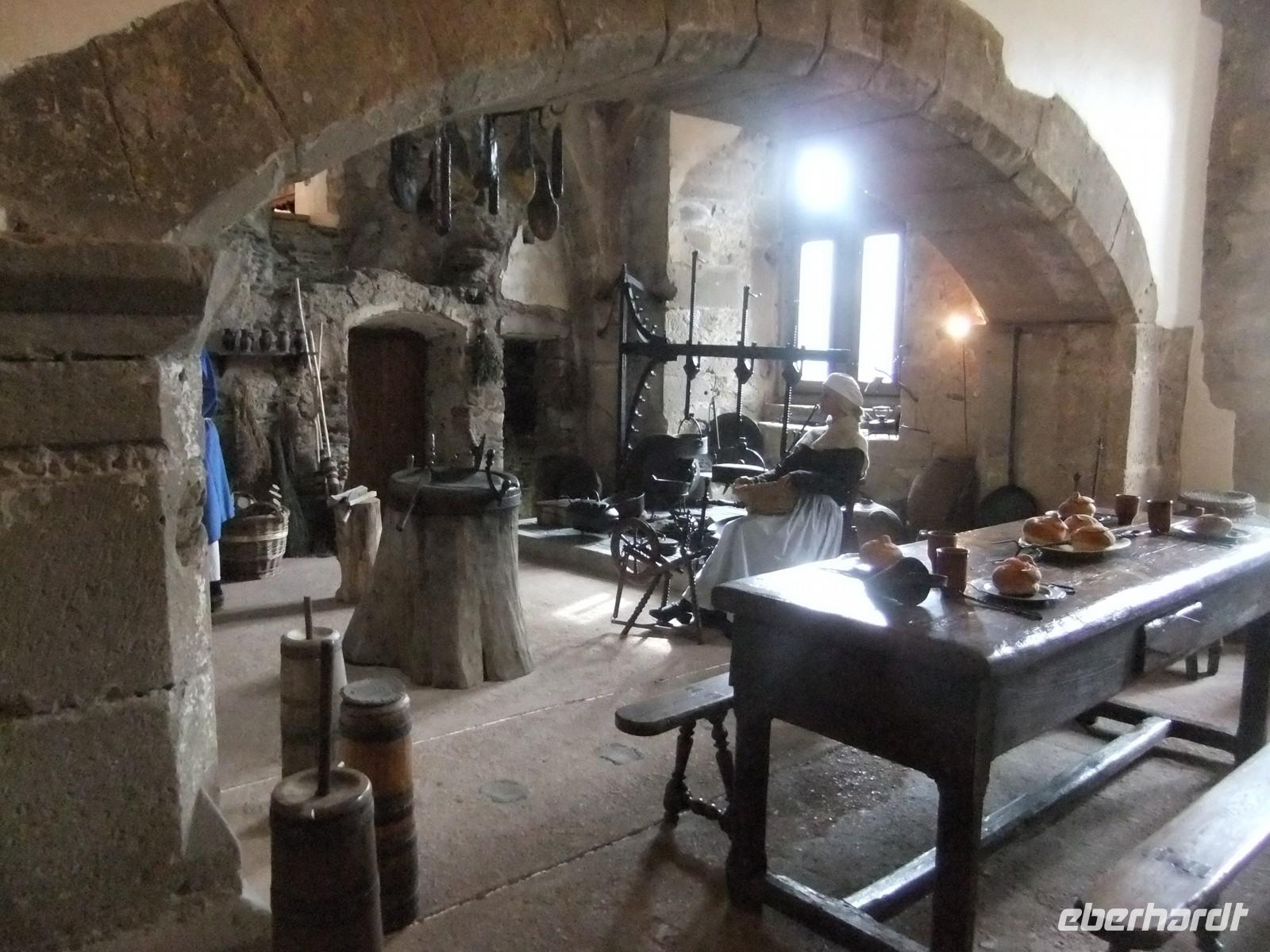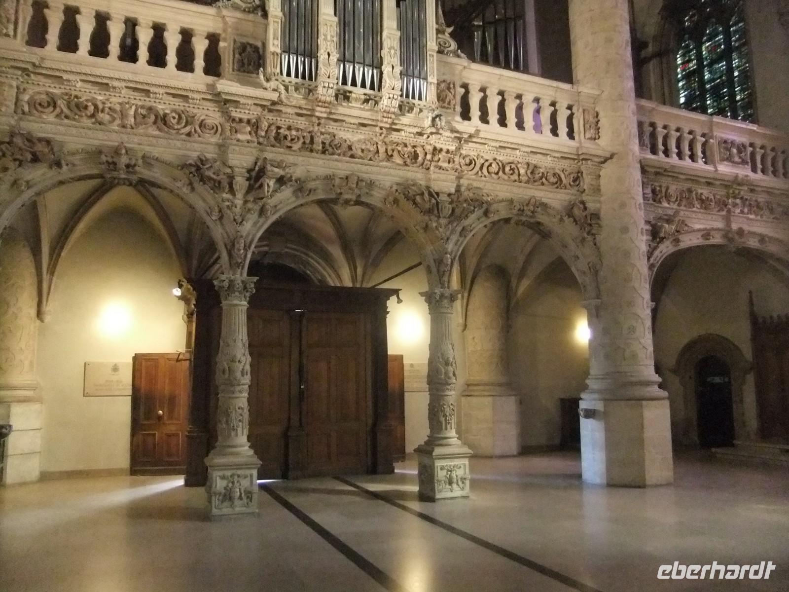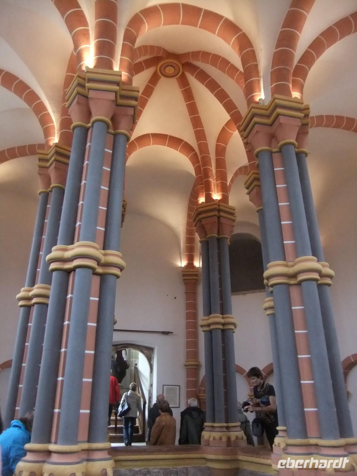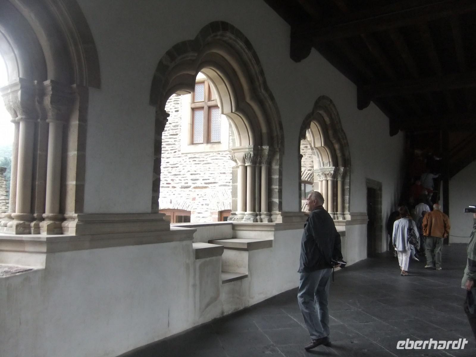 Wir finden nach einer Orientierungsrunde auch einen relativ kurzen Aufstieg. Die mächtigste Wehranlage Luxemburgs (nach der Schleifung der Bundesfestung in der Hauptstadt) ging aus einer kleinen römischen Wachanlage hervor. Leider hatte Luxemburgs erster Großherzog, Wilhelm I der Niederlande wenig Interesse für das Land und versteigerte mehrere Burgen. Der neue Inhaber, ließ alles, was sich weiterverkaufen ließ, herausreißen, die Kupferbedachung, die Bleiverglasung und so machten Wind und Wetter aus der stolzen Anlage eine Ruine. Heute ist Vianden in Staatsbesitz und vorbildlich restauriert. Wir besichtigen die viele Räume wie den alten und neuen Palas, Waffensaal, Ritterstube und Weinkeller und die doppelstöckige Burgkapelle, ein zehneckiger Raum mit eleganten Säulen für die Herrschaft, mit Öffnung zur finsteren Unterkapelle mit Kreuzgratgewölbe für das niedere Volk. Zweiklassenandacht.