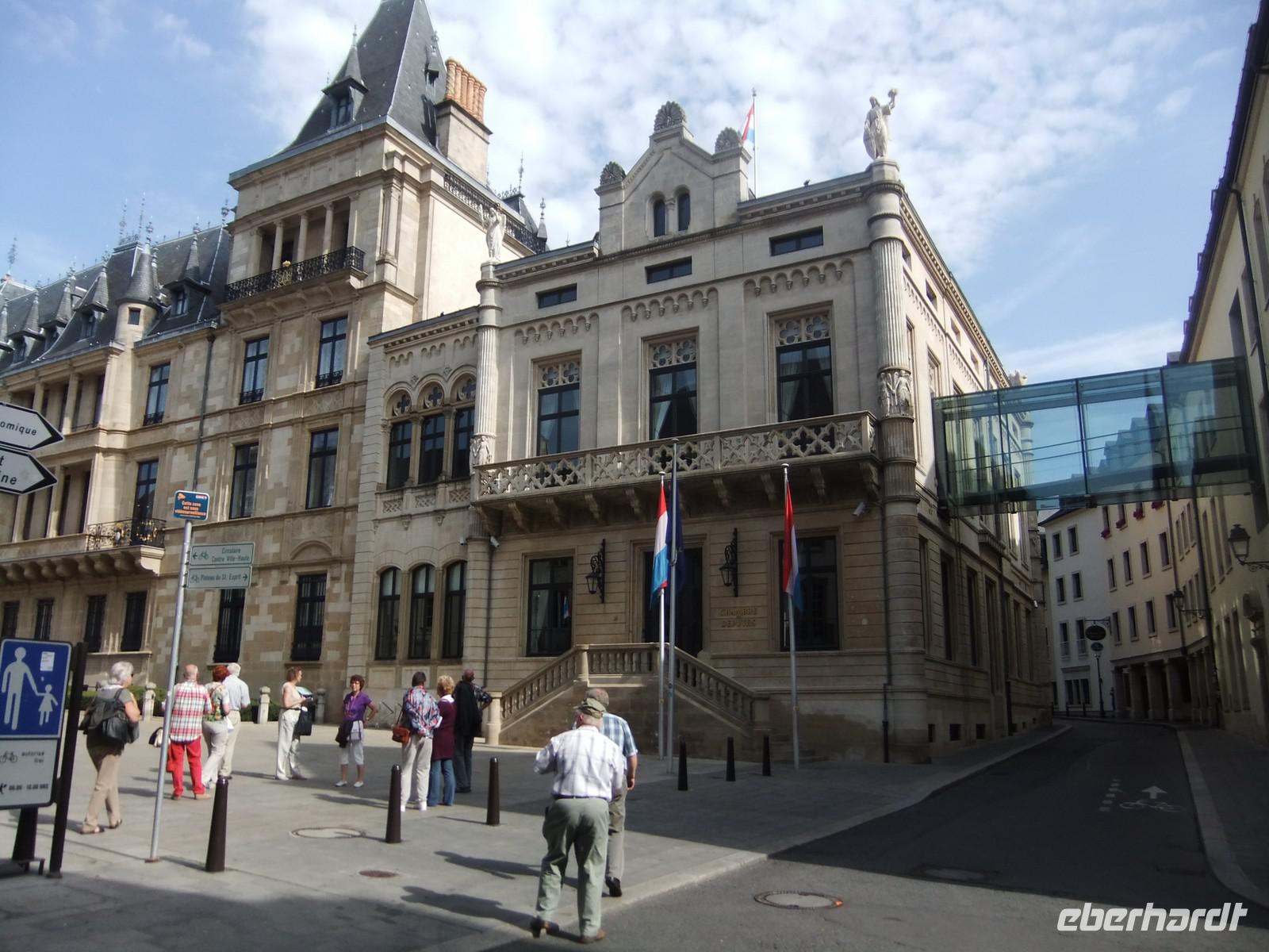 Uns erwartet die Landeshauptstadt, die wir nach reichlich einer Stunde erreichen. Die beiden Stadtführerinnen treffen wir an der place de Constitution. Die Gelle FRA, Symbol des Unabhängigkeits- und Freiheitswillens der Luxemburger, begrüßt uns. Neutral und unbewaffnet wollte Luxemburg sein und die Großmächte bestätigten das 1867 in London. Heute ist Luxemburg EU- und NATO-Mitglied. Wir steigen aber gleich wieder in den Bus, um die nähere Umgebung der Altstadt zu erkunden. Die Neue Brücke (pont Adolphe), damals die größte Steinbogenbrücke der Welt, führt über das Petrussetal zu einem neueren Stadtteil, der nach Schleifung der Festung um den Bahnhof herum erbaut ist. Die neueste Brücke ist die rot angestrichene Stahlbrücke Grand-Durchesse Charlotte und führt auf das Kirchberg-Plateau, das erst nach 1960 bebaut wurde. Luxemburg hat eine Reihe von Organisationen der EU (wie Brüssel, Strasbourg und Frankfurt), die hier ebenso ihre gläsernen Paläste haben wie die Filialen europäischer Banken und der vielen Investmentgesellschaften. Der Finanzsektor ist ein bedeutender Teil des Bruttosozialproduktes, zu dem auch etwa 150.000 Grenzgänger aus den 3 Anliegerstaaten beitragen. Die Altstadt ist sehr lebendig. Man braucht nicht weit zu gehen, um die wichtigsten Sehenswürdigkeiten zu erkunden: die Kathedrale Notre-Dame, die protestantische Dreifaltigkeitskirche, bescheidene Regierungsgebäude, Denkmäler und natürlich das Palais des Großherzogs. Großherzog Henri ist nicht auf Arbeit, ein Soldat genügt als Wache. Vielleicht ist er zu Hause, auf seiner Burg Colmar-Berg.