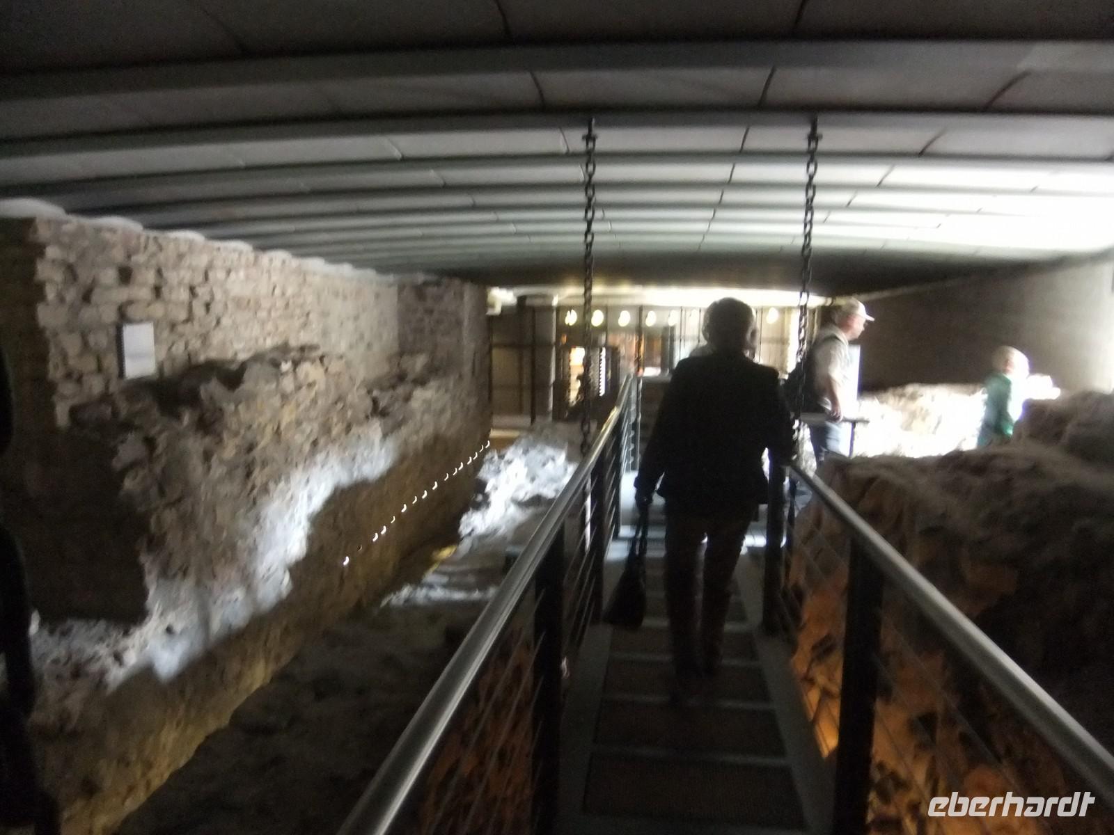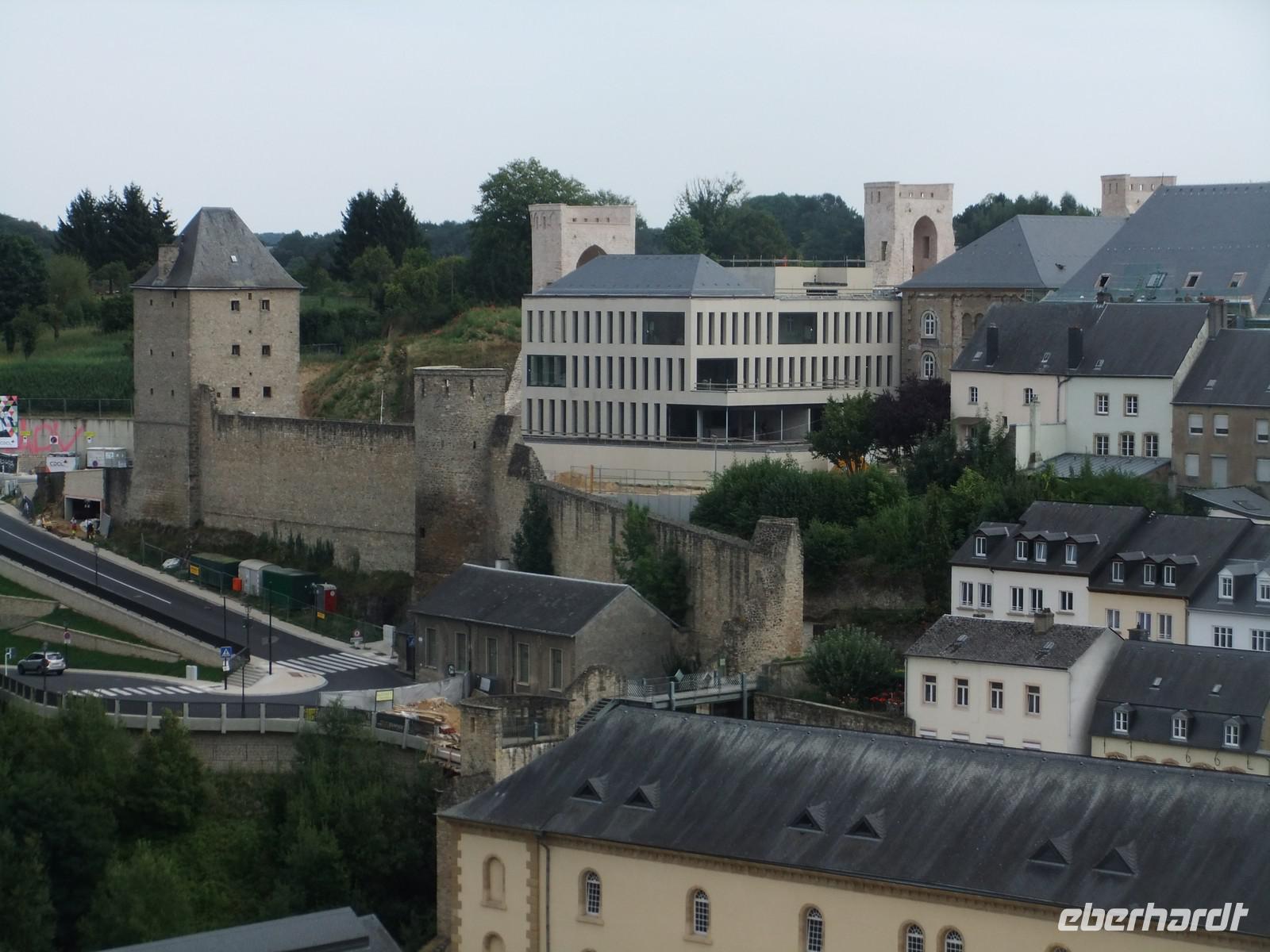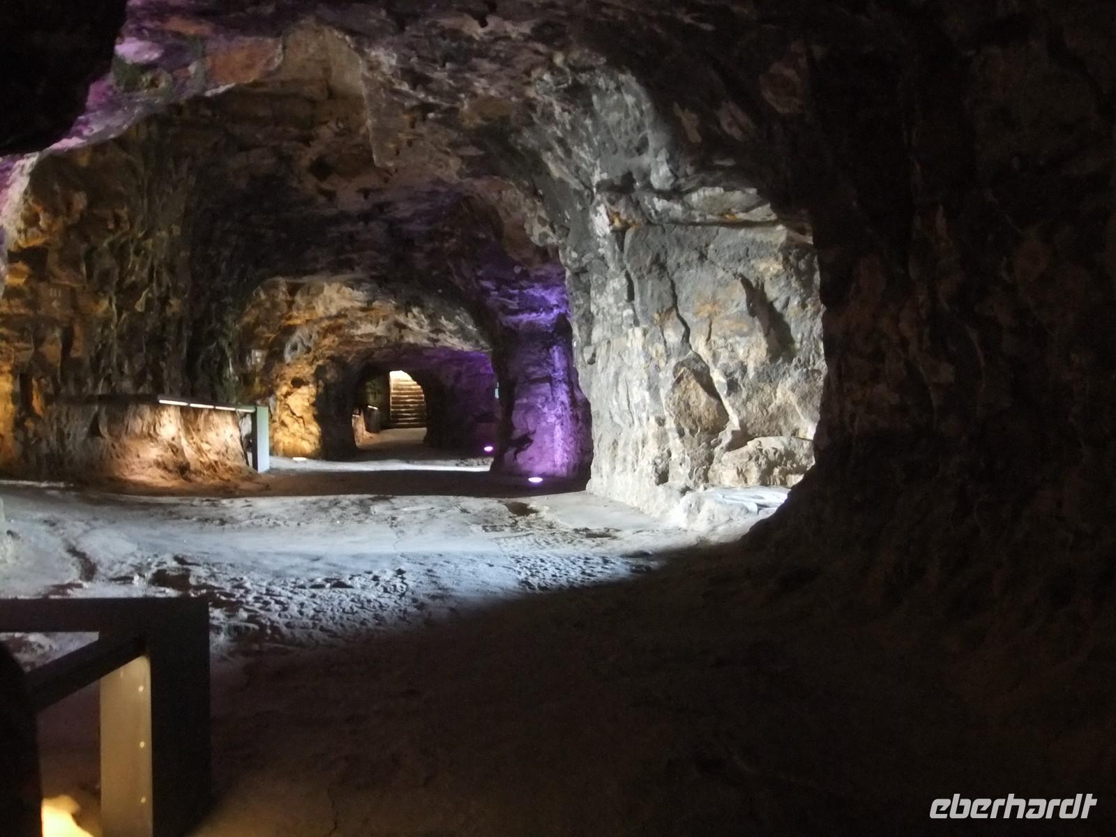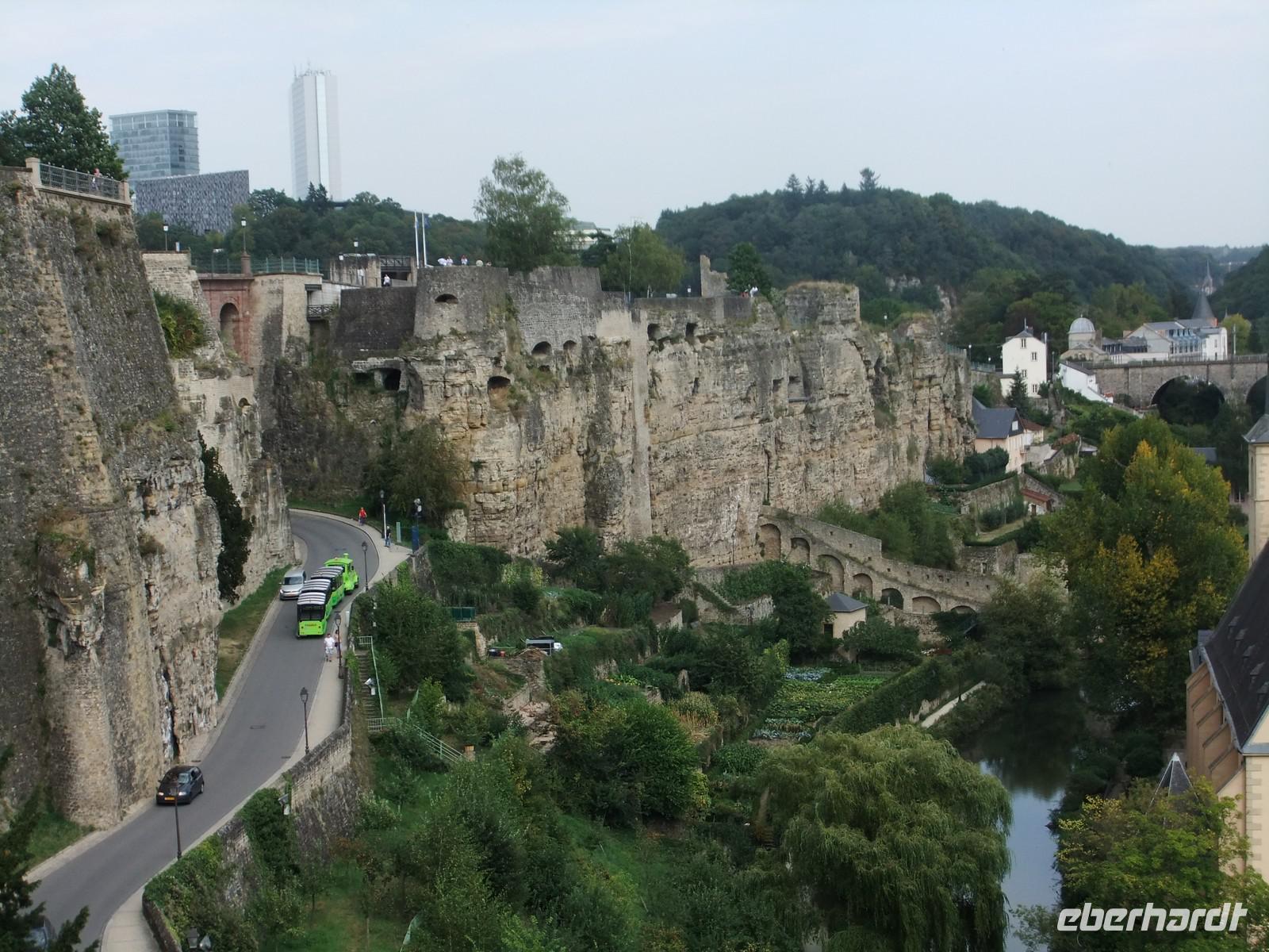 Anschließend besuchen wir die Kasematten auf dem Bockfelsen. Seit dem Bau der Lützelburg durch den Ardennergrafen Siegfried im Jahre 963 wurde der Ort immer weiter befestigt. 27 km unterirdische Gänge und Gewölbe wurden in 900 Jahren in die Felsen geschlagen, jede Herrschaft, meist waren es Fremde, leistete ihren Beitrag. Die Bock-Kasematten entstanden unter der Herrschaft der Österreicher im 18.Jhdt.. Nach beiden Seiten des schmalen Felsrückens sind die Pforten für die Kanonen herausgearbeitet, durch sie bieten sich immer wieder schöne Aussichten auf die umgebenden Höhen und die Stadtteile in den Tälern.