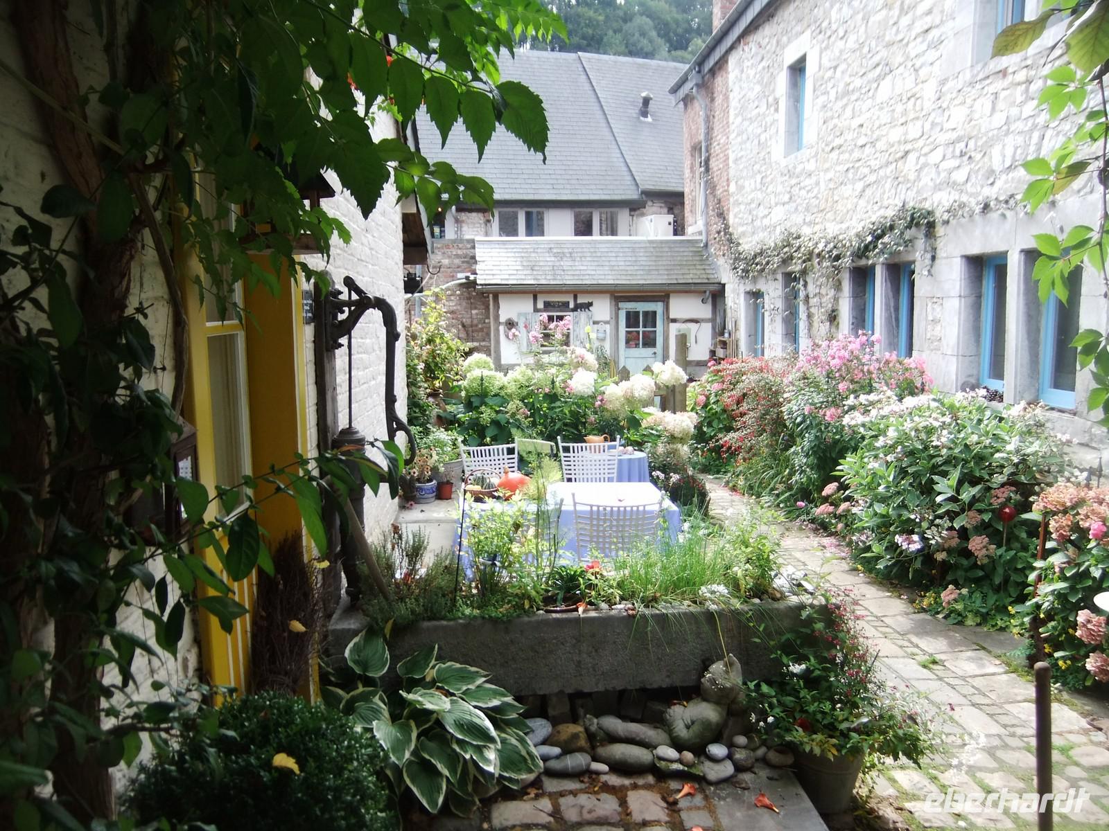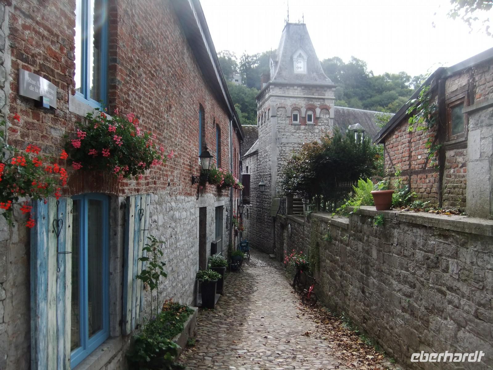 hineinteilen. Wie im Luxemburger Teil, dem Ösling, sind die belgischen Ardennen durch zum Teil kahle Hochflächen gekennzeichnet, auf denen Landwirtschaft betrieben wird und tief eingeschnittene Täler. Die Ourthe hat eines dieser romantischen Tallandschaften gestaltet. An ihr liegt die kleinste Stadt der Welt, so die Werbung. Ihr Ortskern hat nur 400 Einwohner. Lassen wir ihr den Ruhm, denn die Großgemeinde Durbuy hat heute 11.000 Einwohner (und wer kennt schon die wirklich kleinste Stadt der Welt - Arnis in Schleswig-Holstein mit 300 Einwohner). Durbuy ist ein Touristenmagnet, im Frühjahr wegen seiner Wiesen mit wildwachsenden Primel, im Sommer für Kajakfahrer und zu allen Zeiten wegen sein kleinen Altstadt mit verwinkelten Gassen und einer Burg, dem Park mit den aus Buchsbaum geschnittenen Figuren und seiner Gastronomie. Für letzteres haben wir keine Zeit, aber es reicht noch für ein belgische „Nationalgericht" - Pommes Frites mit Mayonaise.