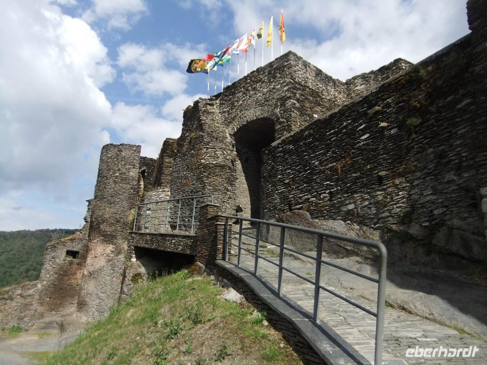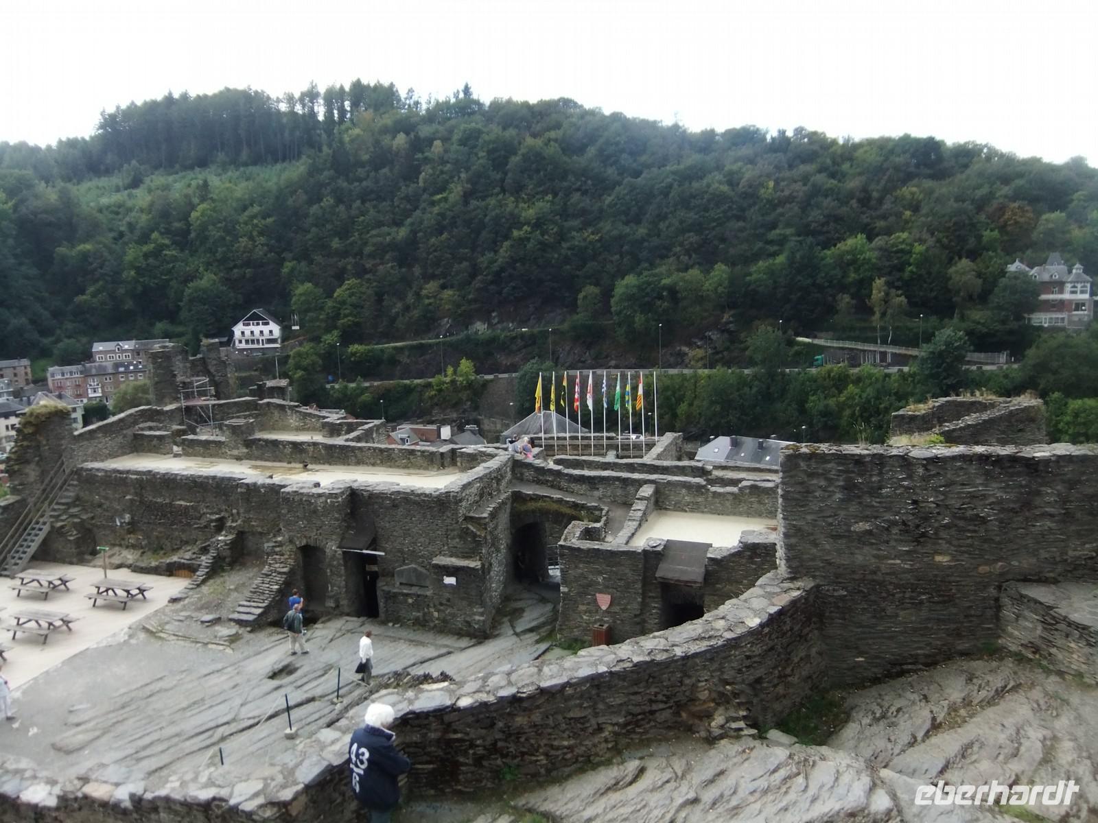 Wir fahren weiter an der Ourthe entlang und kommen an ein kleines Städtchen - la Roche an Ardenne. Man sieht es der schmucken Stadt nicht mehr an, dass sie während der Ardennenoffensive der Deutschen und der Gegenoffensive der Amerikaner fast vollständig zerstört wurde. Die dem heiligen Nikolaus geweihte Stadtkirche und die Ruine der Burg widerstanden weitgehend. Die Burg blickt auf fast 2500 Jahre zurück, schon vor den Römern waren die Kelten hier. Bis in das 18.Jahrhundert hinein war auf dem Bergsporn eine bedeutende Festung angelegt, dann wurde sie Baumateriallieferant für die Einwohner. Die Reste geben noch einen guten Eindruck von ihrer ehemaligen Größe.