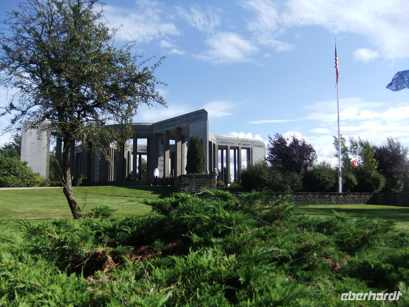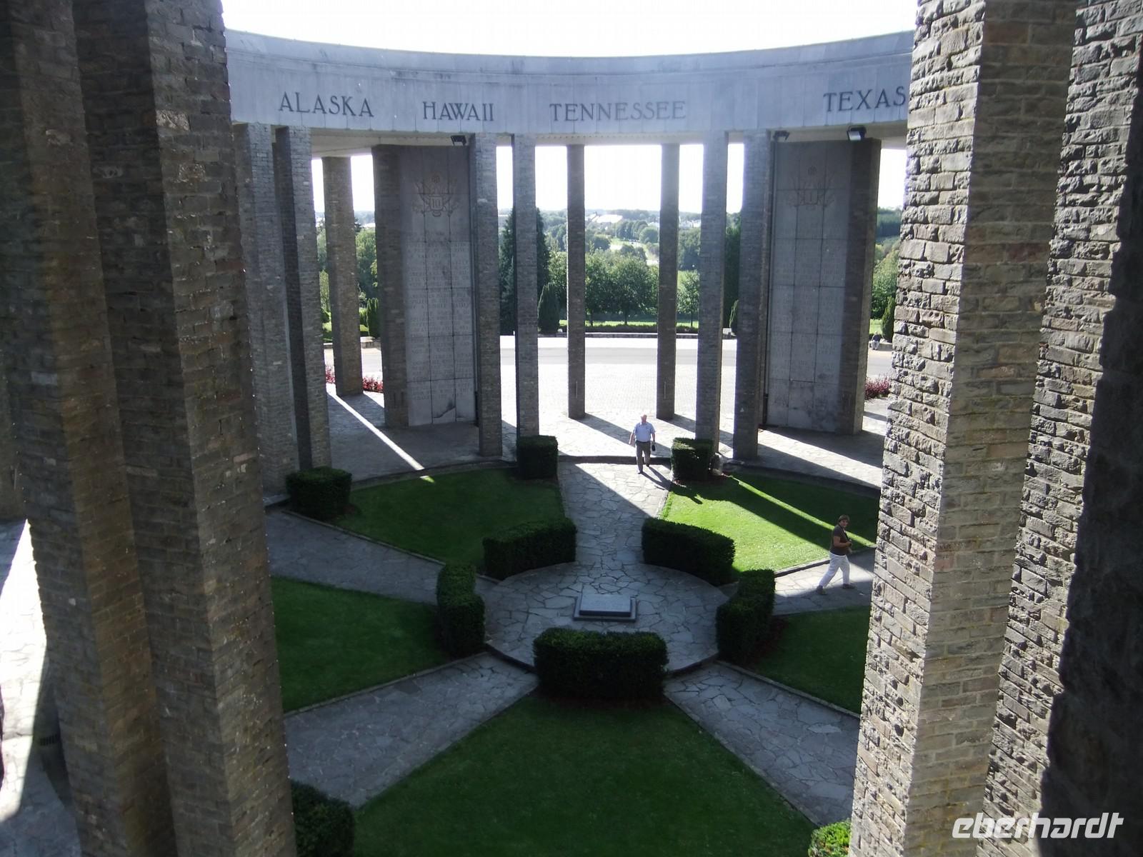 Auf der Rückfahrt besuchen wir noch das Memorial von Mardesson für die amerikanischen Soldaten, die bei der Befreiung und der Wiederbefreiung nach der deutschen Rundstedt-Offensive ihr Leben ließen. Bei Bastogne war eine Einheit auf engstem Raum eingekesselt worden, verweigerte aber die Übergabe. Das Denkmal hat die Form eines Pentagrammes. Von seiner Plattform aus kann man weit ins Land schauen.