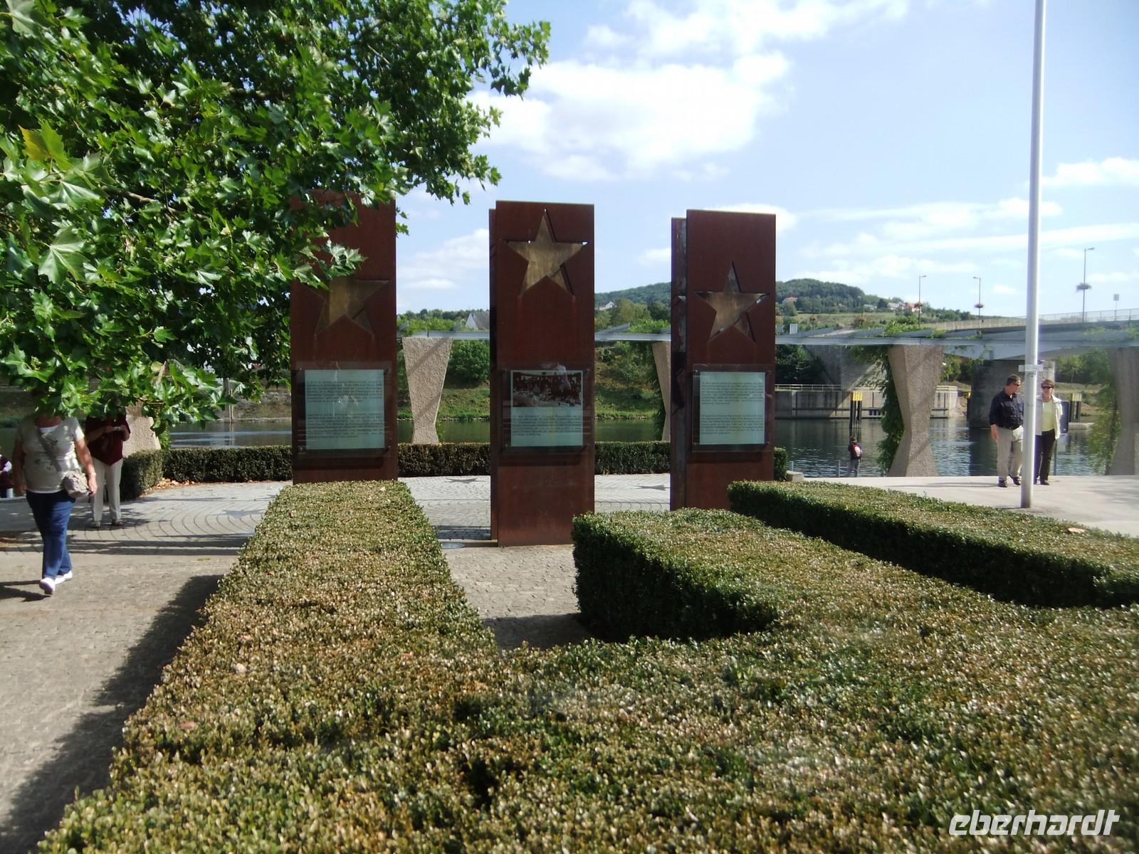 Wir fahren weiter an der Mosel entlang, durch kleine Ortschaften, vorbei an Winzergenossenschaften und kommen dann zum 2. Dreiländereck, diesmal ist Frankreich dabei. Und hier, in dem etwa 500 zählenden Ort Schengen wurde auf dem Schiff MS Princesse Marie-Astrid (wir sahen es zweimal ) schon 1985, noch vor dem Fall der Berliner Mauer und dem Ende der als „Eiserner Vorhang" bezeichneten Trennlinie mitten durch Europa ein Abkommen unterzeichnet, das 1993 wirksam wurde. Wann hat es das in 2000 Jahren europäischer Geschichte schon einmal gegeben, dass man von Land zu Land reisen konnte, ohne nach „woher?" und „wohin?" gefragt zu werden, falls man überhaupt reisen konnte ?.
