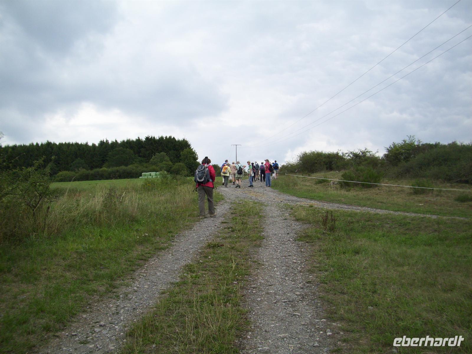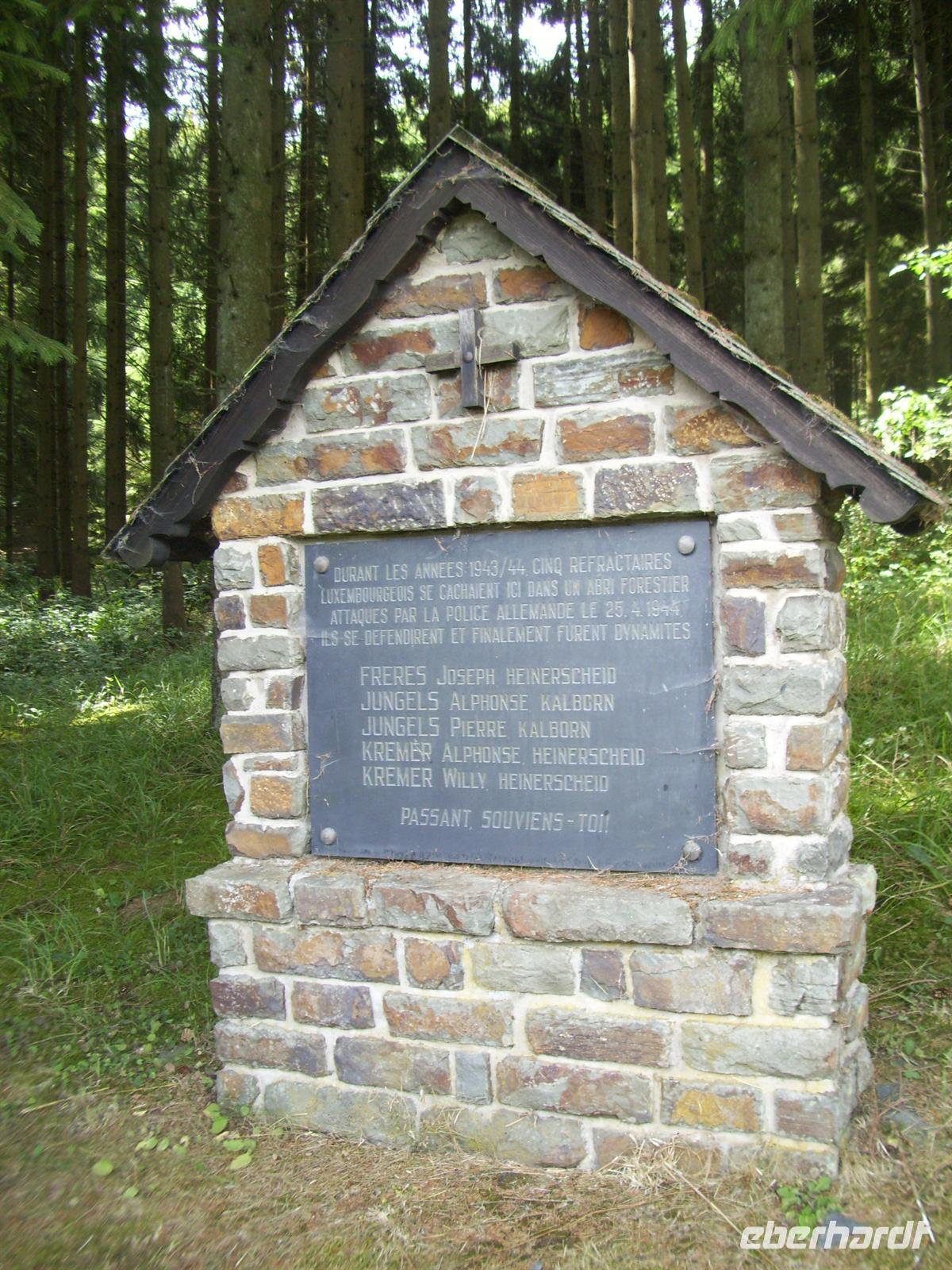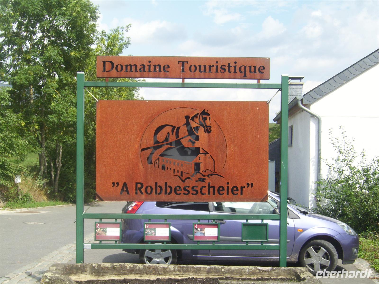 Am zweiten Wandertag hieß die Route Clervaux - Munshausen - Clervaux. Wie am vorherigen Tag mussten wir erst einmal aus dem Tal heraus, in dem Clervaux liegt, und der feine Nieselregen machte den beschwerlichen Anstieg auch nicht leichter. Aber wir schafften es natürlich alle unbeschadet. Auf unserem weiteren Marsch wurde der Regen immer stärker, bis er schließlich in einen heftigen Platzregen ausartete, bei dem auch Regenschirm und wasserdichte Multifunktionsjacke nichts mehr halfen. Aber es half kein Jammern, da mussten wir durch. Als wir an unserem Etappenziel ankamen, kämpfte sich die wärmende Sonne auch gerade ihren Weg durch die Wolken, was uns nur recht sein konnte. Unser Ziel hieß „A Robbesscheier“ und ist eine Art Erlebnisgut bei Munshausen in den luxemburgischen Ardennen. Wir ließen uns zuerst ein