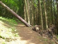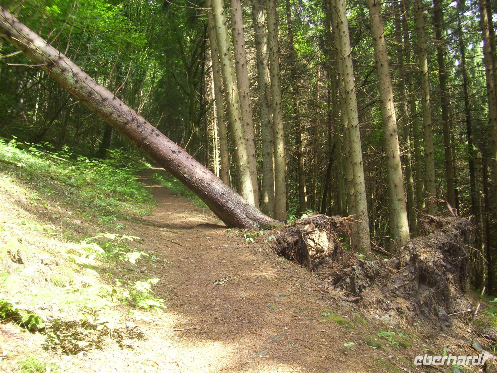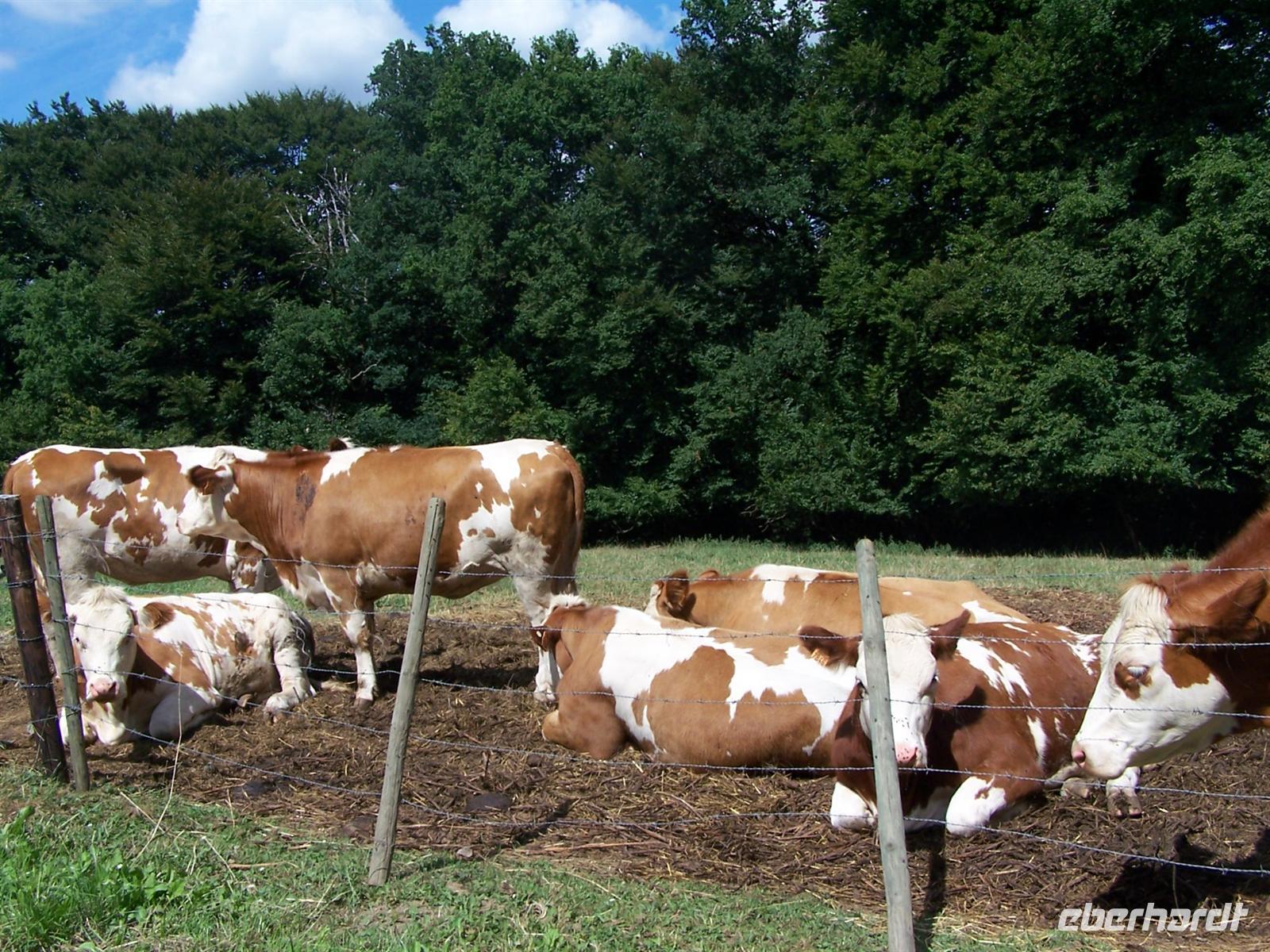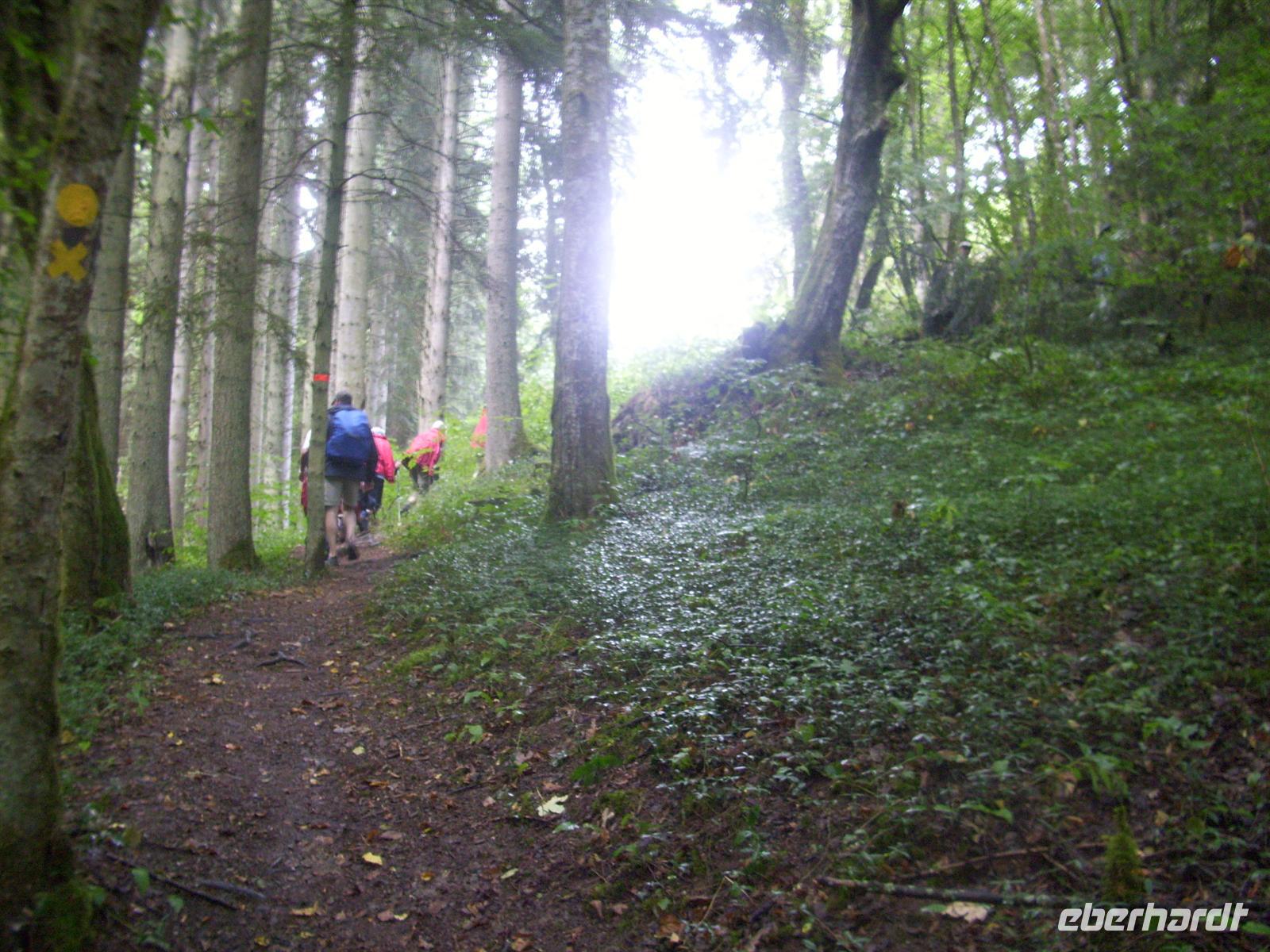 Am zweiten Wandertag hieß die Route Clervaux - Munshausen - Clervaux. Wie am vorherigen Tag mussten wir erst einmal aus dem Tal heraus, in dem Clervaux liegt, und der feine Nieselregen machte den beschwerlichen Anstieg auch nicht leichter. Aber wir schafften es natürlich alle unbeschadet. Auf unserem weiteren Marsch wurde der Regen immer stärker, bis er schließlich in einen heftigen Platzregen ausartete, bei dem auch Regenschirm und wasserdichte Multifunktionsjacke nichts mehr halfen. Aber es half kein Jammern, da mussten wir durch. Als wir an unserem Etappenziel ankamen, kämpfte sich die wärmende Sonne auch gerade ihren Weg durch die Wolken, was uns nur recht sein konnte. Unser Ziel hieß „A Robbesscheier“ und ist eine Art Erlebnisgut bei Munshausen in den luxemburgischen Ardennen. Wir ließen uns zuerst ein
