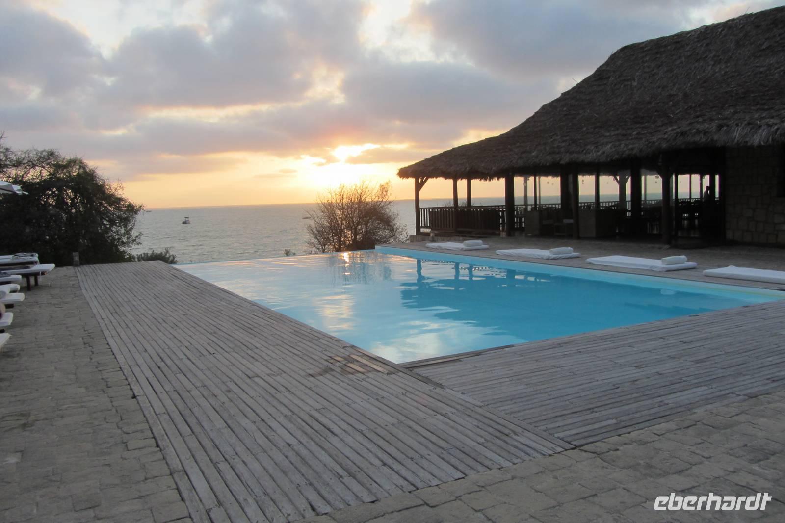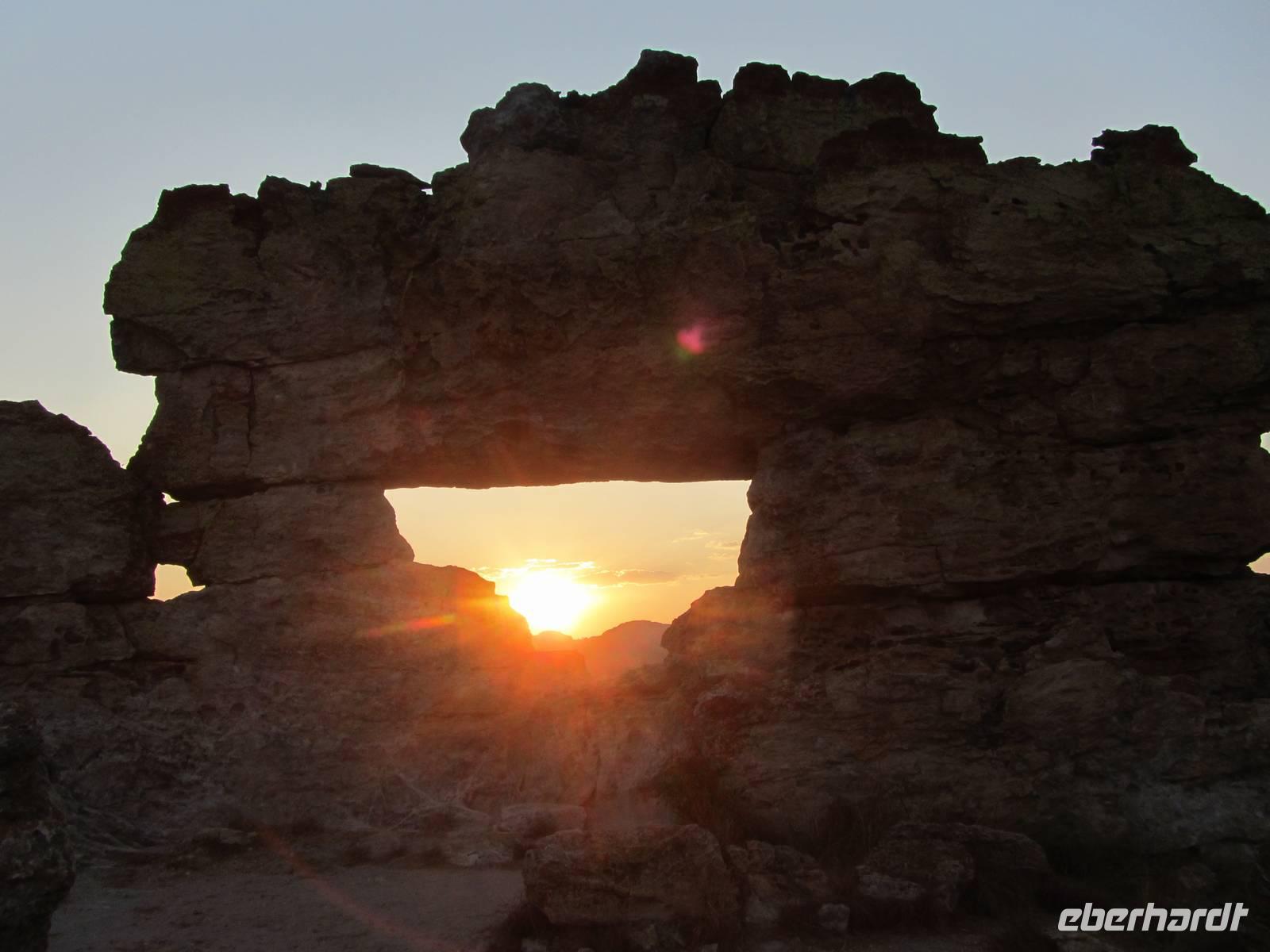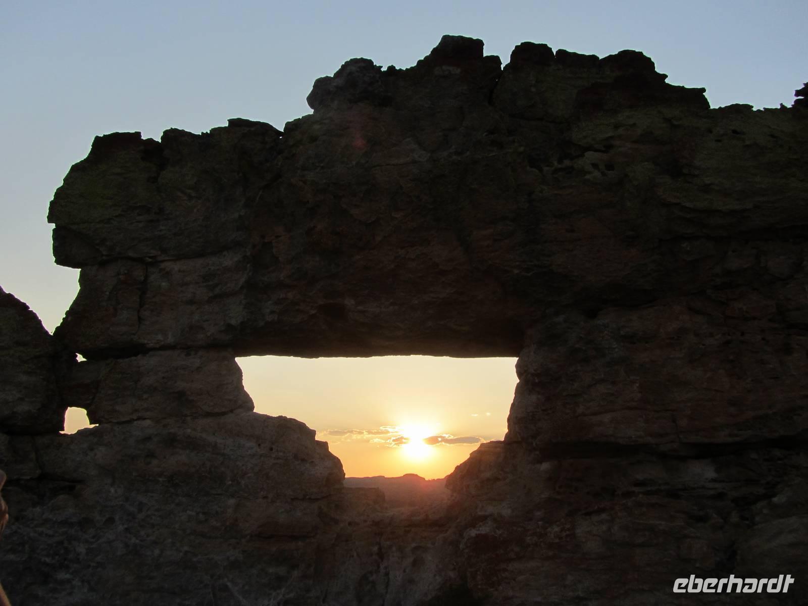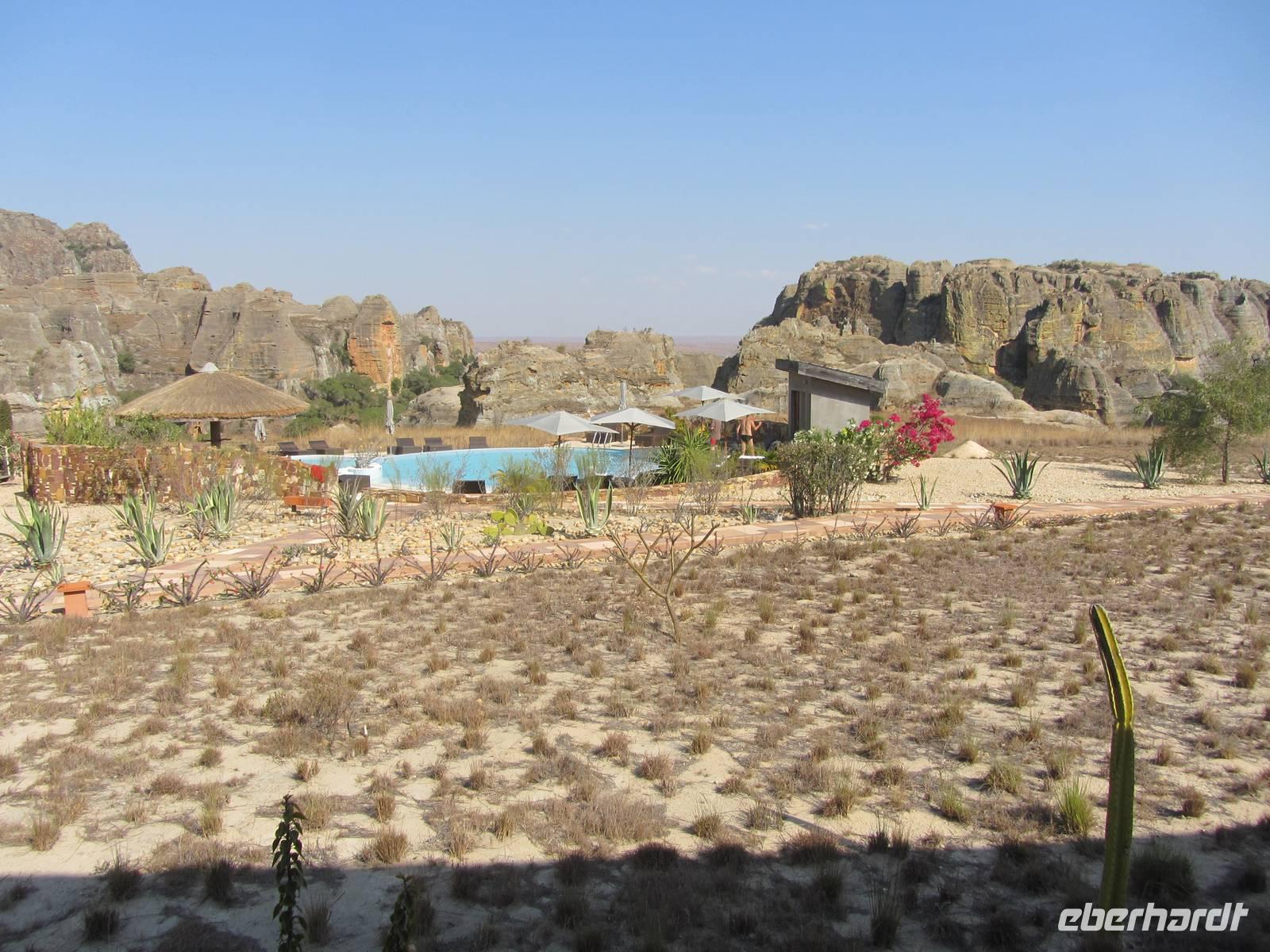 Danach haben wir uns unser Mittagessen verdient, die meisten der Gruppe wählen heute Omlett. Anschließend fahren wir uns zurück zum Hotel und genießen die Annehmlichkeiten des Hotels wie zum Beispiel den Pool. Am Abend erwartet uns noch ein toller Höhepunkt.Wir fahren gemeinsam zum Fenster von Isalo, einer besonderen Stein-Formation, und erleben hier den wunderschönen Sonnenuntergang. Jocelyn und Eberhardt haben eine kleine Überraschung vorbereitet. Es wird inmitten der Steine ein kleines Buffett mit ein paar Flaschen Kokoslikör, Wein und Rum und etwas zum Knabbern aufgebaut und wir stoßen auf den tollen Tag an. Danach sucht sich jeder ein perfektes Plätzchen, um den besten Standort für das perfekte Foto zu finden. Zurück im Hotel wartet schon unser nächstes leckere 3-Gang Menü.