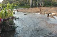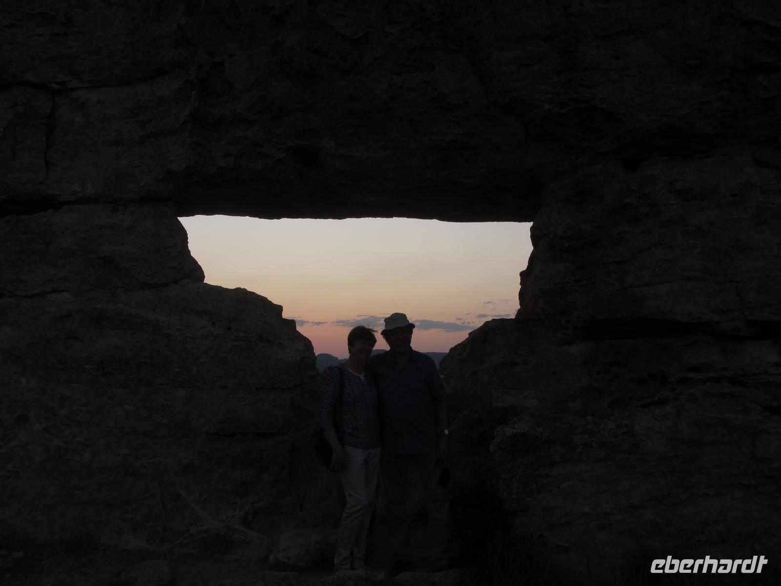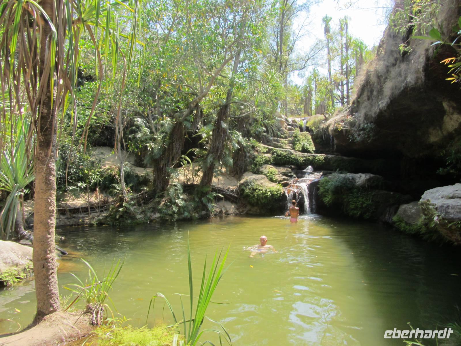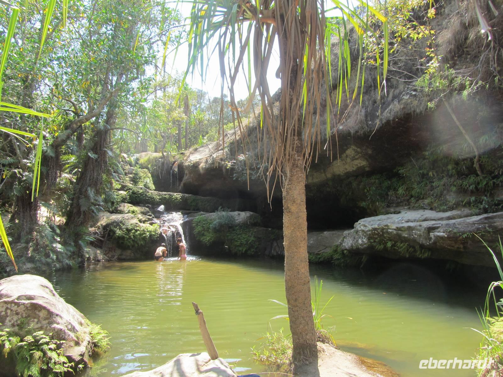 Die Wanderung beginnt mit einem steilen Aufstieg über viele Treppen. Doch die Aussicht entschädigt. Der örtliche Führer zeigt uns wie und wo die Einheimischen in den Felsen beerdigt werden. Weiter geht es über Stock und Stein bis unser Ziel der "natürliche Schwimmingpool" erreicht ist. Ein kleiner Teich, der durch einen kleinen Wasserfall mit Frischwasser versorgt wird, wird für einige Mitglieder der Gruppe zur wohltuenden Erfrischung. Auf dem Rückweg meint es die Sonne gut mit uns und die Wanderung wird doch recht anstrengend.