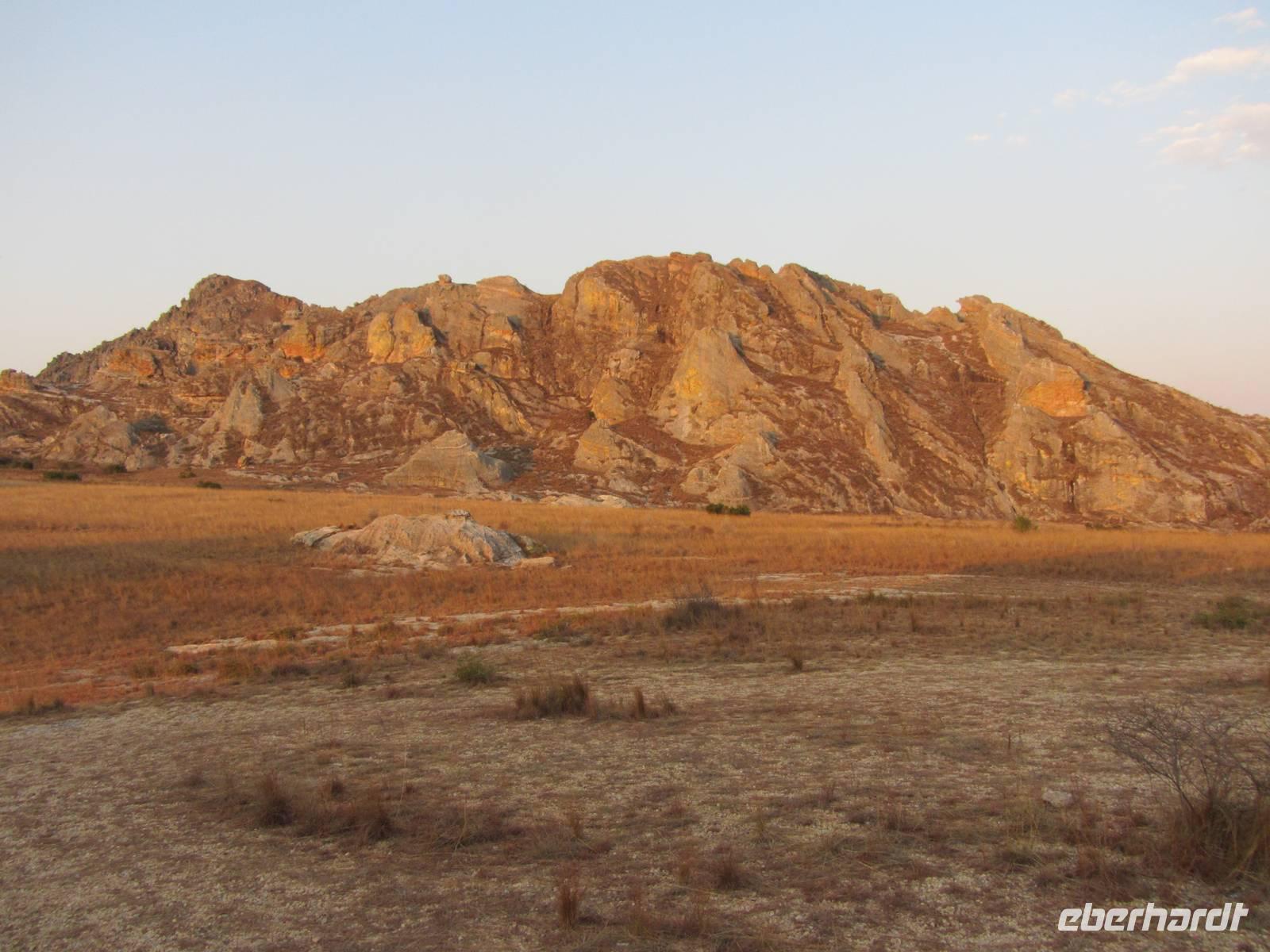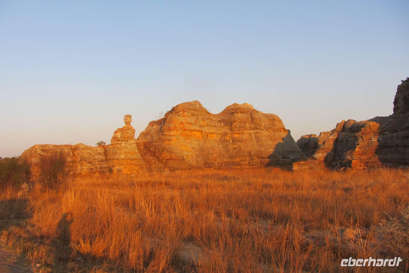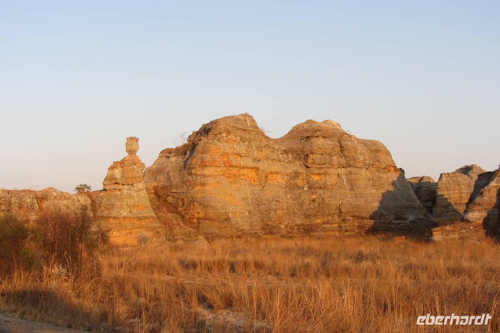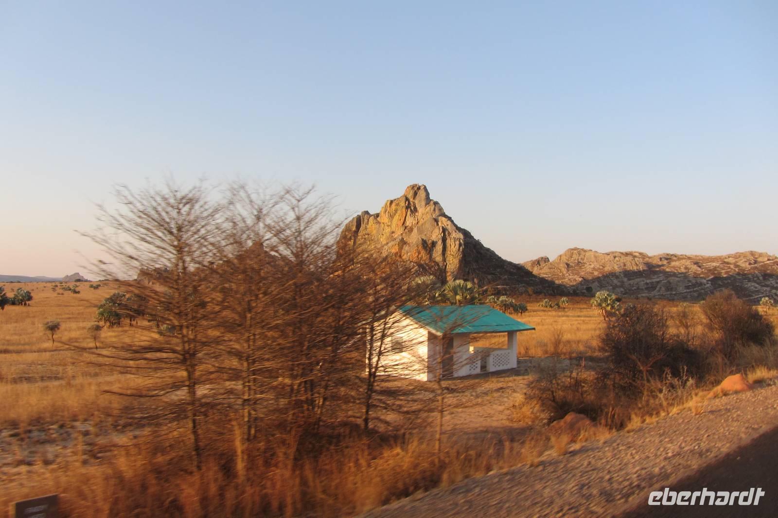 Am nächsten Morgen heißt es schon wieder Koffer auf den Bus laden, denn unser heutiges Ziel ist Isalo. Wir machen uns auf den Rückweg nach Tulear, wiederum auf der schwer befahrbaren Sandstrecke.In Tulear stoppen wir an einer einheimischen Post, um Briefmarken zu kaufen - ein erstes Erlebnis. Unser heutiges Tagesziel ist der Isalo, ca. 300 Kilometer entfernt. Vorbei an den typischen Grabstätten des Mahafaly-Stammes erreichen wir das toll zwischen Felsen gelegene Hotel Isalo Rock Lodge, die jeden Komfort bietet. Unterwegs erblickten wir die Steinformation „Die Königin", die uns erahnen lässt, was uns am nächsten Tag erwartet. Am Abend genießen wir unser 3-Gang Menü und fallen müde ins Bett.
