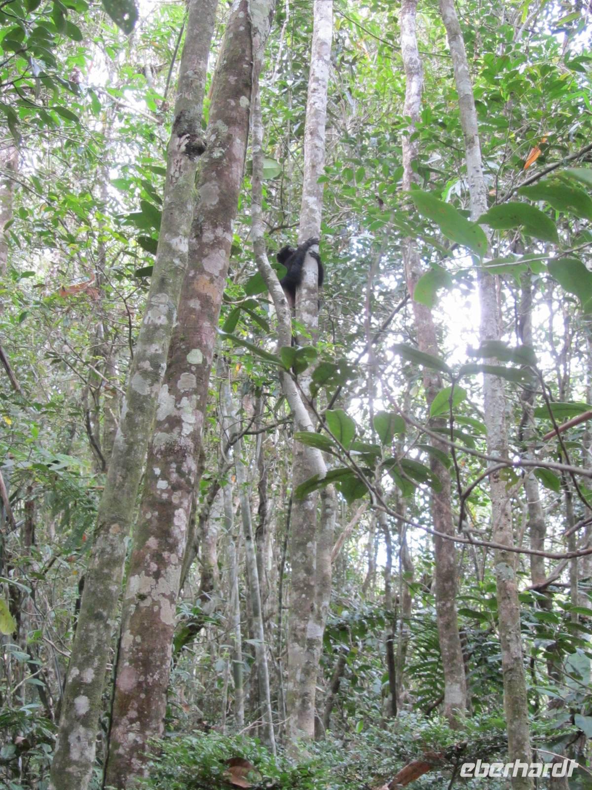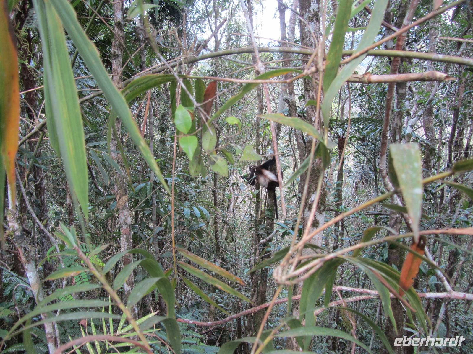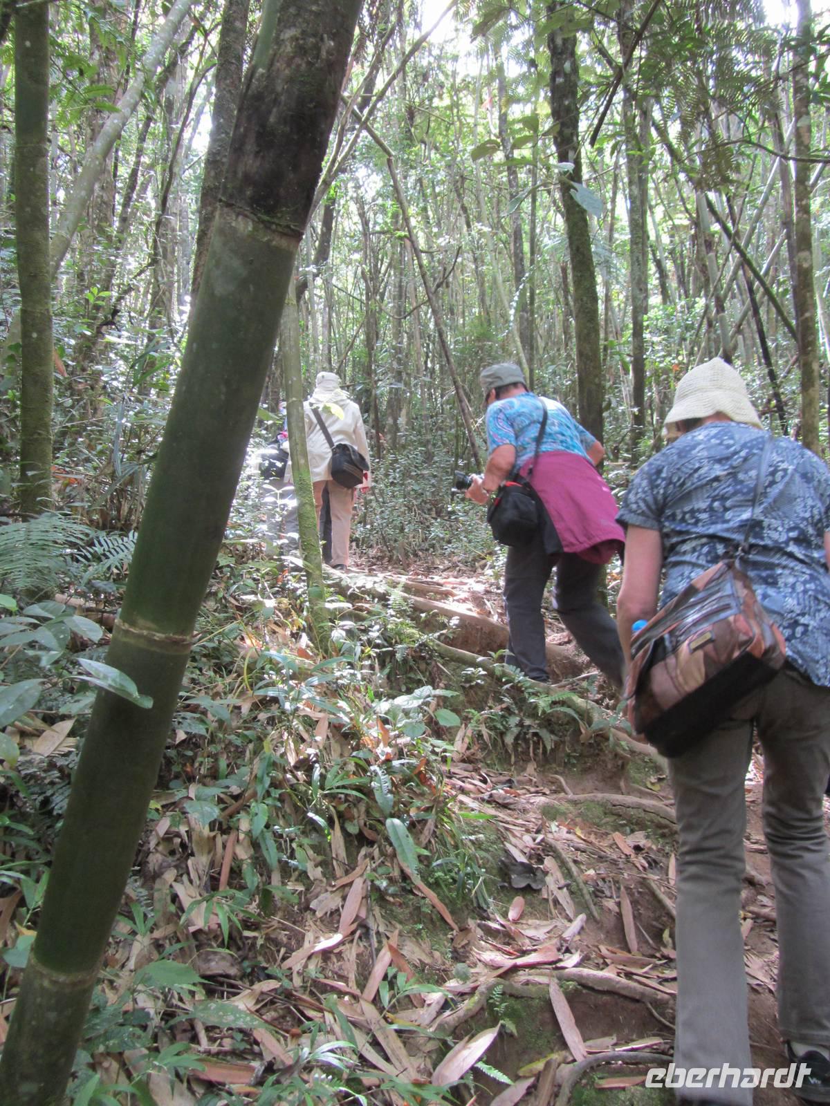 Im Nationalpark angekommen, treffen wir unsere einheimischen Führer und machen uns auf den Weg zu unserer 3-stündigen Wanderung durch den am Namorona-Fluss gelegenen ca 40000 Hektar großen Nationalpark. Wir bestaunen die einzigartige Flora und Fauna. Unsere Führer zeigen und erklären und die Pflanzen und haben ein Auge für jeden Vogel und jedes Chamäleon.Es dauert nicht lange und es kehrt Unruhe ein. Wir nehmen einen anderen Weg als geplant mitten durch den Regenwald über Stock und Stein und dann haben wir wieder großes Glück, denn die Führer haben Lemuren entdeckt. So sehen wir hoch in den Bäumen die erst 1986 entdeckten Goldenen Bambuslemuren. Wir folgen den Lemuren ein Stück und sie lassen sich nicht stören und springen munter von Ast zu Ast - ein tolles Erlebnis. Weiter geht es zu einem schönen Aussichtpunkt über den Regenwald. Unser Reiseleiter Jocelyn trägt uns ein Gedicht vor: