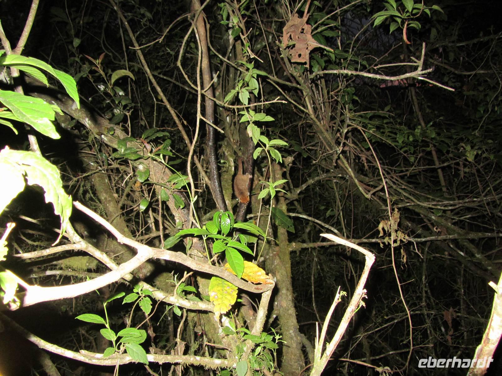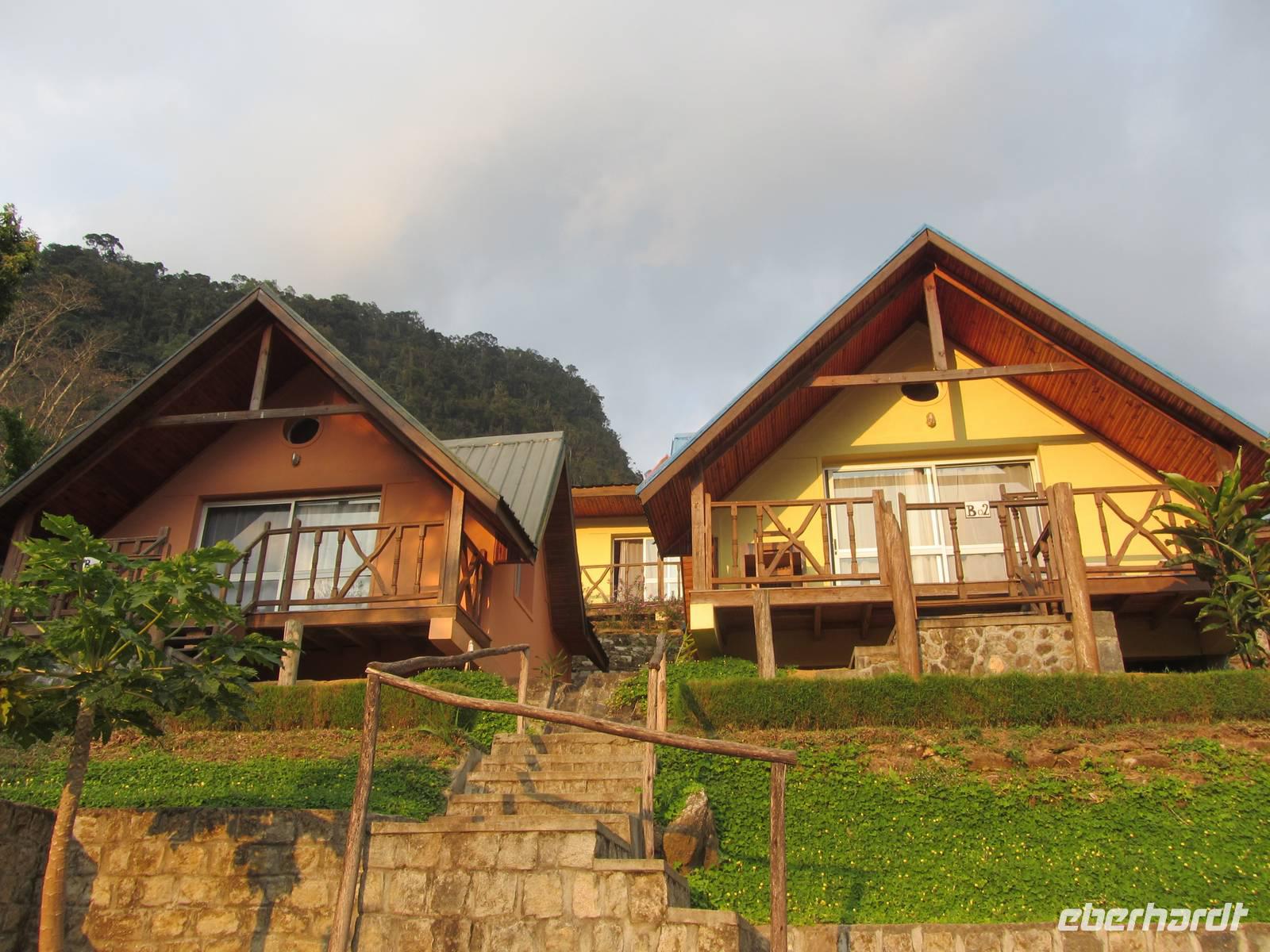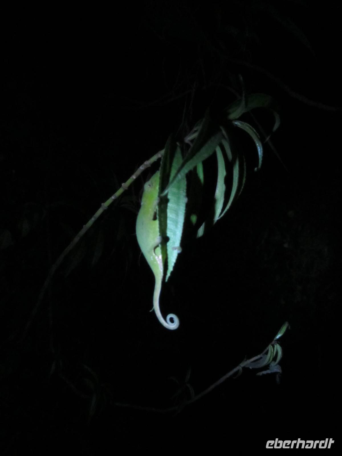 Nach unserer Wanderung fahren wir in das Dorf Ranomafana. Wir speisen in einem bekannten einheimischen Restaurant, wo viele von uns auch das typisch madagassische Gericht Ramazava probieren, was uns gut schmeckt. Anschließend laufen wir durch das Dorf und bekommen einen Einblick in das alltägliche Leben. Auch ein paar Geschäfte sehen wir, wo einige einheimische Souvenirs, Obst und Gewürze angeboten werden. Wir nutzen noch die Chance, eine kleine Weberei zu besuchen. Danach beziehen wir unser Hotel mit kleinen Bungalows direkt am Hang mit herrlichem Blick auf den Nationalpark. Nach einer Pause geht es noch einmal auf Tier-Suche, denn wir unternehmen einen Ausflug bei Nacht. Leider ist es verboten, im Dunkeln direkt in den Nationalpark zu gehen. Wir fahren zu einem Punkt an der Straße, wo die Maus-Maki sich bei Dämmerung sehen lassen sollen. Nach kurzem Warten haben wir Glück, denn die kleinen niedlichen Tierchen sitzen in den Bäumen und wir können sie gut beobachten. Danach begeben wir uns noch auf die Suche nach Fröschen und Chamäleons und dank unserer Führer haben wir auch hier Glück und können einige aus nächster Nähe beobachten.