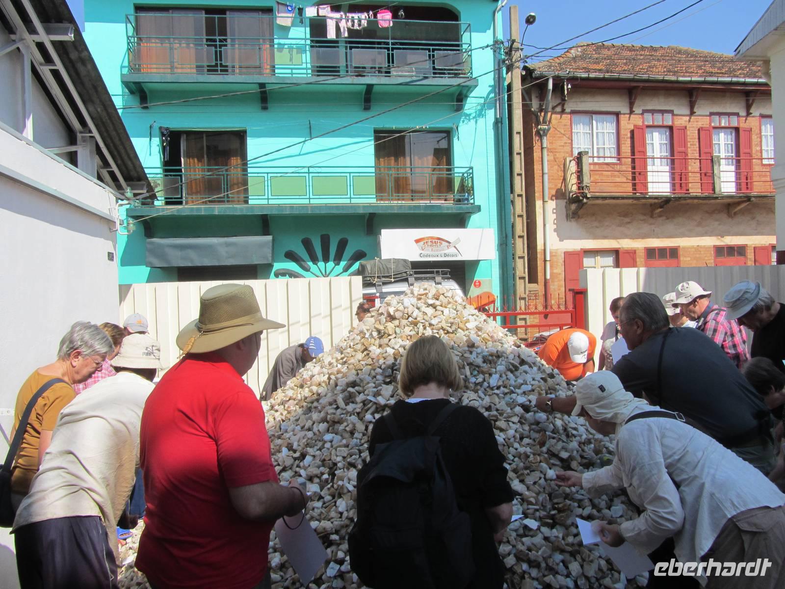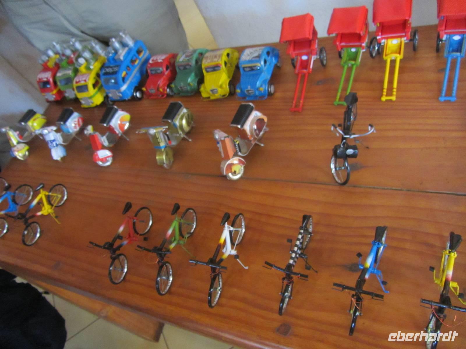 Der Morgen beginnt mit einer Pousse Pousse-Fahrt. Dieses Erlebnis ist ein Muss für jeden Gast in Antsirabe. Mit diesen von Hand gezogenen Rikschas unternehmen wir eine kleine Stadtrundfahrt der anderen Art. Auch wenn es für uns ungewöhnlich ist, sich von Menschenhand ziehen zu lassen, so ist das für die "Zieher" völlig normal und überlebensnotwendig. Jeden Tag muss für das Pousse Pousse eine Miete an den Besitzer gezahlt werden, somit ist jeder Fahrgast sehr willkommen.Auf unserer Rundfahrt sehen wir den Bahnhof, die Unabhängigkeitsstraße und enden an der Halbedelsteinschleiferei. Leider wird im Moment nicht produziert, aber schon die gewaltigen Exponate erstaunen uns. Aus einem großen Haufen Steine, kann sich jeder Gast einen ganz persönliches Mitbringsel aussuchen. Weiter geht es mit dem Bus zu einer Zebuhorn-Fabrik. In dem kleinen Familienunternehmen zeigt man uns, wie aus einem Zebuhorn kleine Kunstwerke, wie Schmuck-Löffel oder Tierfiguren hergestellt werden. Danach besuchen wir gleich nebenan eine Familie, die aus Dosen kleine Autos oder Fahrräder herstellen. Wir bewundern die handwerklichen Fähigkeiten und die Geduld, die man dafür braucht. Das eine oder andere Souvenir verschwindet in unseren Taschen.
