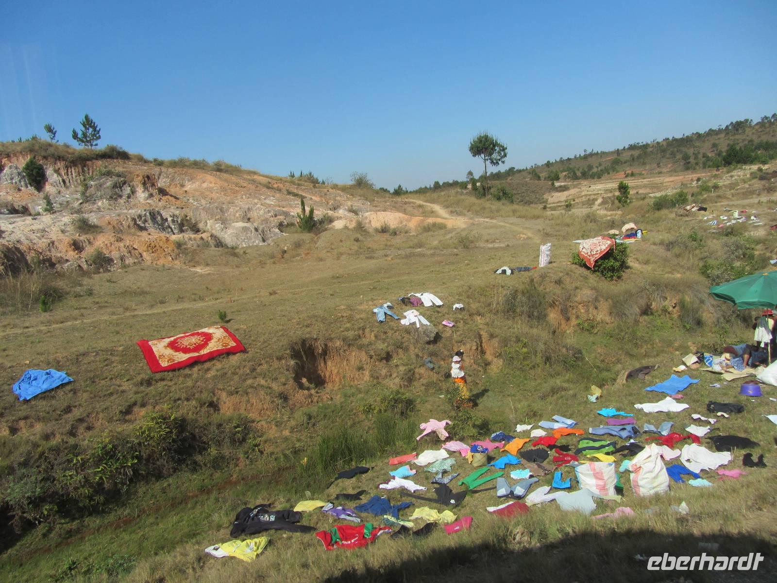 Heute führt uns unsere Reise nach Antsirabe. Weiter nach Ambositra passieren wir viele Reisfelder, beobachten Frauen beim Wäschewaschen am Fluss und sehen Familien, die ihre Produkte kilometerweit in den nächsten Ort bringen, um dies dort zu verkaufen. Um ihre Wäsche zu trocknen, legen viele Einheimische ihre Wäsche einfach auf die Felder und Wiesen. Auf der Weiterfahrt sind wir immer wieder schockiert über die Art und Weise, wie auf Madagaskar stetig die Natur zerstört wird. Die Waldrodung stellt mittlerweile ein großes ökologisches Problem dar. Wir sehen kilometerlange verkohlte Waldflächen. Jährlich schrumpfen die bewaldeten Flächen um 1%.