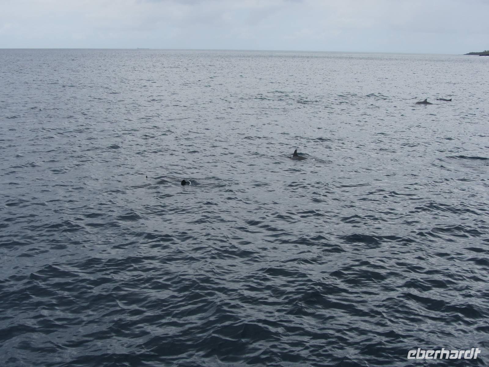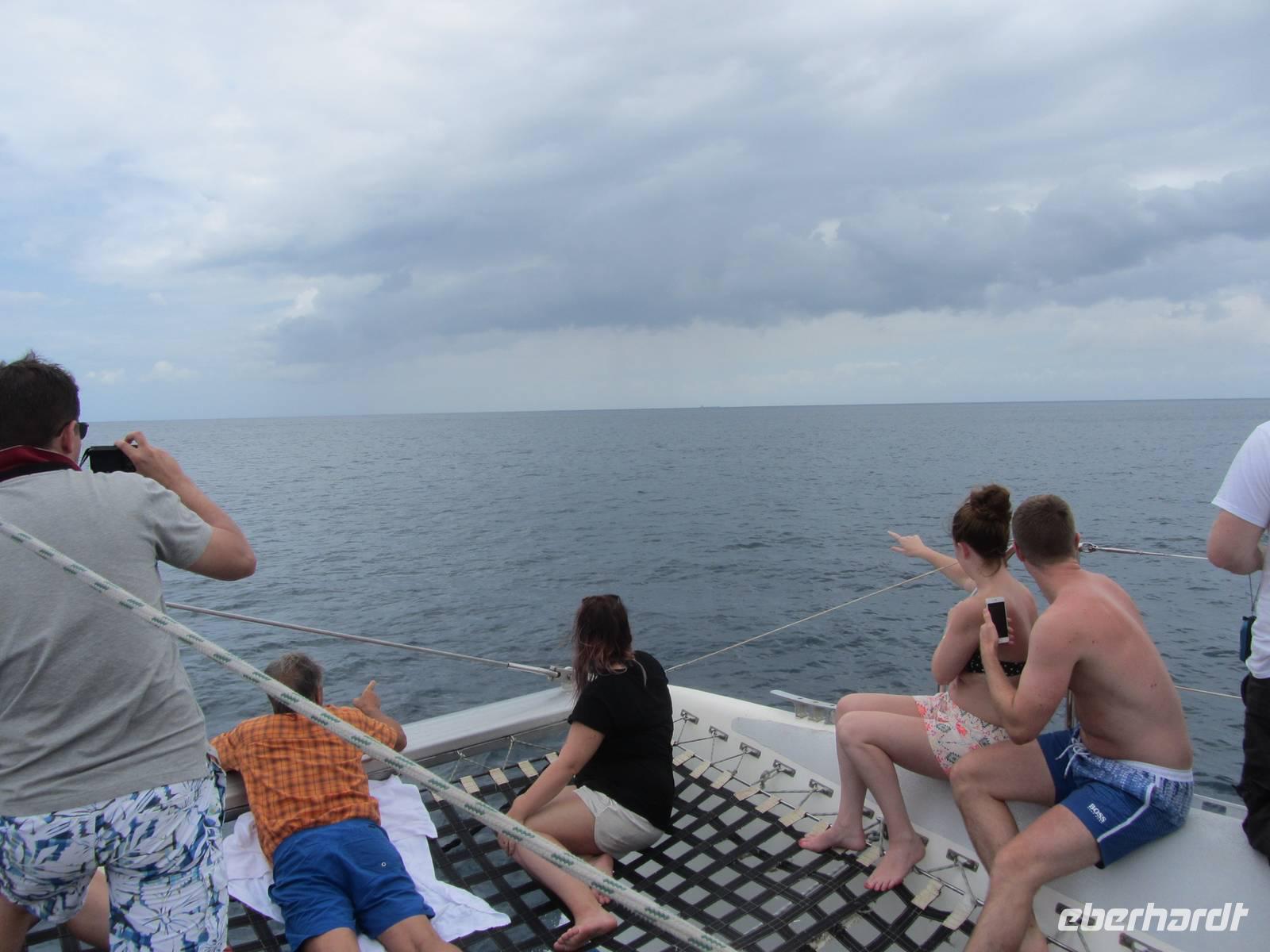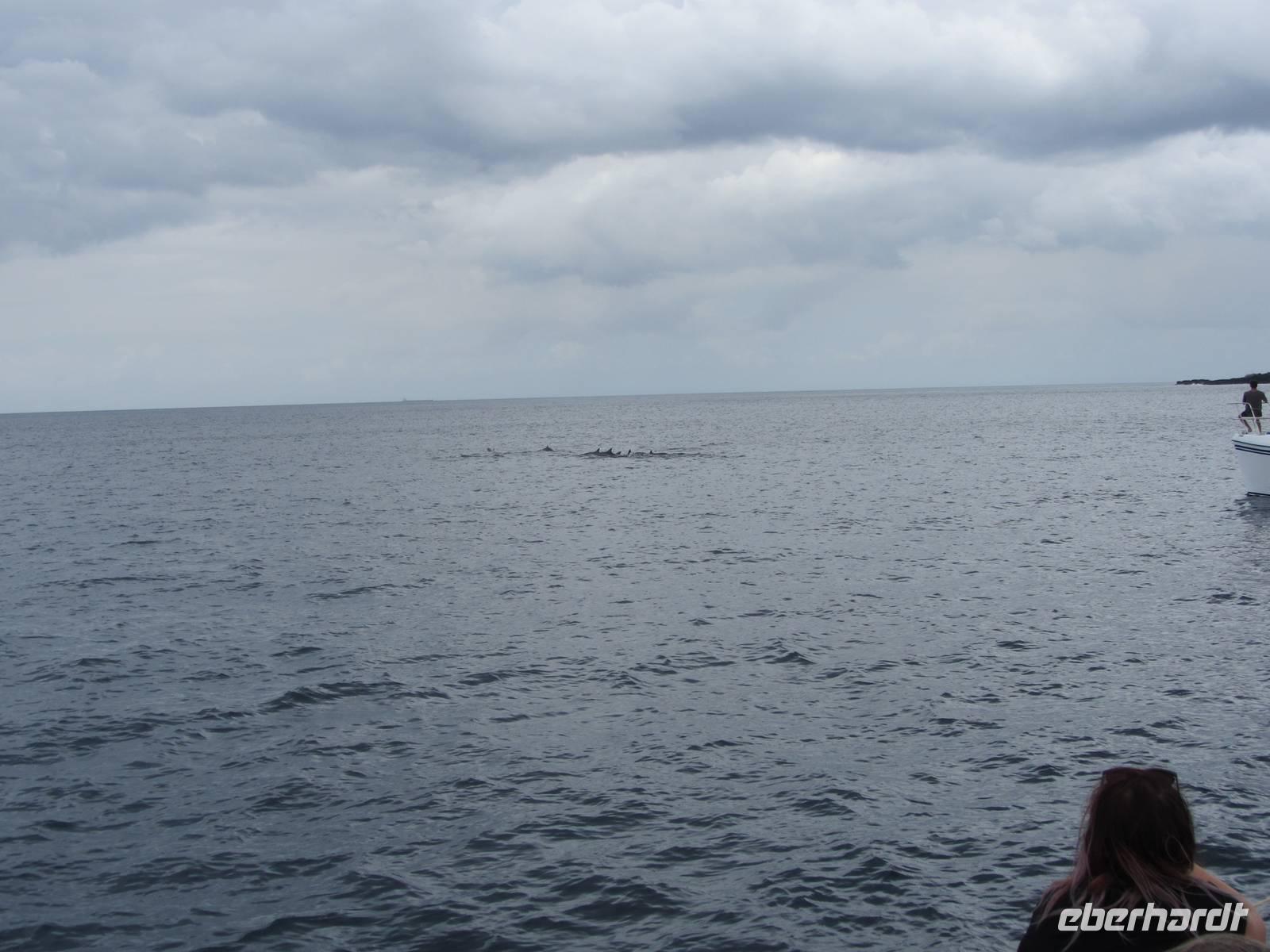 Ein weiterer Höhepunkt steht an - eine Katamaran-Tour! Ausgestattet mit Badesachen, Sonnenhut und Sonnencreme starten wir in dieses Abenteuer.Auf dem Boot finden sich etwas 30 Personen ein und so legen wir bei karibischer Musik und einer motivierten und lustigen Crew ab. Wir lassen die Küste hinter uns und schauen auf die imposante Bergkette von Mauritius. Es werden Cocktails serviert und es dauert nicht lange bis uns die ersten Delfine begrüßen. Später stoppen wir und alle Gäste haben die Möglichkeit, zu schwimmen oder zu schnorcheln. Inzwischen ist die Crew fleißig dabei das Mittagessen herzurichten. Auf dem Grill wir leckeres Hühnchenfleisch und Fisch gegrillt und mit Reis, Brot und Salat serviert. Nach dem Essen kann man mit dem Beiboot zu einer kleinen Rundfahrt aufbrechen, allerdings haben wir etwas Pech, denn es regnet und wir steigen aus dem kleinen Boot wieder aus. Der Himmel ist dick mit Wolken verhangen, was uns heute einen Sonnenbrand erspart. Am Nachmittag kehren wir begeistert von diesem tollen Ausflug ins Hotel zurück.