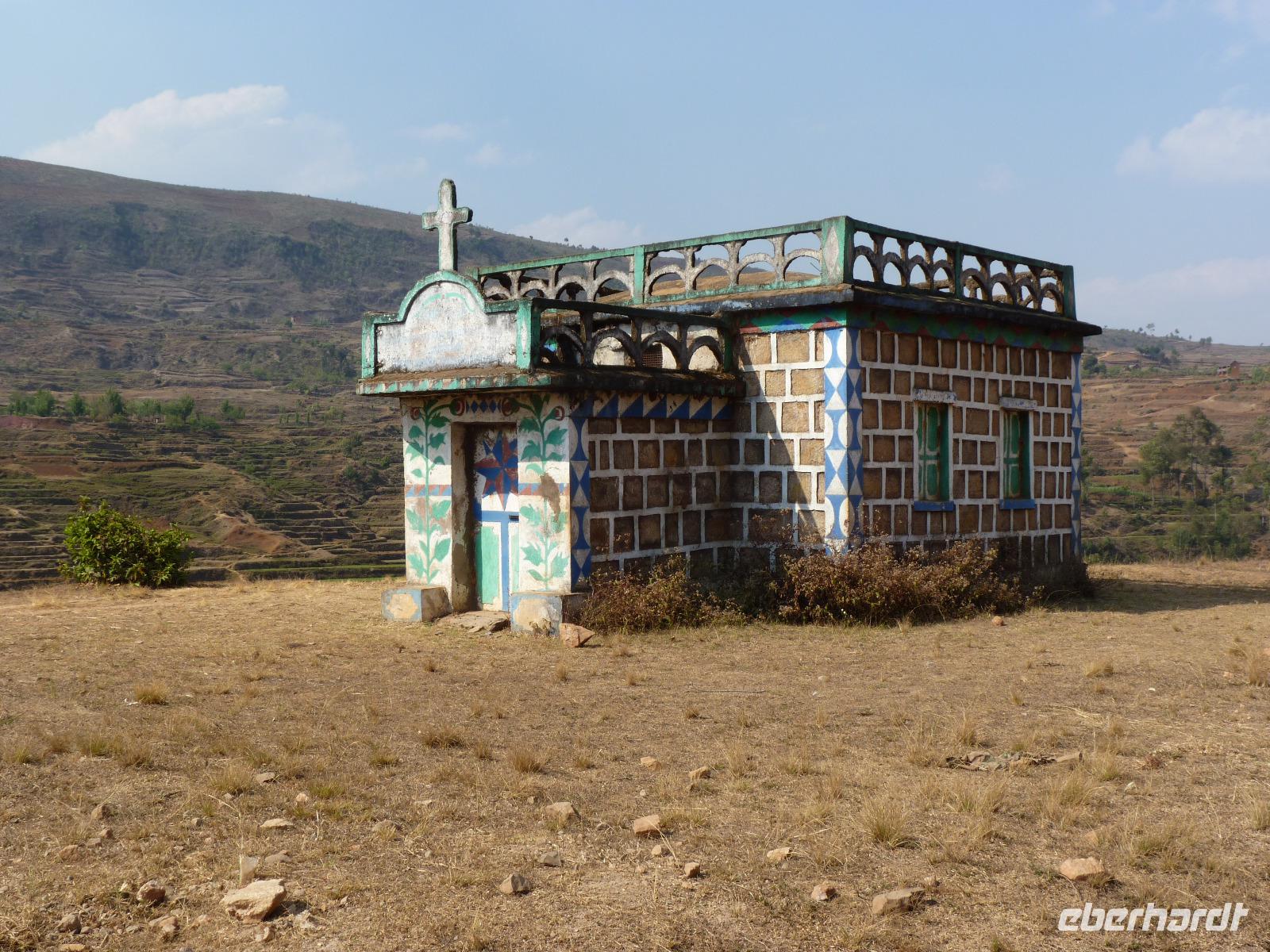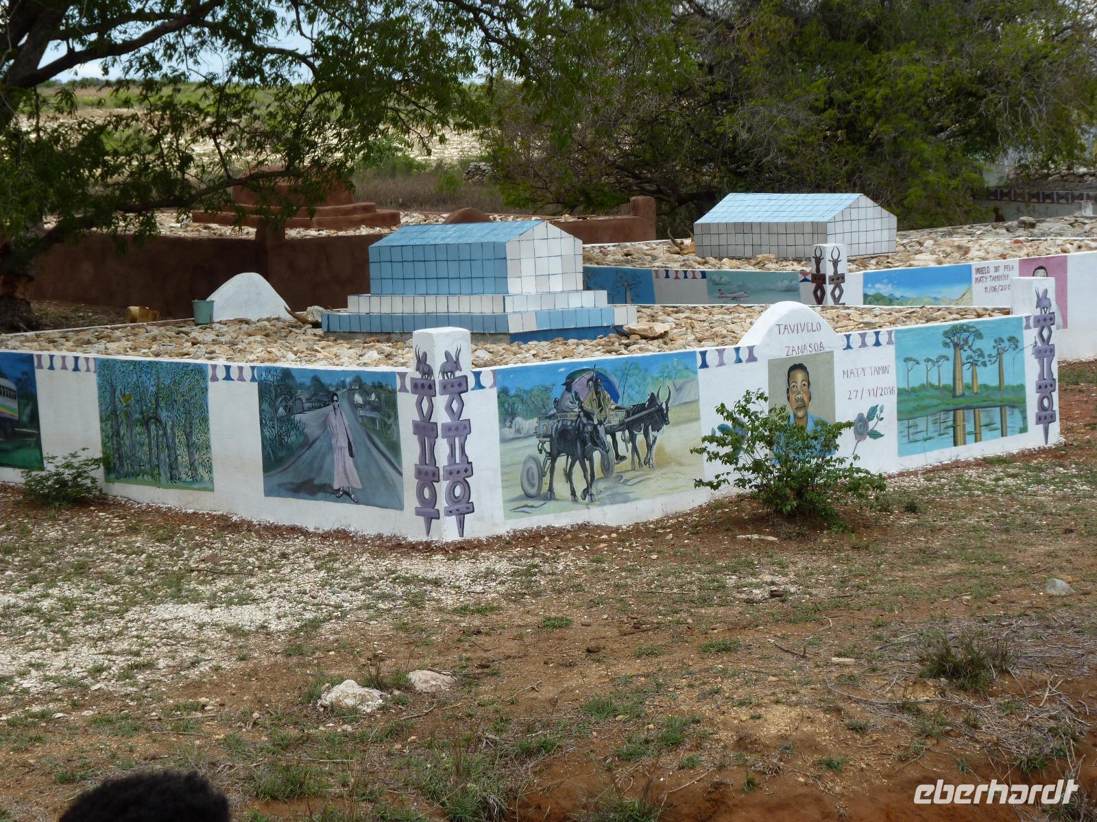 Weiter ging es Richtung Küste. Wir verließen das Gebiet des Stammes der Bara (Viehdiebe wie uns Seheno mitteilte) und kamen zu den Mahafaly. Erkennbar schon allein an den Grabstätten, die sich von allen unterwegs gesehenen deutlich unterschieden. Hier waren es quadratische Bauwerke mit bunt bemalten weißen Wänden, auf denen wohl Ereignisse aus dem Leben des Toten aufgemalt waren.