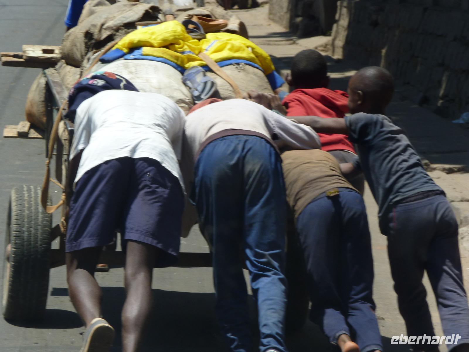 Nach dem Mittag ging unsere Fahrt in den Süden mit dem täglichen Märchen weiter, welches uns Seheno eines pro Tag erzählte. War es anfangs noch hügelig, so wurde es jetzt zunehmend flach, dekorativ eingerahmt von Bergketten. Um sich die Beine zu vertreten, liefen wir zwischendurch wieder mal 500m die Straße entlang. Wo auch immer wir auftauchten, wurde uns zugewunken und freundlich gegrüßt.