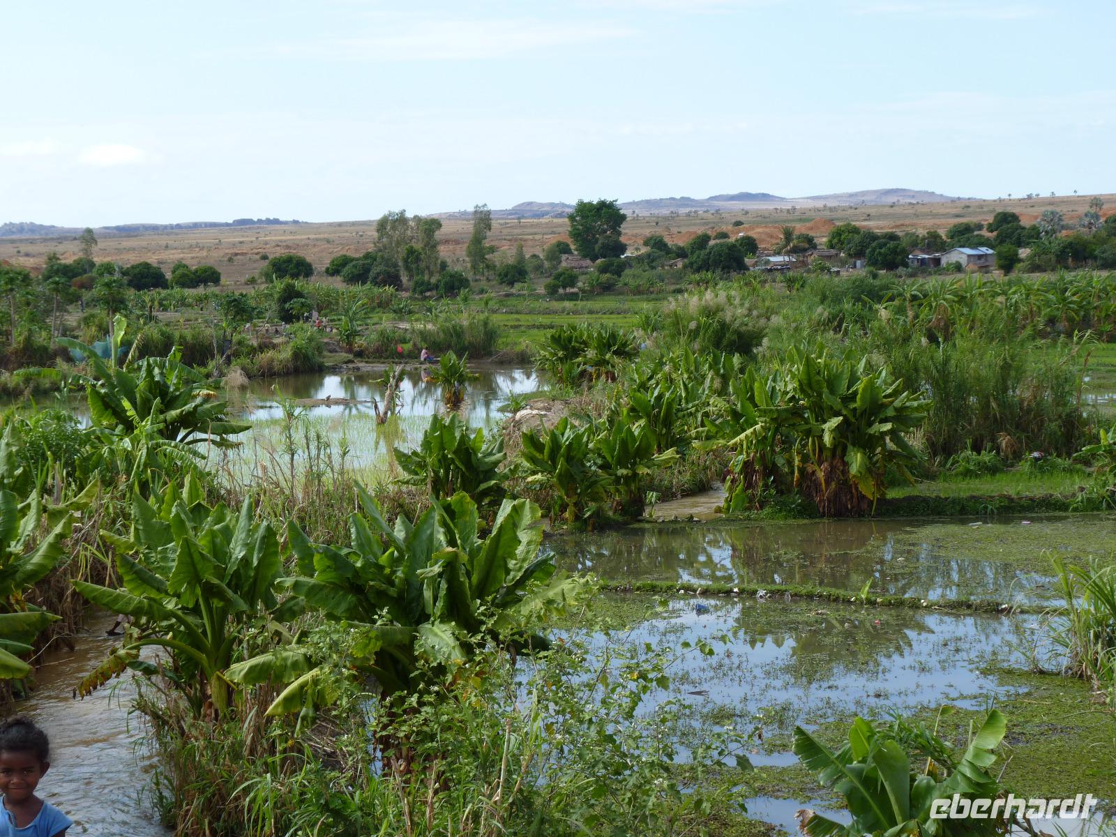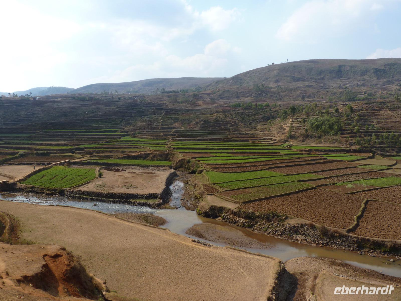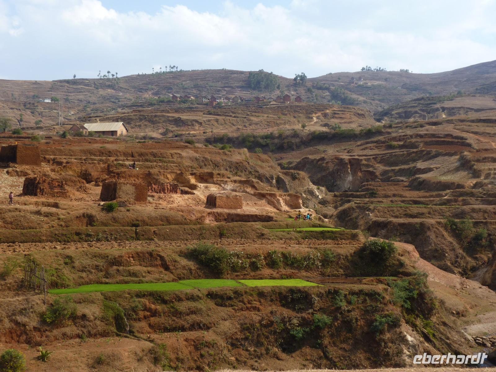 Bereits um 07:00 Uhr trafen wir uns wieder zum gemeinsamen Frühstück, den gegen 08:00 Uhr wollten wir mit unserer Tour in Richtung Süden starten. Bereits nach wenigen Kilometern machten wir mit Seheno einen Spaziergang entlang der Hauptstraße und konnten da einen ersten Eindruck von den Arbeits- und Lebensumständen der Hauptstädter machen. Wir tauchten ein in eine andere Welt, hatte doch das, was wir hier schon sahen, so gar nichts mit dem Leben in Deutschland gemein. Auf unserer Fahrt zu unserem ersten Tagesziel, der Stadt Antsirabe, erfuhren wir von Seheno bereits sehr viel über das Madagaskar und deren Bewohner. Bei unserer Mittagspause in Ambatolampy machten die Meisten unserer Gruppe die erste Bekanntschaft mit Zebufleisch. Für uns mit umgerechnet 4 EUR ein sehr preiswertes Mittagessen, ist es für die Einheimischen mit einem durchschnittlichen Monatseinkommen von 100 EUR schon ein sehr teures Vergnügen. Schon am heutigen Tag sahen wir während unserer Fahrt sehr viele Reisefelder. Von Seheno erfuhren wir, das Reis die wichtigste Nahrungsgrundlage der Madegassen bildet und diese mit einem Pro-Kopf-Verbrauch von 120 Kg pro Person und Jahr einen höheren Verbrauch als die Chinesen haben. Die vielen Reisefelder, in den hügeligen Gegenden oft auch in Terassen angelegt, sahen schon schön aus und gaben ein tolles Fotomotiv ab.