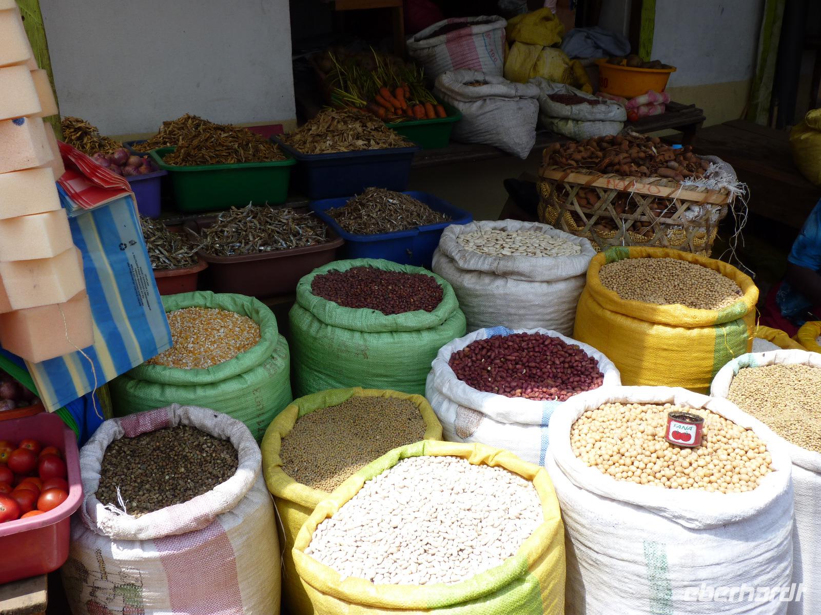 Auf unserem Weg zur Vanilleplantage sind wir durch eine sehr einfache Siedlung gekommen. Hier konnte man wirklich sehen, dass Madagaskar ein sehr armes Land ist. In den Dörfern noch viel extremer als in den Städten. Ich selbst hatte aber immer das Gefühl, dass die Menschen trotz ihrer Armut nicht unbedingt unglücklich sind. Sie begegneten uns immer mit größer Freundlichkeit und wenn wir dann noch mit dem madegassischen "Salama" für Hallo / Guten Tag grüßte, strahlten ihre Augen noch mehr. Später erfuhren wir von Seheno, dass Jeder, der über ein Auto, einen Fernseher, Kühlschrank und Geschirrspüler verfügt, bei den Madegassen als reich gilt. Für uns im Grunde selbstverständlich, so etwas zu besitzen, ist es für diesen Teil der Erde purer Luxus.