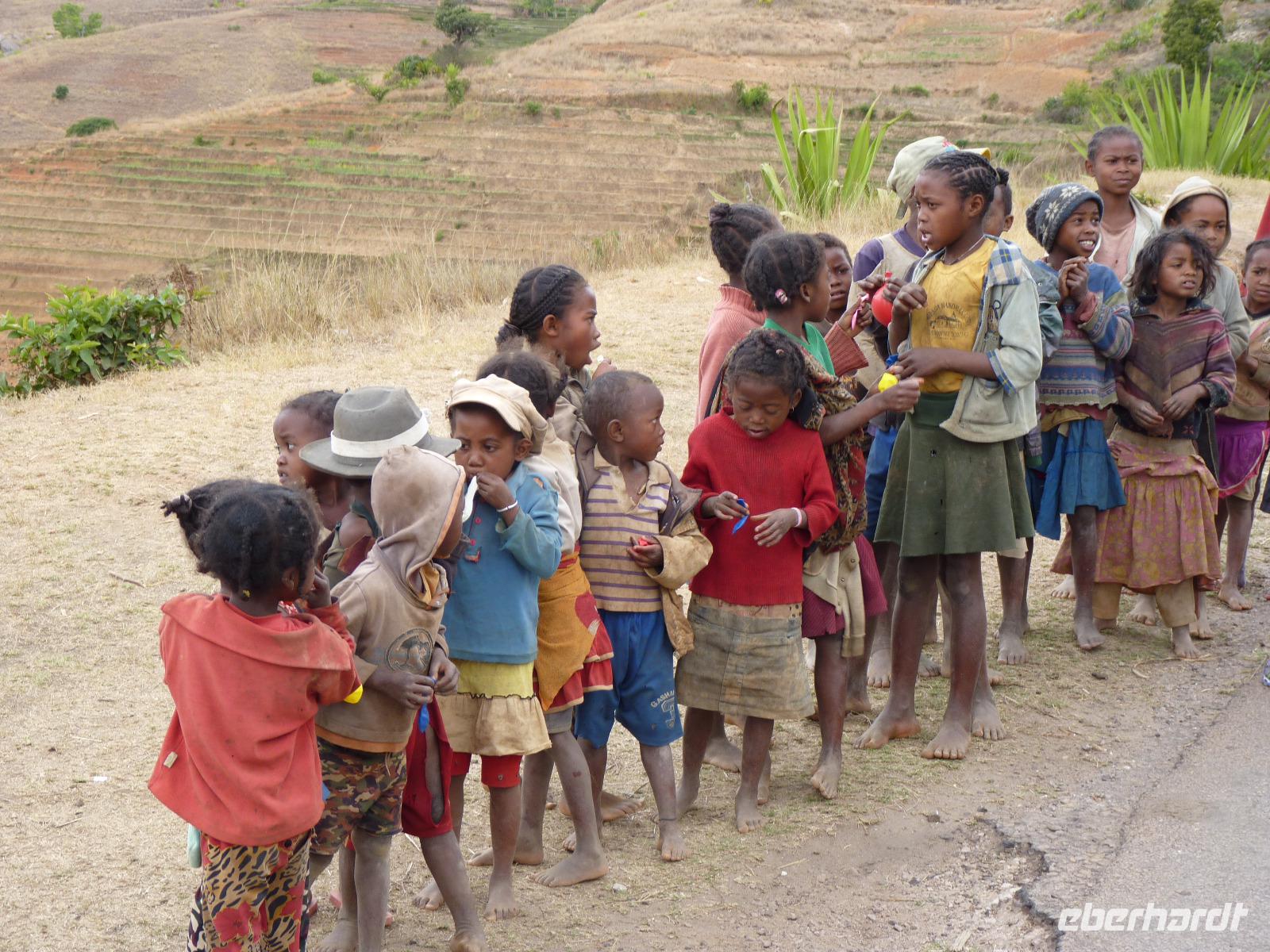 An diesem Tag stand uns eine lange Fahrt bevor. Nun hören sich 270 km nicht gerade nach viel an, aber bei der hügeligen und teilweise bergigen Landschaft mit den vielen engen Kurven und den sehr unterschiedlichen Straßenverhältnissen ist das schon eine Tagesreise.Unterwegs nutzten wir natürlich die Möglichkeiten, an interessanten Stellen eine Stop einzulegen bzw. auch mal ein paar hundert Meter entlang der Straße zu laufen. Jedesmal, wenn mir stoppten, waren wir sofort von neugierigen Kindern umringt, die sich auf Anweisung von Seheno ganz brav anstellten, wenn Süsses vetreilt wurde und die sich dafür dann gemeinsam und lauthals bedankten. In Madagaskar kann man Kinder, vor allem auf dem Land, noch mit sehr wenig glücklich machen.