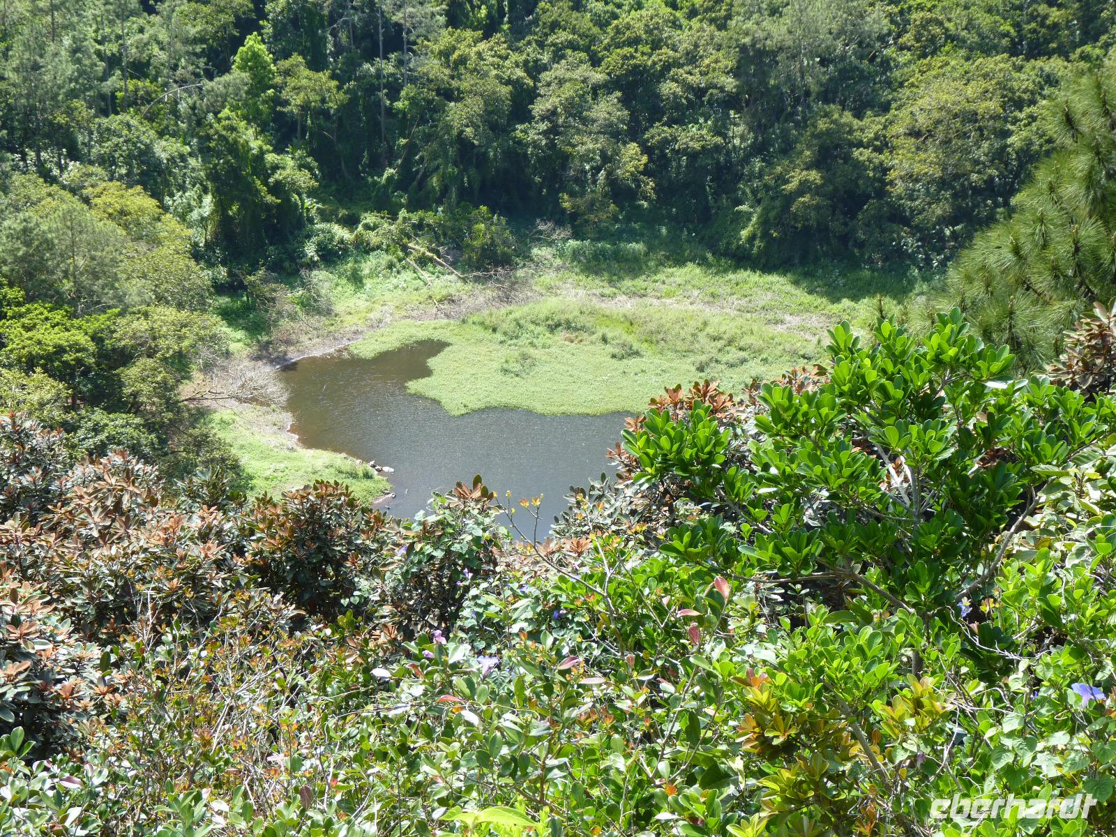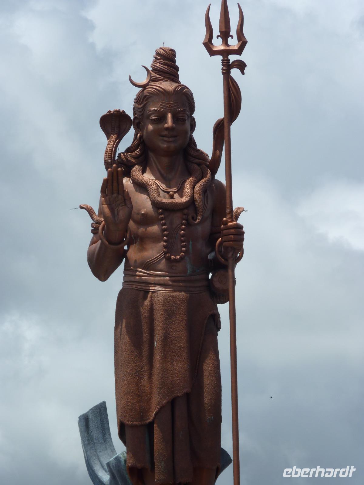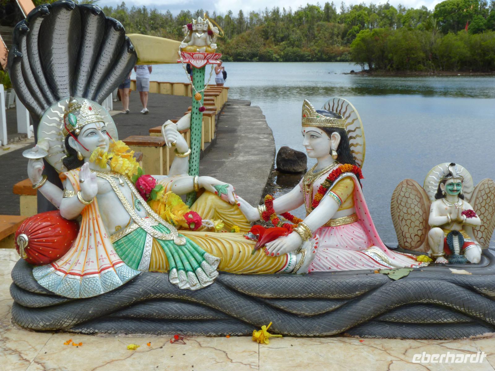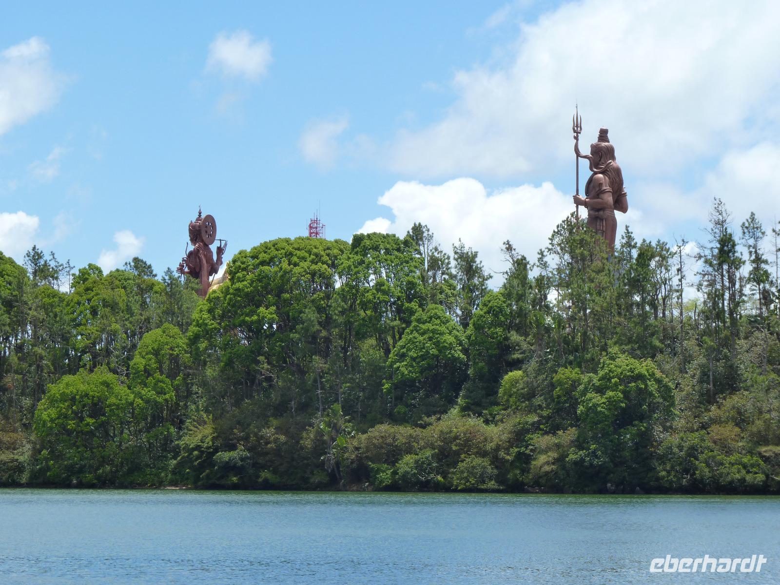 Im Anschluss fuhren wir zum Grand Bassin, dem größten hinduistischen Heiligtum auf der Insel. Seitdem 1972 ein indischer Priester heiliges Wasser aus dem Ganges nach Mauritius brachte und in diesen See kippte, ist dieser Pilgerstätte für alle Hindus dieser Insel. Oberhalb des Sees wurden zwei 33m hohe Statuen des Gottes Shiwa und der Göttin Durga erriechtet.