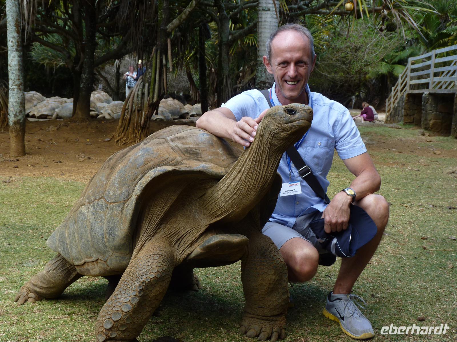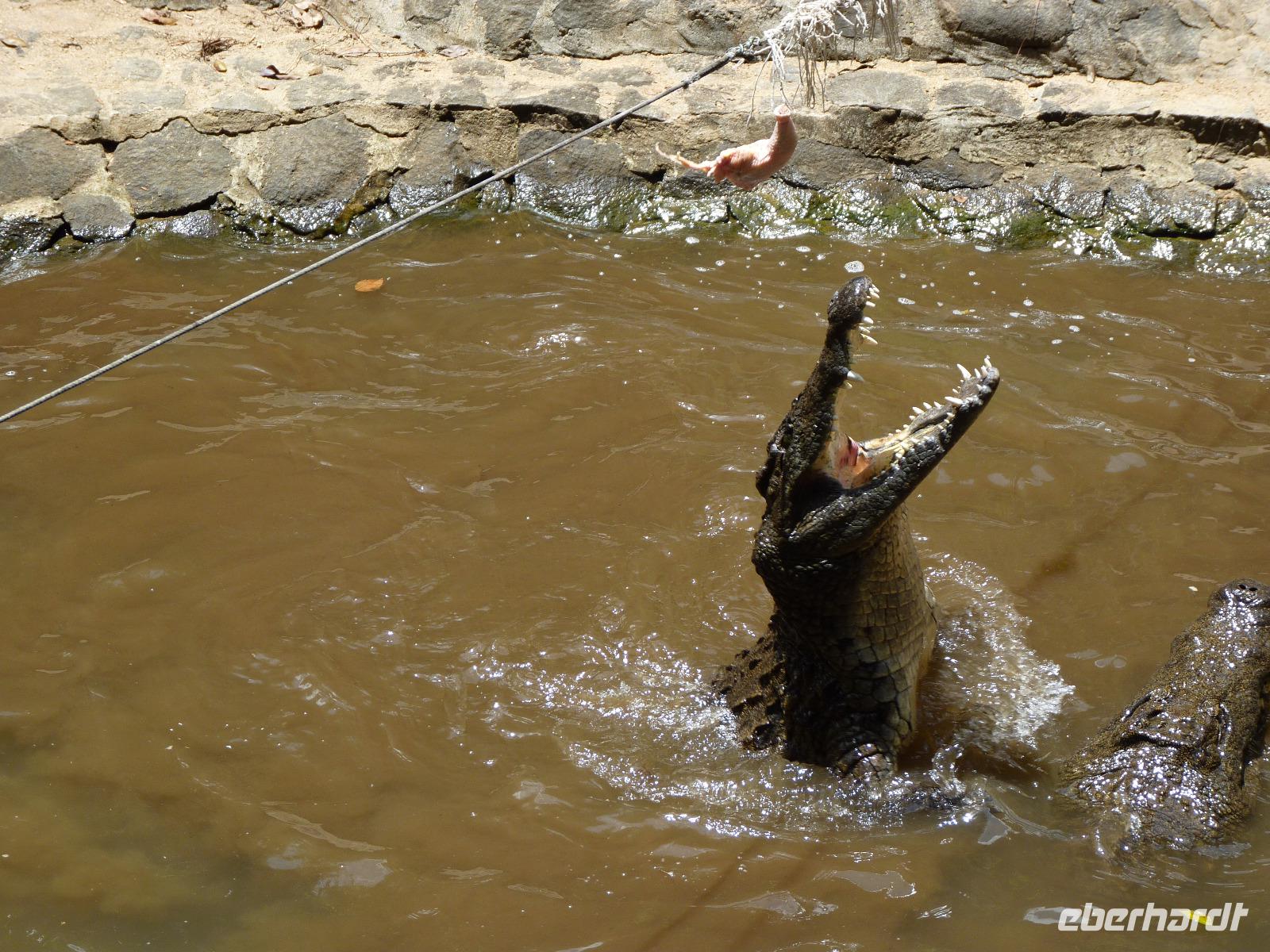 Der Höhepunkt des Tages folgte mit dem Besuch der La Vanille-Reserve des Mascareignes-Parkes. Hier ging es nicht um Vanille, sondern einerseits um das Zuhause von über 2000 Nilkrokodilen und andererseits um die weltgrößte Brutstätte für Aldabra-Schildkröten. Diese Riesenschildkröten konnten wir hautnah erleben und mussten feststellen, das auch diese Tiere für Streicheleinheiten scheinbar sehr empfänglich sind. Der Park beherbergt zudem eine Insektensammlung mit über 23.000 Exemplaren. Schmetterlinge, Käfer und viele andere Insekten aus aller Welt sind hier zu besichtigen. Natürlich sind auch Lemuren, Flughunde und Fische Bestandteile dieser Farm. Eine besondere Attraktion war die Fütterung der Krokodile, die immer zu bestimmten Zeiten und als Highlight für die Touristen vorgenommen wird.