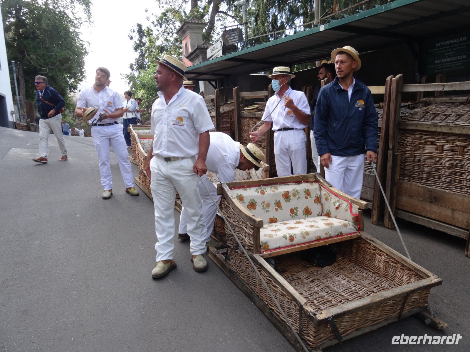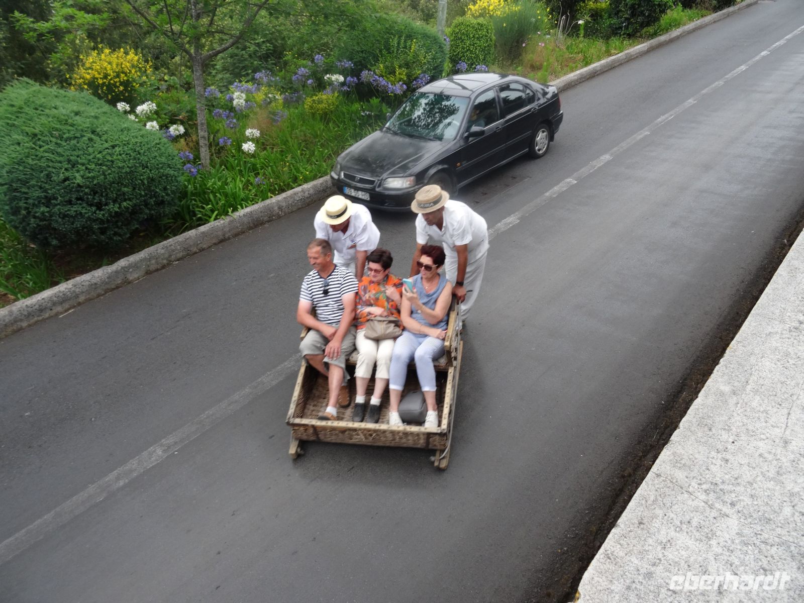 Normalerweise kann man sich den ganzen Tag in diesem einmaligen botanischen Garten aufhalten. Aber wie heißt es bekanntlich: "Wir wären ja so gern noch geblieben", doch wir liefen weiter zum Startplatz der zwei Kilometer langen Abfahrt mit dem Korbschlitten von Monte nach Funchal. Mit Hilfe der kräftigen Korbschlittenlenker wollten wir nun als Abschluss gleich bis zu unserem Hotel zurückfahren, welches sich am Ende der Abfahrt befindet. Doch angesichts der langen Warteschlange entschieden wir uns nun doch für den Bus und verschoben unser Vorhaben auf den 6. Reisetag . Bekanntlich ist aufgeschoben nicht gleich aufgehoben.