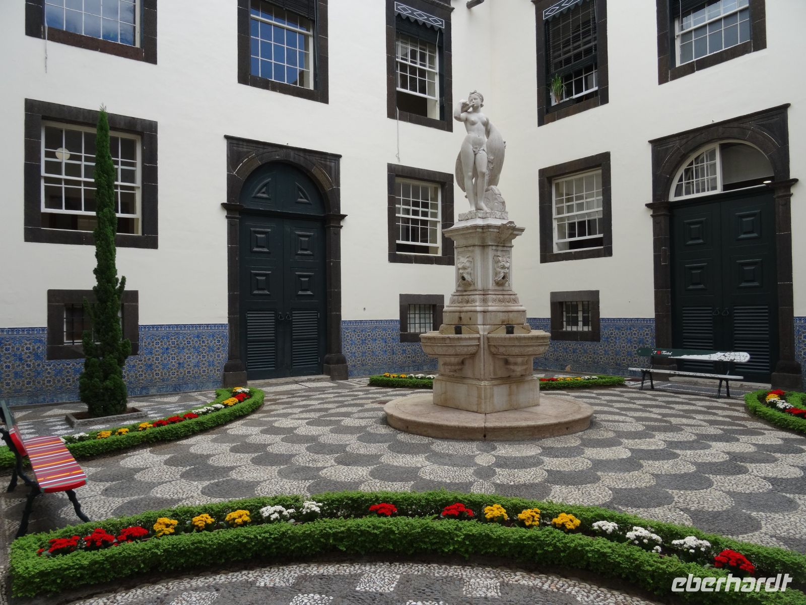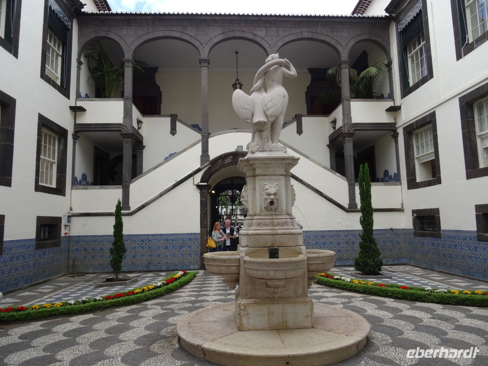 Unmittelbar neben dem Kiche steht das Rathaus, welches die Stadt im Jahre 1881 von einem belgischen Zuckerrohrbaron erwarb. Durch die Vorhalle mit den beidseitigen Treppenaufgängen in zauberhaft verzierten blau-weißen Azulejos gelangten wir in den Innenhof mit einem Brunnen. Dieser befand sich ursprünglich am Standort der heutigen Markthalle. Auf ihm ist Zeus in Schwanengestalt zusehen, wie er Leda bezirzt. Wieder ein Fall für unsere Sinne...