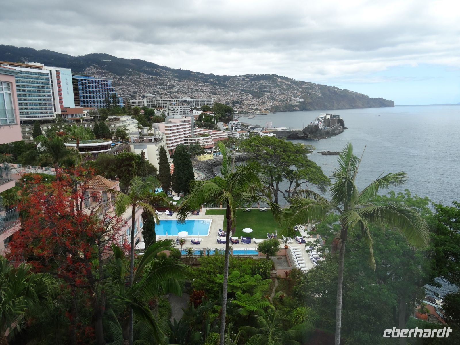 Am Cristiano Ronaldo Flughafen Funchal -geografisch richtig heißt es eigentlich Santa Cruz- erwartete uns bereits der leiter der örtlichen Agentur. Mit einem Kleinbus fuhren wir dann zum Hotel "Quinta Mirabela" in Monte. Auf einem Hügel gelegen, hatten wir von hier einen bezaubernden Blick auf die Hauptstadt Funchal und deren Bucht. Genau die richtige Einstimmung auf die schöne Zeit, welche nun folgen sollte. Dazu trugen auch die Begrüßung mit einem Glas Madeira Wein sowie unser erstes landestypische Essen im Hotelrestaurant bei.