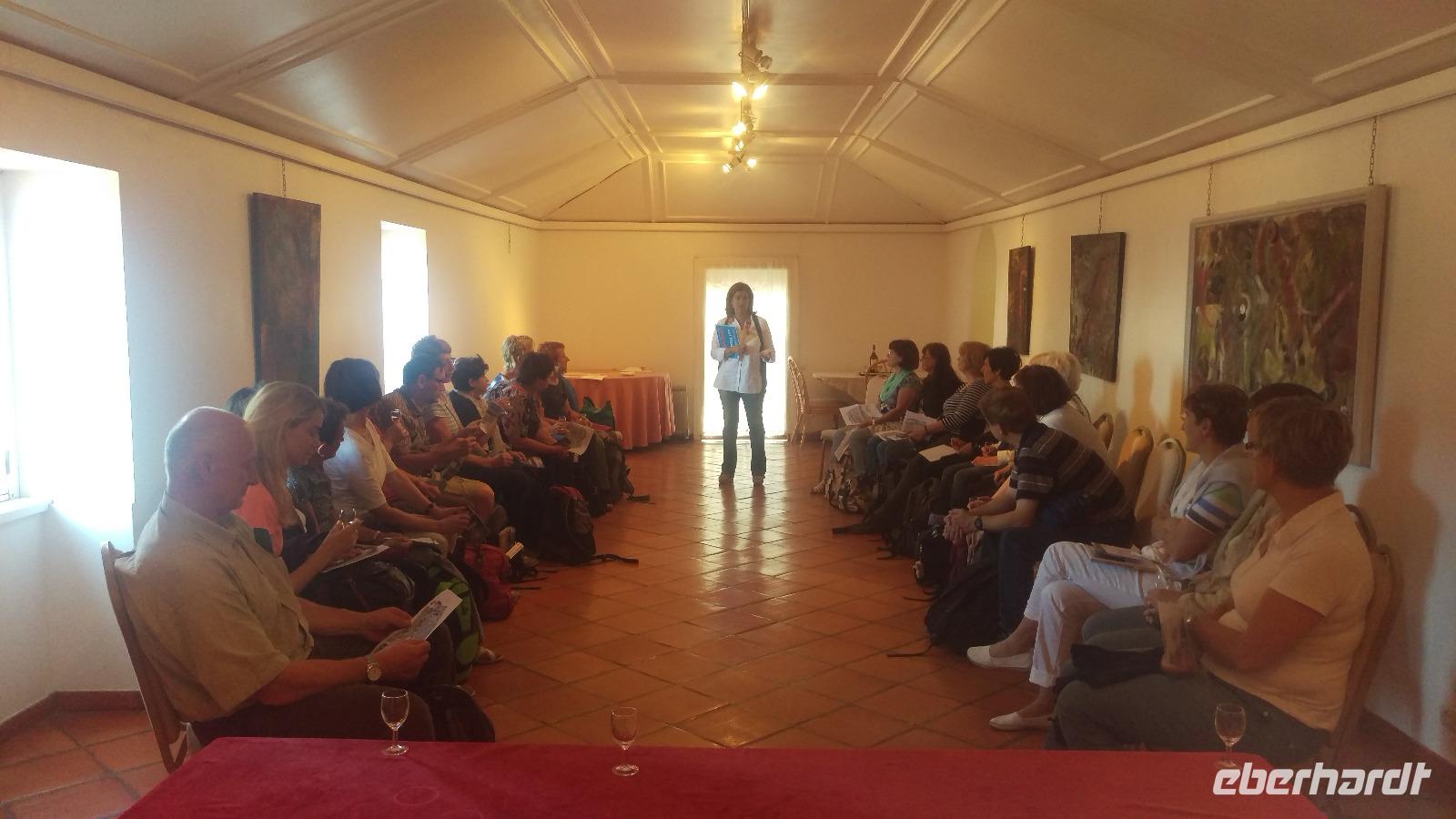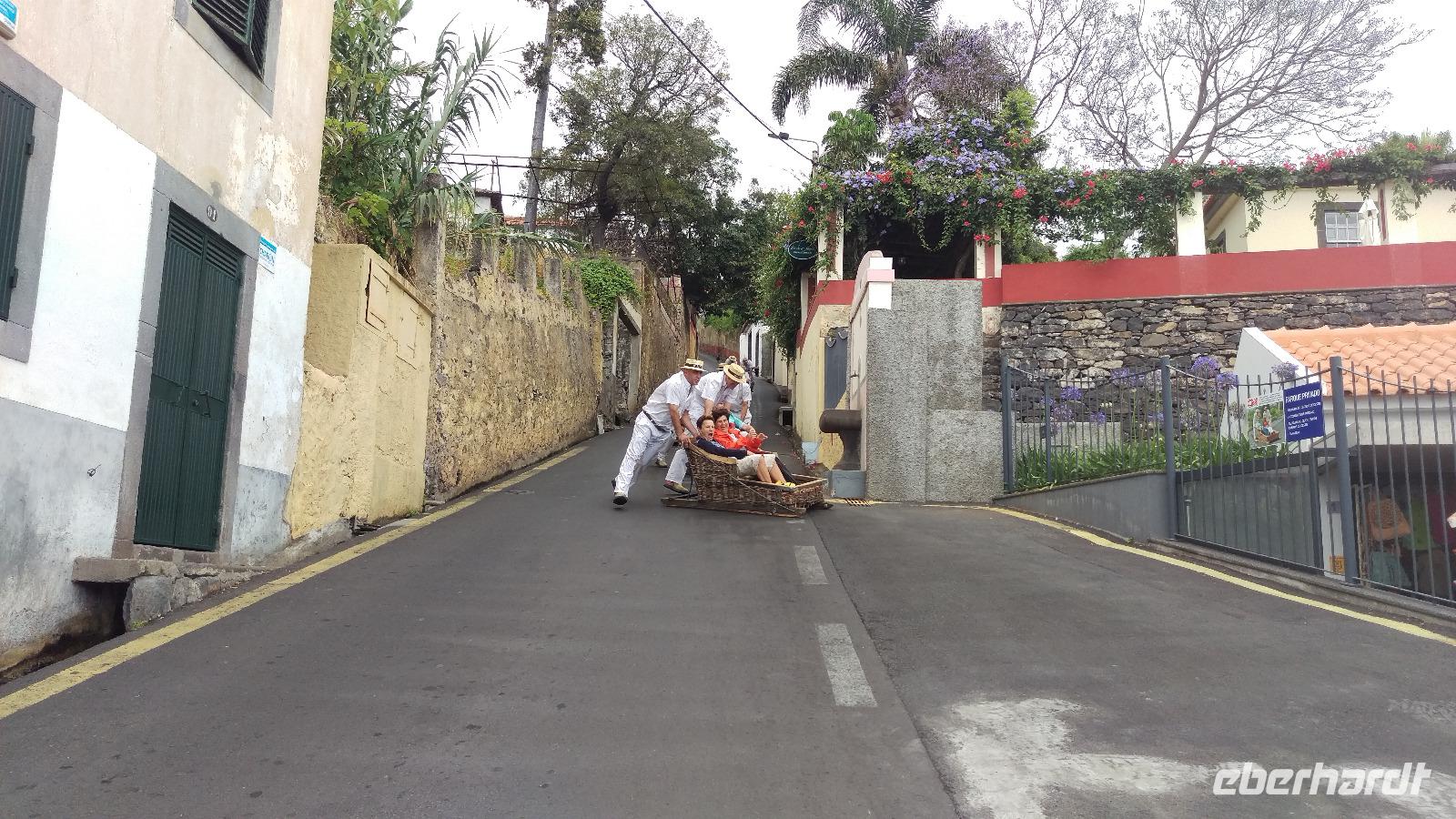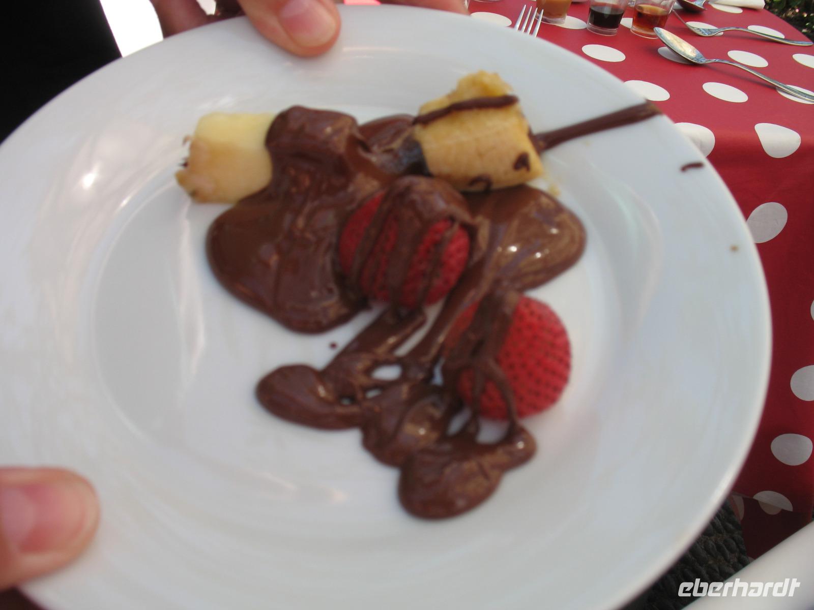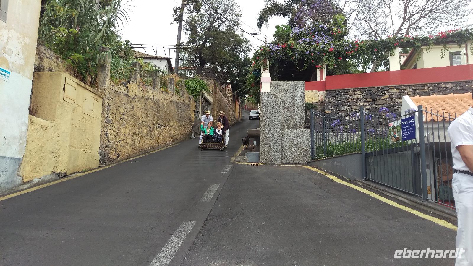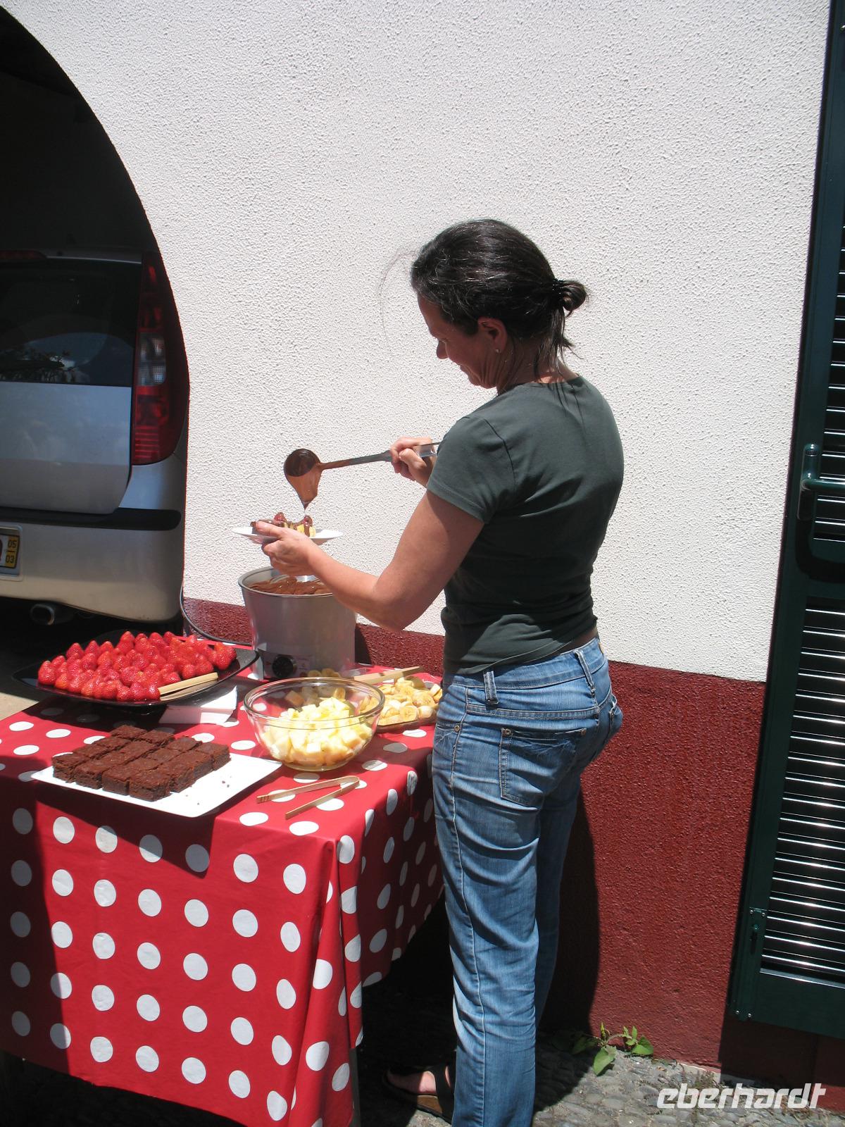 Unsere spannenden Programmpunkte am vierten Tag in Madeira ist die tolle Wanderung Curral dos Romeiros sowie der Wallfahrtsort Monte, die Aussicht auf dem Eira do Serrado und dem Pico dos Barcelos als auch die Schokoladen-Verkostung bei "Chocolate no jardim joo" von Maria João Barros. Zuerst unternehmen wir eine tolle Wanderung Curral dos Romeiros bei traumhaften Wetter. Anschließend führt uns der Weg weiter nach Monte mit seiner hübschen Barockkirche Nossa Senhora do Monte und dem abenteuerlichen Erlebnis Korbschlittenfahrt, an der auch viele Gäste teilnehmen. Das Örtchen Monte liegt rund 600 bis 800 Meter hoch und ist besonders für die unterhalb der Kirche beginnende Korbschlittenfahrt berühmt. Silvia erzählt uns die Geschichte rund um den letzten Kaisers Österreichs Karl von Habsburg, seine Zeit im Exil auf der Insel Madeira und die besondere Verbindung zu Monte. Dann teilt sich unsere Gruppe, einige Gäste suchen das Abenteuer und fahren zu zweit im Korbschlitten rund zehn Minuten auf einer zwei Kilometer langen asphaltierten Straße bergab, ein wirkliches Spektakel :-) Die anderen Reisegäste lassen es eher ruhig angehen und beobachten diese typische Unterhaltung Madeiras. Gegen 11.45 Uhr treffen sich beide Gruppen wieder und wir fahren gemeinsam zum Miradouro da Eira do Serrado, wo wir auch unserer Mittagspause verbringen. Das Tal der Nonnen ist ein kleines Dorf im Herzen der Insel. Seinen Namen erhielt es, da die Nonnen Schutz vor den auf Madeira häufig überfallenden Piraten im 16. Jahrhundert suchten. Wir genießen die großartige Aussicht auf die Berge und das abgeschiedene Dorf Curral das Freiras (Tal der Nonnen), gönnen uns einen kleinen Imbiss oder wieder ein leckeres Menü. Als Empfehlung von Silvia probieren einige Gäste auch den nach dem Ort benannten Nonneneintopf (Kastaniensuppe). Dann unternehmen wir einen kleinen Spaziergang zum Miradouro da Eira do Serrado. Die Aussicht und das sonnige Wetter laden wirklich zum Verweilen und Entspannen ein :-) Danach schauen sich einige Gäste noch im Souvenirshop um. In Anschluss folgt ein kurzer Foto-Stopp am Miradouro Pico dos Barcelos auf einer Höhe von 335 Metern und gegen 14.50 Uhr sind wir bei Maria João Barros zur Schokoladen-Verkostung bei "Chocolate no jardim joo". Wir nehmen auf der Terrasse einen Sitzplatz ein. Maria spricht erst auf Englisch und wird von Silvia und der Reisebegleitung übersetzt. Wir erhalten zuerst drei Schnapsbecher mit einem Becher Madeira-Wein, einem Becher Rum 50 Prozent und drittens einen Schnaps aus getrockneten Früchten. Dazu werden uns sechs verschiedene Sorten Schokolade in folgender Reihenfolge gereicht: 1. Banane, 2. Orange, 3. Fenchel, 4. Zitrone, 5. Roter Pfeffer und 6. Limette. Zu einem Schnaps wird uns von Maria empfohlen, immer zwei Stück Schokolade nacheinander auf der Zunge zergehen lassen und dann einen Schluck trinken. Danach erhalten wir einen lauwarmen leckeren Tee mit frischer Pfefferminze und ein Schokoladenfondue mit frischen Früchten und Schokoladenkuchen. Alles ist wirklich sehr herzlich zubereitet und wir sitzen gemütlich und entspannend auf der schönen Terrasse. Kleine Schokoladentafeln werden auch zum Verkauf angeboten, weitere Varianten sind unter anderem Zimt, Ingwer und tropische Kirsche. Gegen 16.30 Uhr fahren wir wieder zum Hotel zurück. Die freie Zeit bis zum Abendessen nutzen wir zum Schreiben von Postkarten oder einfach nur zum Ausruhen. Um 18.20 Uhr treffen wir uns im Eingangsbereich der Hotelanlage, um gemeinsam zum Abendessen ins Restaurant "A Lareira" in Caniço nur fünf Gehminuten entfernt zu gehen. Wir essen heute à la carte und auch dieses Mal mundet es uns sehr :-) Den Abend lassen wir gemeinsam auf der Hotelterrasse mit Blick auf das Meer ausklingen. Heute ist bereits das "Bergfest" unserer großartigen Reise erreicht :-( :-) Auf diesen Tag stoßen wir mit Madeira-Wein und süßen Honigkuchen "Bolo de Mel da Madeira" an.