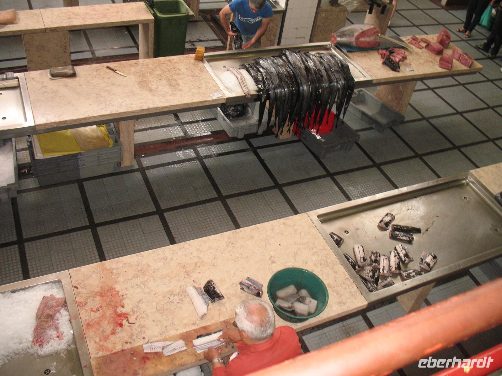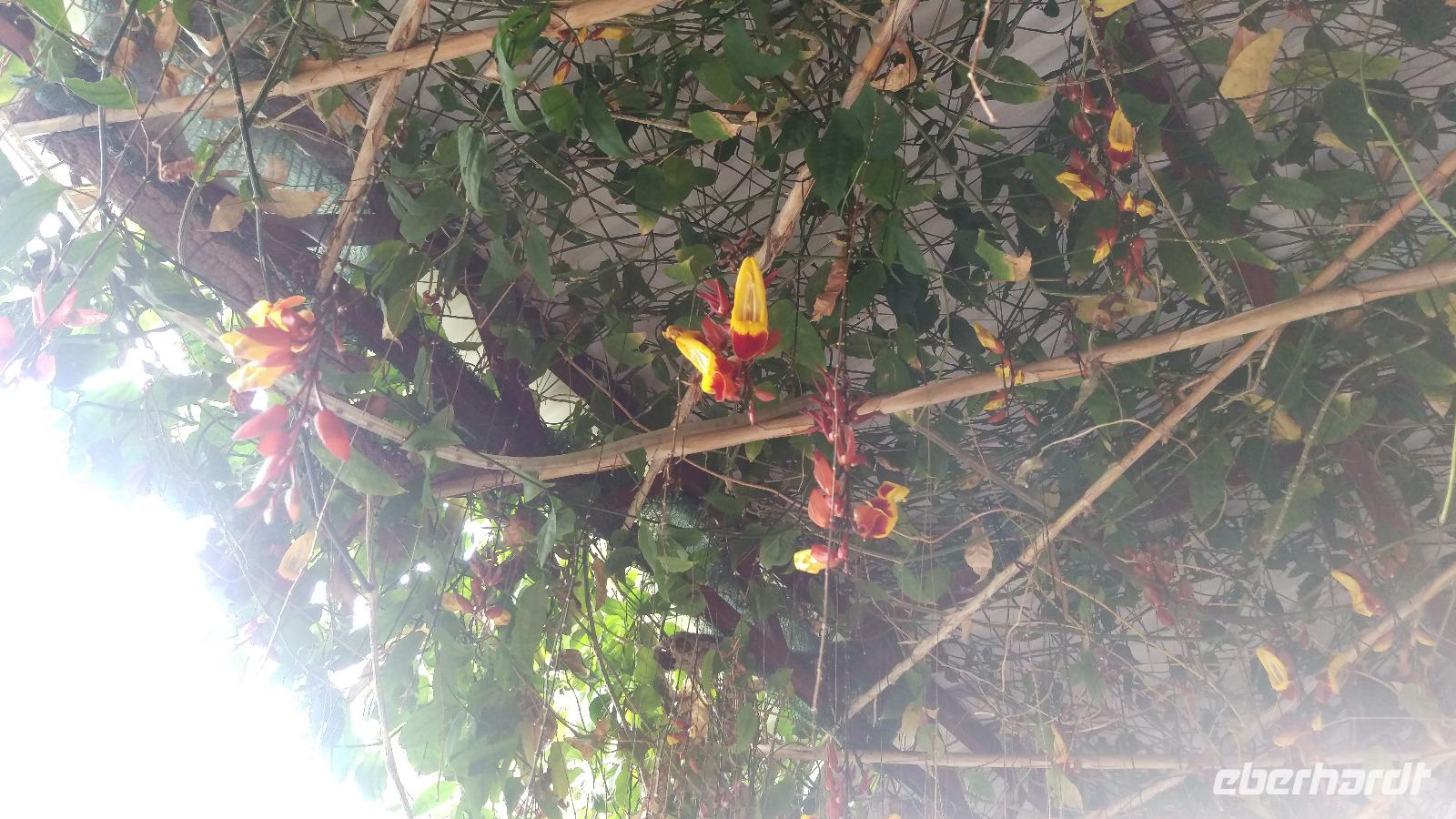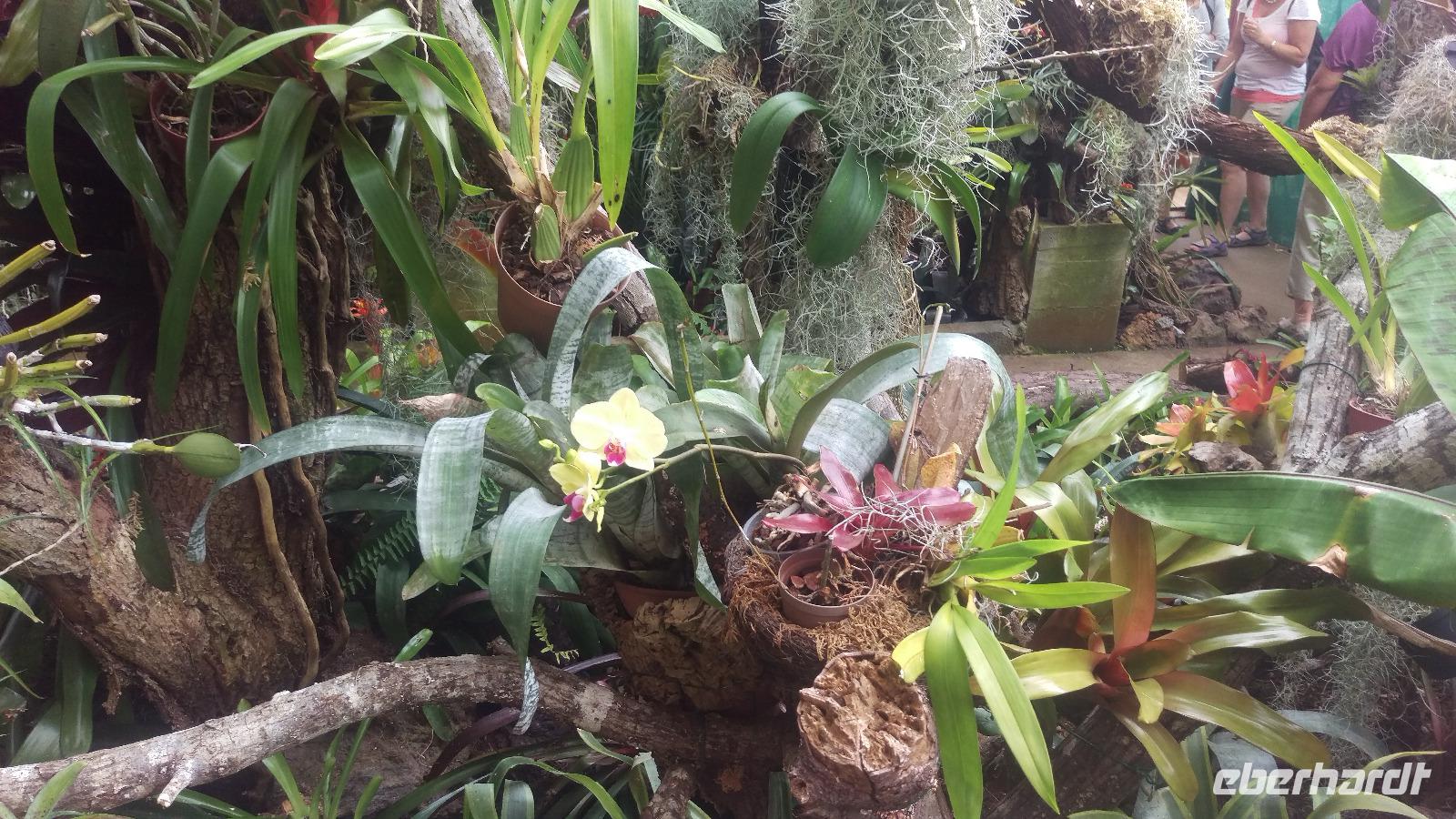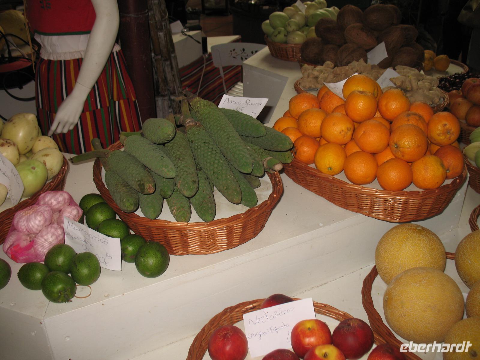 Nach einem ausgiebigen Frühstück starten wir zur nächsten Etappe unserer aufregenden Reise - Die "Mercado dos Lavradores", also die Markthalle und der Bauernmarkt in Funchal. Während der Fahrt erhalten wir von Silvia sehr viele Informationen zu Madeira. Interessant ist vielleicht auch, dass Kaiserin Sissi Madeira oftmals besucht und im vom Schotten William Reid 1894 errichteten pompösen Hotel übernachtet hatte. Im Casino-Park befindet sich ein Denkmal ihr zu Ehren. Zuerst reisen wir nach Funchal zum schönem Botanischen Garten "Jardim Botânico". Wir erfahren weitere Details und Neuigkeiten zu den unterschiedlichsten Pflanzen und Bäumen durch unsere fachkundige Reiseleiterin Silvia. Zu den typischen Pflanzen der Insel zählen die Strelitzia "Strelitziaceae", auch als Paradiesvogelblume bekannt, und natürlich der als "Stolz von Madeira" bekannte Madeira-Natternkopf "Echium candicans". Der Gehweg im Eingangsbereich besteht aus kleinen Kieselsteinen vom Meer. Der Botanische Garten teilt sich in fünf Bereiche. Dazu gehören der Baumgarten, der Loiro Park und die einzelnen Bereiche einheimischer Pflanzen, dann der Sukkulenten sowie ein Teil mit Anbaupflanzen und tropischen Pflanzen. Beispielsweise werden uns Tränendes Herz "Lamprocapnos spectabilis" (oder auch Männerherz), Eisbegonien, Blauregen (oder Wisteria), Madonnen-Lilie "Lilium candidum", Bromelien, Rhododendron, Salbei "Salvia", Löwenschwanz "Leonurus cardiaca" (auch als Echte Herzgespann oder Herzspannkraut bekannt), Frauenschuh, Elchfarn, Wurzelfarn, Cordyline, Engelstrompeten (oder Brugmansia), Honigbaum "Greyia sutherlandii", Elefantenfuß, Falscher Pfefferbaum, Blütenbombenbaum "Dombeya calantha", Palisanderholzbaum "Jacaranda mimosifolia", Fikus, Cassia Stolz von Bolivien, Zigarettenblümchen "Cuphea ignea", Popkornstrauch, Veilchenbaum "Tibouchina urvilleana" und Leberwurstbaum "Kigelia africana"gezeigt. Besonders niedlich schaut die Mickey-Maus-Pflanze "Ochna serrulata" aus! Silvia liebt diese Pflanze einfach, da sie wirklich wie eine kleine Maus ausschaut :-) Außerdem sehen wir einen momentan nicht blühenden Florettseidenbaum "Chorisia speciosa", aus dem Kapok zur Herstellung von Matratzen, Rettungsringen oder Schwimmwesten gewonnen wird. Nach der Führung erkunden wir diesen Garten mit seinen über 2.000 verschiedenen exotischen Pflanzen in diversen Farben auf eigene Faust :-) Dann fahren wir auch schon weiter zur 1940 eröffneten Markthalle "Marcado dos Lavradores". Silvia gibt uns auf den Weg wichtige Informationen zu Blumen, Pflanzen und Früchten. Angekommen bei der Markthalle an der Rua Brigadeiro Oudinot im historischen Zentrum bestaunen wir deren Größe und Vielfältigkeit auf 9.600 Quadratmetern mit überdachtem Verkaufsbereich, offenen Innenhof und beeindruckendem kachelverzierten Eingangsbereich. Hier können wir nicht nur Blumen, Obst und Gemüse kaufen, sondern es gibt vom Fisch über Gewürze, Kleidung, Kork und Souvenirs bis hin zum Schnaps jede Menge zu erwerben :-) Beispielsweise sehen wir wunderschöne Strelitzien, Orchideen, Rosen, Azaleen, Kamelien und Glyzinien. Des Weiteren erkennen wir landestypisches Gemüse und Früchte wie Passiflora und Pipinella wieder. Während unserer Wanderung haben wir prächtige rosa Blüten gesehen, die Blüten der "Passiflora mollissima" (Bananen-Passionsfrucht). Es gibt aber weitere verschiedene Sorten der Passiflora (Passionsblume) wie die "Passiflora edulis" oder auch die "Grenadilla" (Maracuja-Passionsfrucht). Die Händler bieten weiter Yamswurzel, Brasilianische Kirsche, Maracuja-Tomaten, Papaya und Cherimoya an. Nach dem Besuch gibt es zum Probieren für die Gäste getrocknete süße Früchte. Wir lassen uns Hibiscus-Blüten und die leckere Schale der Grapefruit schmecken. Anschließend laufen wir zur Wine Lodge "Blandy's" in Funchal, wo uns Silvia Näheres zur Herstellung des typischen Madeira-Weins erzählt. Der Alkoholgehalt liegt zwischen 17 bis 22 Prozent. Es gibt vier unterschiedliche Rebsorten, welche auf Madeira laut dem Weininstitut "Instituto Do Vinho Da Madeira" als "edel" bezeichnet werden: "Cerceal" (Säurebetont und trocken), "Verdelho" (Halbtrocken), "Boal" (Halbsüß) und "Malvasia" (Süß und üppig). Natürlich probieren wir auch den leckeren Madeira-Wein :-) Unsere Mittagspause verbringen wir im Restaurant "O Solar da Santola" mit tollem Blick auf den Hafen von Funchal. Es gibt die Wahl zwischen köstlichen Thunfisch-Salat, Gemüse-oder Fischsuppe sowie Omelette. Dazu erhalten wir als Vorspeise das uns bereits bekannte Knoblauchbrot, Wein und Wasser zum Trinken sowie einen Nachtisch. Weiterer Programmpunkt des heutigen aufregenden Tages ist die höchste Klippe Europas, nämlich der Miradouro do Cabo Girão. Wir befinden uns 580 Meter über den Meeresspiegel und durch die Glasscheiben des Skywalks können wir in die Tiefe schauen. Letztendlich besuchen wir gegen 15.30 Uhr das Fischerdörfchen Câmara de Lobos mit seinen vielen bunten Booten. Übersetzt bedeutet der Ortsname "Höhle der Mönchsrobben" und den Namen hat das Dorf von seinen Entdeckern João Gonçalves Zarco und Tristão Vaz Teixeira erhalten. Sie nannten diesen Ort Câmara de Lobos aufgrund der Gestaltung der Bucht, in welcher er liegt, und den zu jener Zeit in Vielzahl lebenden "lobos", also den Seelöwen. Heute sind kaum noch solche Robben zu sehen. Berühmtheit erlangte dieser Ort auch, da Winston Churchill ihn auf einem Gemälde verewigen ließ. Eine Gedenktafel im Ortskern erinnert an dieses Ereignis. Ebenfalls interessant könnte die Tatsache sein, dass Christoph Columbus den Nachbau der Santa Maria hier angefertigt hatte. Das Örtchen ist aufgrund des Festes "Festas de São Pedro 2016" heute bunt geschmückt, besonders interessant finden wir die Dekoration aus grünen zerschnittenen Plastikflaschen in gekringelter Form oder Waschmaschinentrommeln an einem Kabel zwischen den Häusern befestigt als Girlanden :-) Wir besichtigen die kleine Seefahrerkapelle Nossa Senho