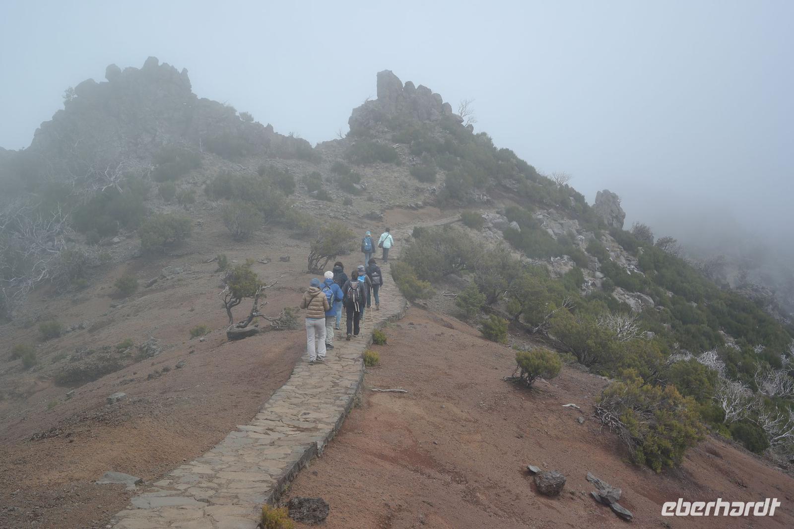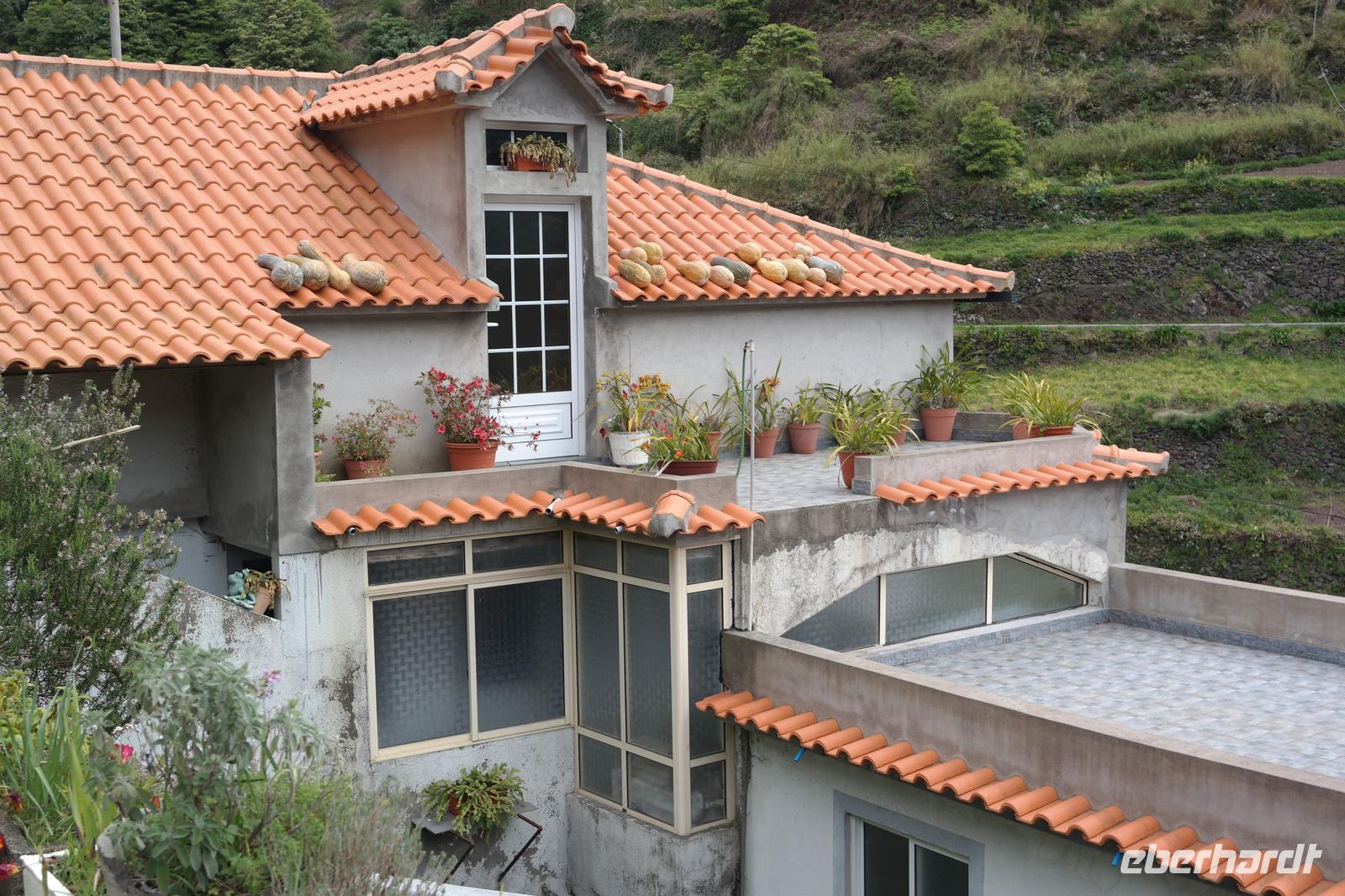 Nach dem Frühstück holt uns unsere Reiseleiterin Maria ab und schon auf dem Weg nach Camacha - die Korbflechterstadt - sprudelt sie ihr botanisches Wissen über die unerschöpfliche Pflanzenwelt der Insel heraus. Ginster, falsche Mimosen - also Akazien, Baumfarne und Lorbeerbäume in vier Arten, den afrikanischen Tulpenbaum, den Flaschenputzerbaum, Schmucklilien und immer wieder „Ortensien" (Portugiesen können nicht wirklich ein -H- sprechen) - unsere Augen können es in Blicken kaum erfassen und nebenbei müssen wir die lateinischen, portugiesischen und deutschen Bezeichnungen auch verarbeiten. Wow, und wer denkt, dass würde sich legen, der hat geirrt. Die Quellen, aus denen Maria schöpfen kann, sind auf der Insel Madeira unerschöpflich. Am „kalten Bach" (Ribeiro Frio) un-ternehmen wir einen kleinen Spaziergang durch den „Urwald" von Madeira. Über Santana (eigentlich Santa Ana) gelangen wir zum Ausgangspunkt unserer nächsten Wanderung: Der Pico do Ruivo (1.862 m) wäre das Ziel unserer nächsten Wanderung gewesen. Der verschwindet in den Wolken und nach über zwei Dritteln der Strecke beschließen wir in einer Schutzhütte, dass nur eine Gesandte unsere Gruppe auf dem Gipfel vertritt. Mit Halt in Santana geht es schließlich zum Pico do Facho (Berg der Fackeln). Von hier genießen wir den grandiosen Ausblick auf den Adlerfelsen und die Bucht von Ma-chico sowie auf den Flughafen „Ronaldo Cristiano" in Santa Christina (die Hauptstadt Funchal liegt 26 km weiter westlich!). Am Abend erkunden wir noch die portugiesische Küche in einem nahe gelegenen Restaurant. Nix für den eiligen Gast, denn in Portugal wird ein Tisch zur gleichen Zeit bedient - wir haben Zeit mitgebracht und lernen uns dabei näher kennen.