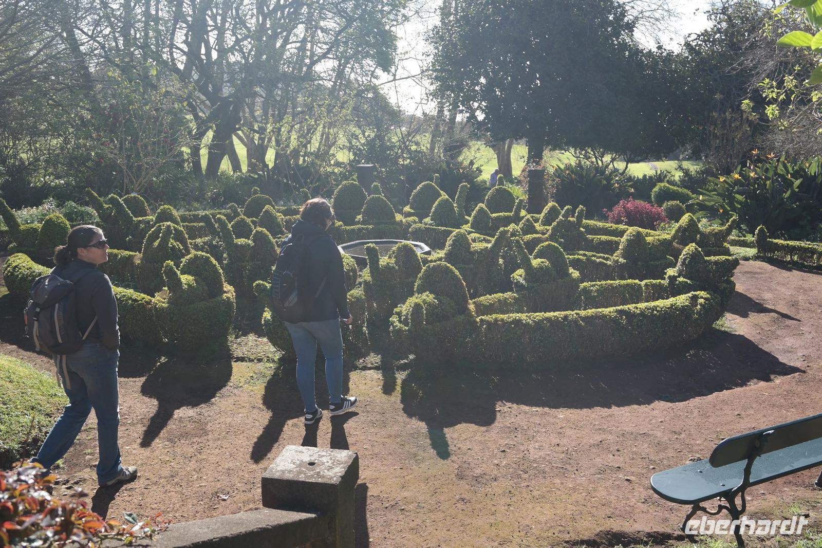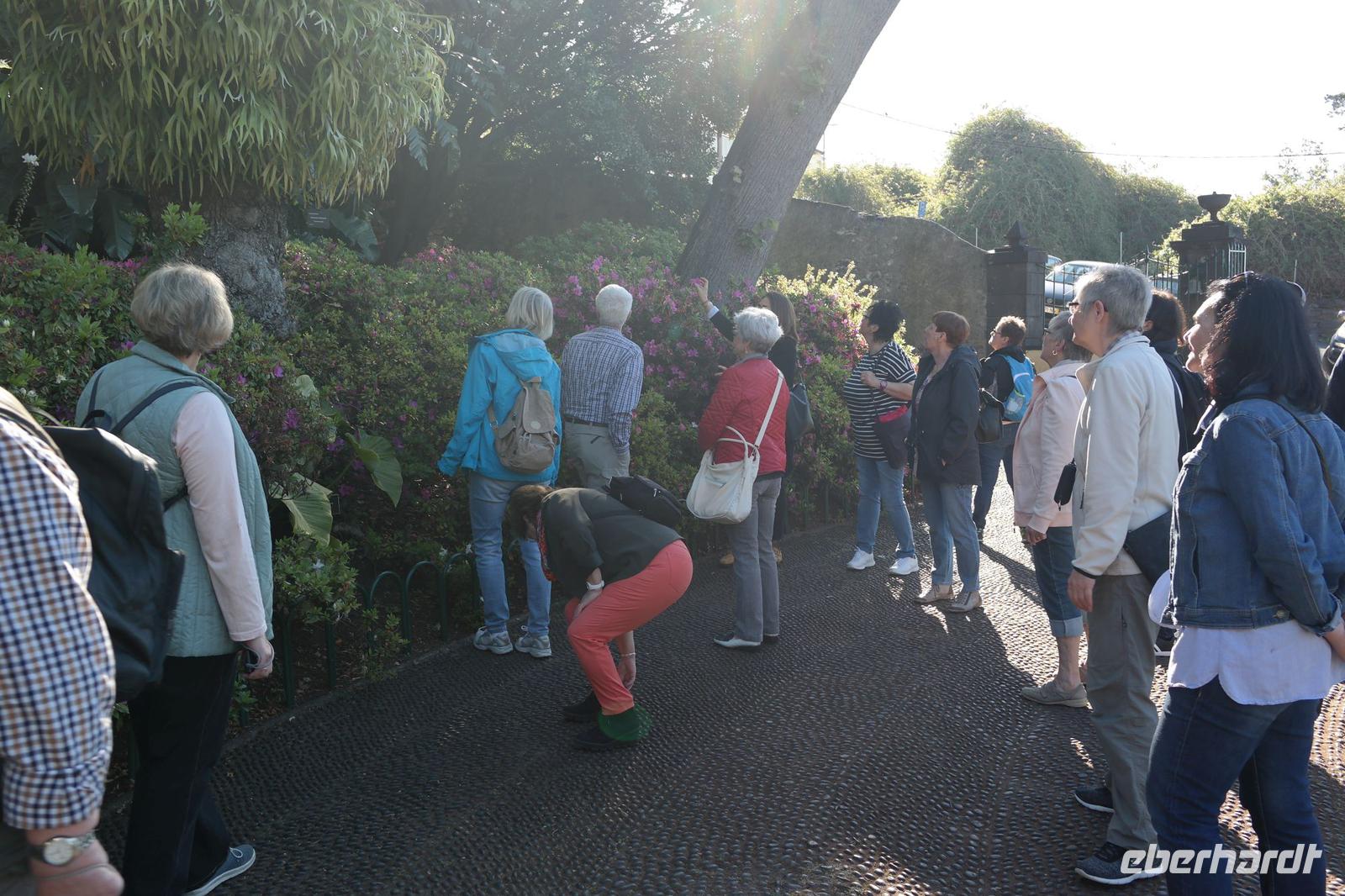 Maria hat für uns heute die Wanderung entlang der Levada da Serra Faial herausgesucht - auf einem breiten Weg entlang einer ursprünglichen Levada (aus Stein, Holz oder einfach in die Erde gegraben) - uns gefällt es prima, denn der breite Weg geht durch einen Urwald und später durch ein kleines Dörfchen. Nach einer kleinen Verschnaufpause schraubt sich unser Bus auf 1050 m zum zum „Eiro de Serrado" hoch. Bei herrlichem Sonnenschein genießen wir spektakuläre Ausblicke auf das Nonnental. Wir fahren zur Wallfahrtskirche „Nossa de Senhora de Monte" und schauen uns schon einmal die Korbschlittenfahrer an - und dann stürzen wir uns in's Vergnügen. Krönung des Tages ist eine Schokoladenverkostung in Joe's Kräutergarten. Handgemachte Schokoladenspezialitäten mit verschiede-nen Likören sowie frische Früchte mit Schoki-Soße lassen wir im Munde „zergehen". Unser Busfahrer Mauro fährt die steile und sehr enge Gasse bis zum Schokoladengarten hinauf - Respekt, bislang war dieses Stück Straße immer zu Fuß zurück zu legen. Am Abend erwartet uns im Hotel ein italienisches Buffet - lecker.