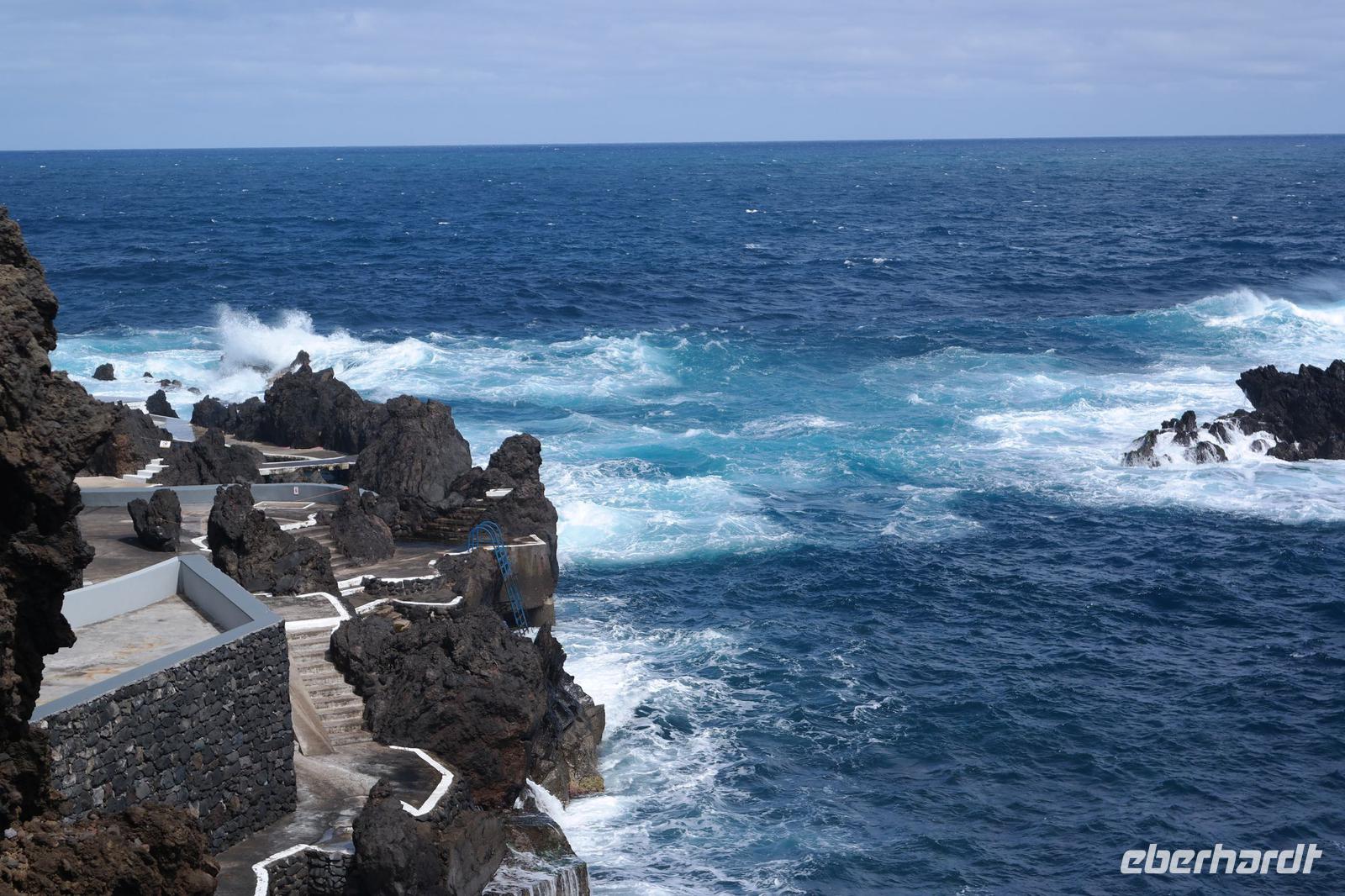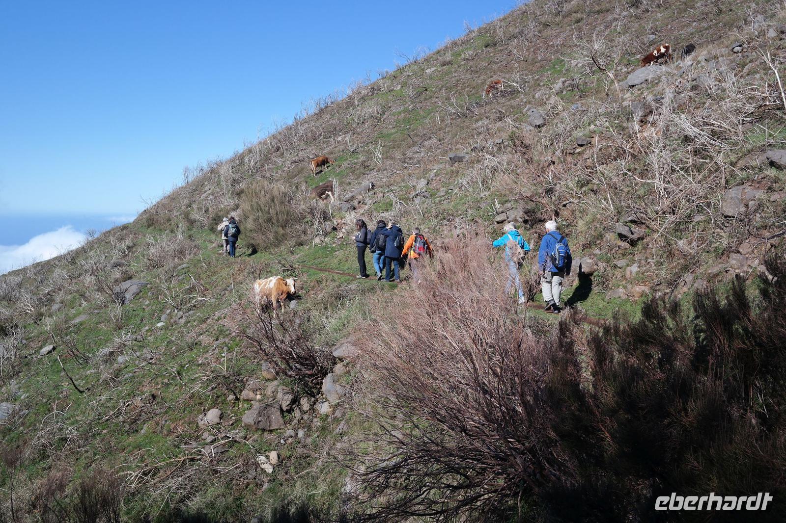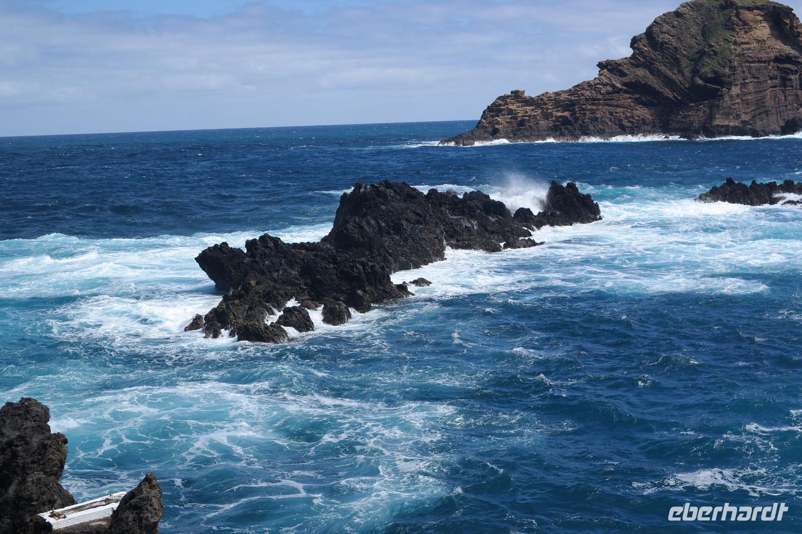 Auf dem Weg zu unseren heutigen Höhepunkten erzählt uns Maria vom Alltagsleben auf der Insel, die rund das 5-fache mehr an Touristen empfängt, als sie selbst Einwohner hat. Wir besichtigen „Ribeira Brava" mit der wunderschönen Kirche des Heiligen Benedikt. Wir fahren zur Hochebene „Paul da Serra", auf rund 1.400 m gelegen, sind hier die Straßen ausnahmsweise einmal gerade und eben. Unsere letzte (leichte!) Wanderung steht an - freilaufende, glückliche Kühe am Wegesrand beachten uns kaum. Dafür müssen wir auf unserem Wege einigen Wasserfällen und Überschwemmungen ausweichen - unsere Gruppe meistert auch diese Hürden (Respekt!!!). Um die Mittagszeit machen wir Halt im schroff-bizarren Felsen- und Lava-Labyrinth Porto Moniz. Der Atlantik ist heute sehr bewegt und beeindruckt uns mit seinem Naturschauspiel aus hohen Wellen, tosender Brandung und darüber strahlend blauem Himmel. Am Abend gönnen wir uns noch einmal die leckeren Spezialitäten aus der guten Küche Madeiras und beschließen unseren Aufenthalt mit Poncha (nicht Poncho - das war das Dings zum Anziehen!!).