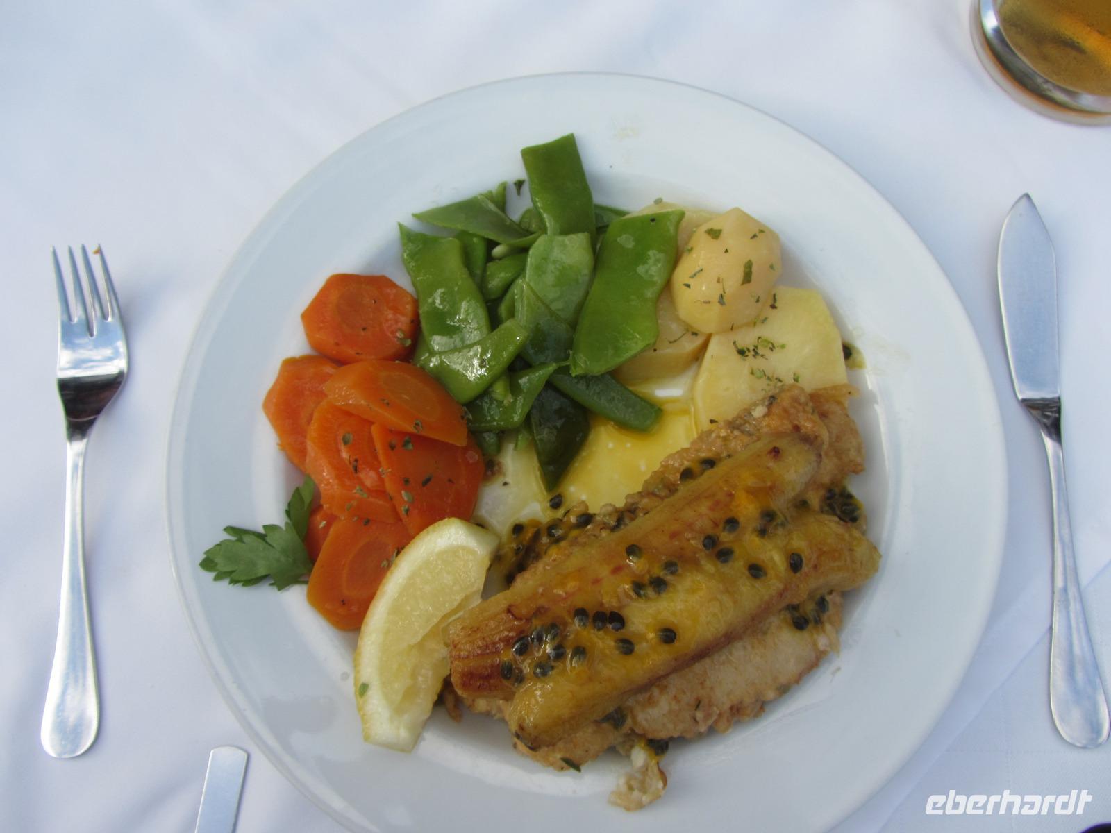 Am Abend erwartet uns in unserem Übernachtungsort Canico de Baixo ein typisch madeirensisches Spezialtitäten-Essen. Wir treffen hier einen Bekannten wieder - den Degenfisch, den wir am Nachmittag schon in der Markthalle zum Verkauf gesehen haben. Zusammen mit einer Bananen/Maracujasoße und einem fantastischen Blick von der Restaurantterasse schmeckt dieser hervorragend!