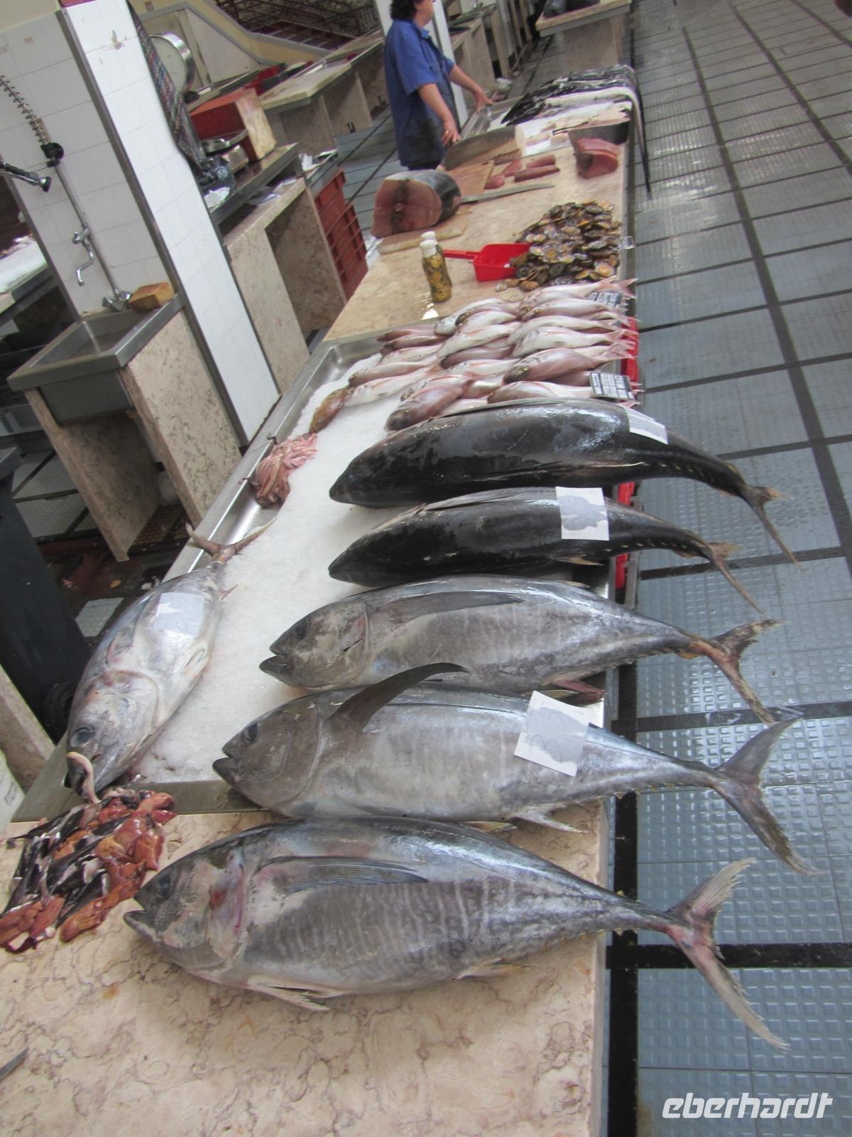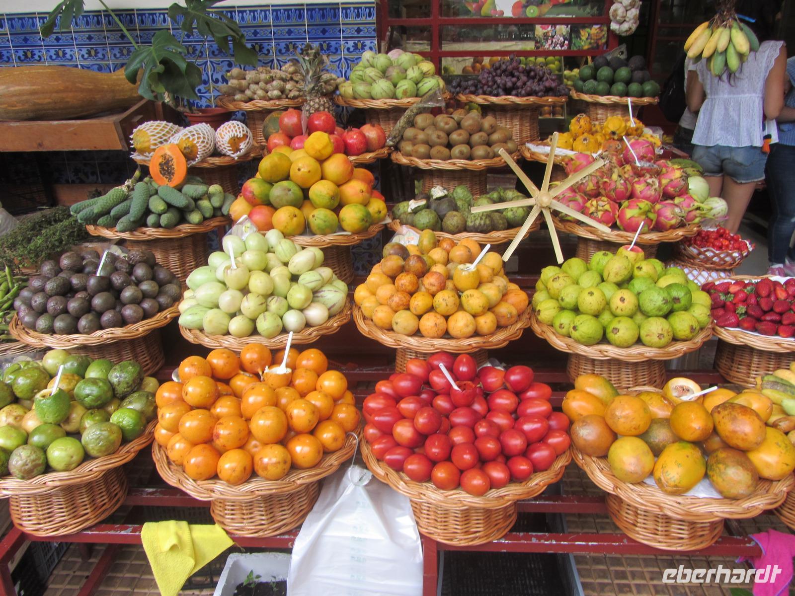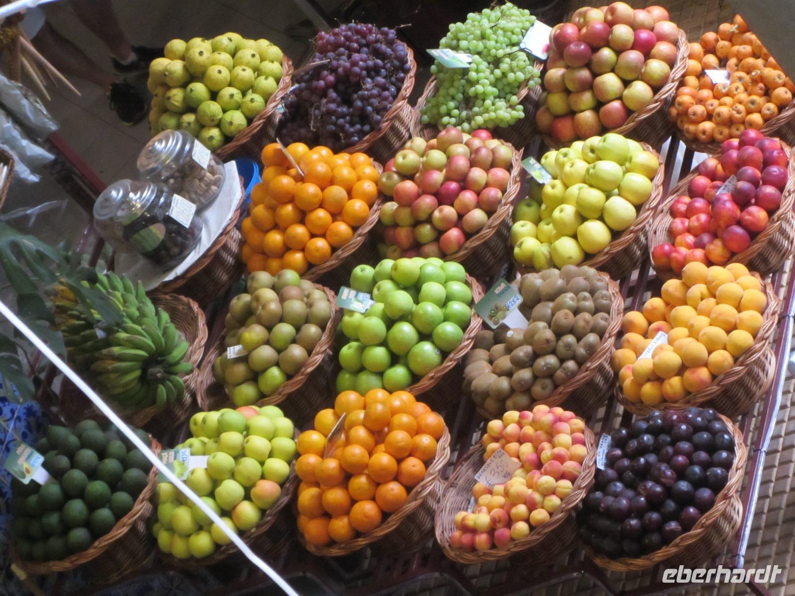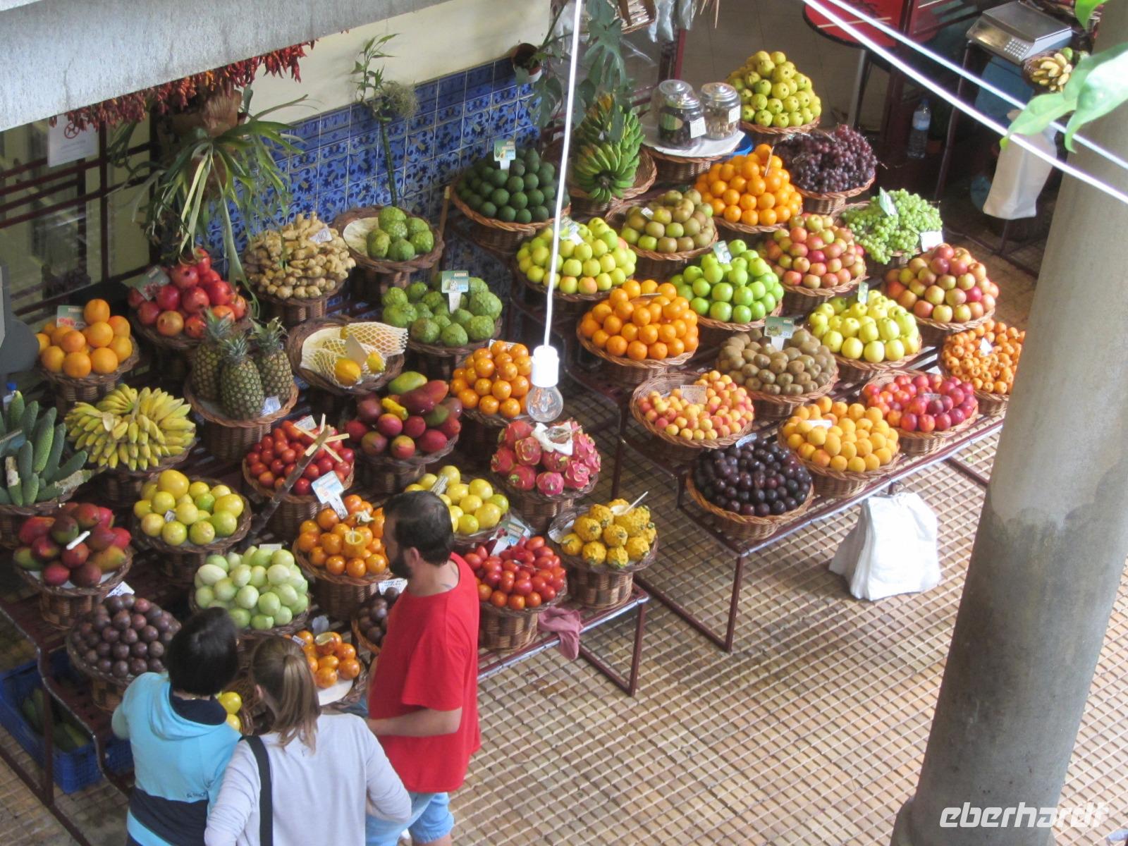 Im Anschluss geht es weiter zur Verkostung einer der berühmtesten Spezialitäten Madeiras - dem Madeirawein. In "Blandys Winelodge" erwartet man uns bereits für eine Verkostung und wir dürfen uns munter vormittags durch die Karte probieren. Nach der Verkostung und Führung durch den Weinkeller spazieren wir zur Markthalle von Funchal, wo am heutigen Freitag geschäftiges Treiben herrscht. Ute zeigt uns, welch riesige Vielfalt von Obst, Gemüse und Fisch man hier kaufen kann und wir beobachten freudig die Einheimischen, die hier ihren Wochenendeinkauf tätigen. Die Markthalle bietet die ideale Möglichkeit hier einen Mittagsimbiss einzunehmen, sodass jeder in Ruhe hier bummeln und sich einen Imbiss kaufen kann.