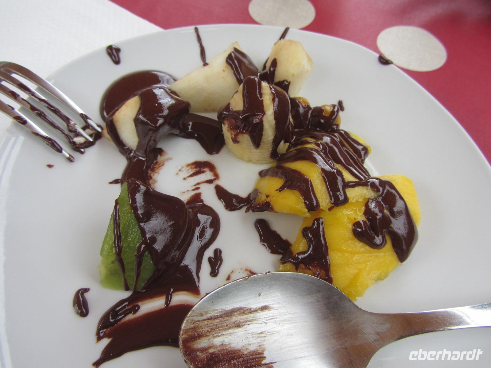 Zu guter letzt dürfen wir noch in einem privaten Kräutergarten handgemacht Schokolade verkosten. Wir werden richtig verwöhnt mit Orangen-, Fenchel-, Szechuan-Pfeffer- Schokolade, selbst zubereitetem Minztee und Früchten mit Schokoladenüberzug. Die Besitzerin der Anlage erklärt uns liebevoll, wie sie die Zutaten für ihre hervorragend schmeckende Schokolade aus ihrem eigenen Kräutergarten sammelt, den sie uns anschließend zeigt. Das Schokoladen-Schlemmen hinterlässt seine Spuren, sodass wir anschließend alle pappsatt mit dem Bus zurück zum Hotel fahren.