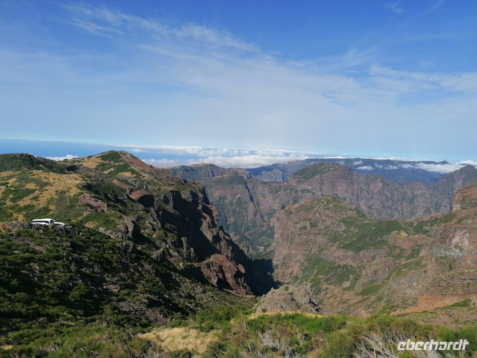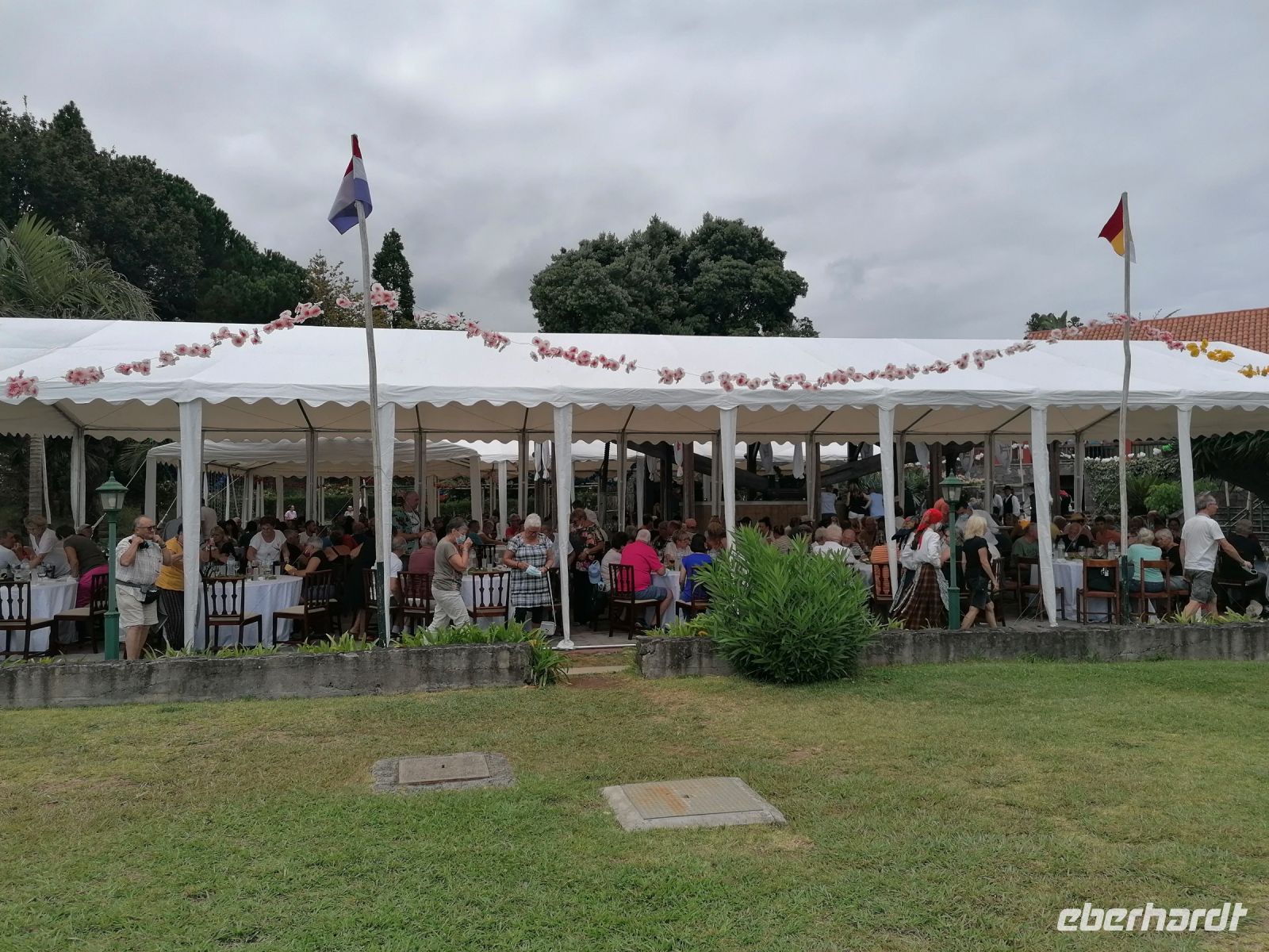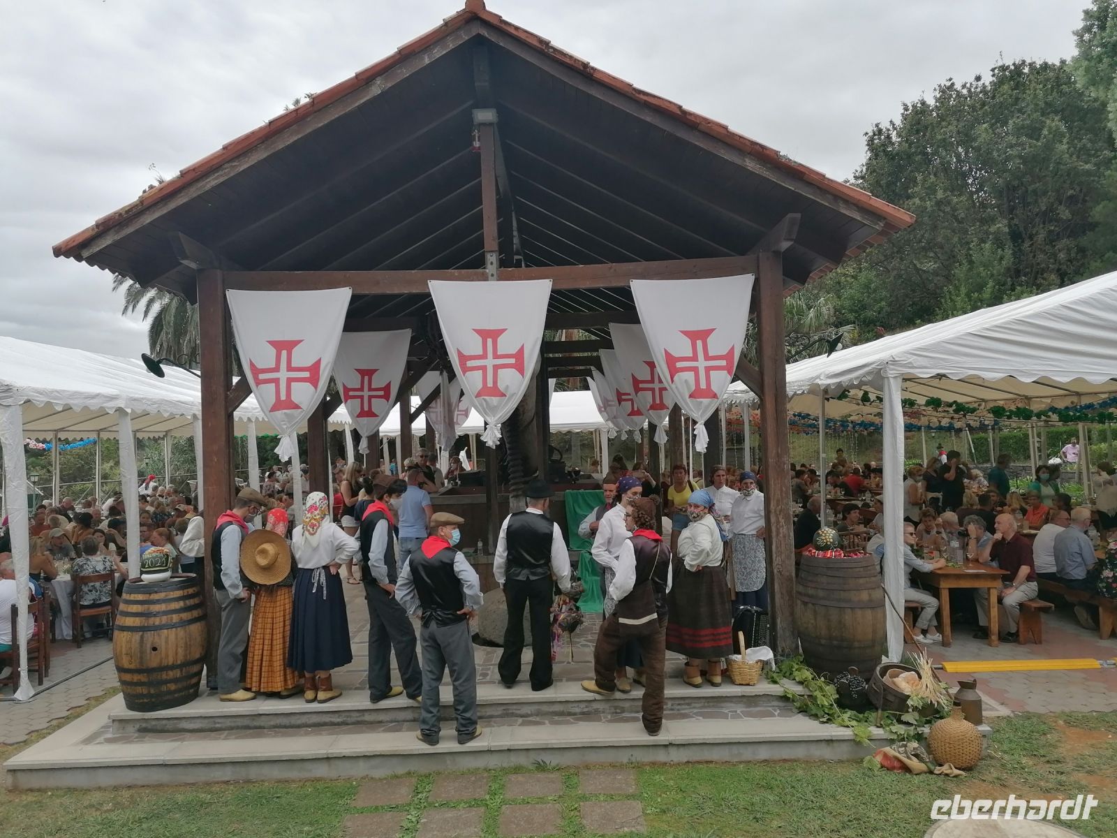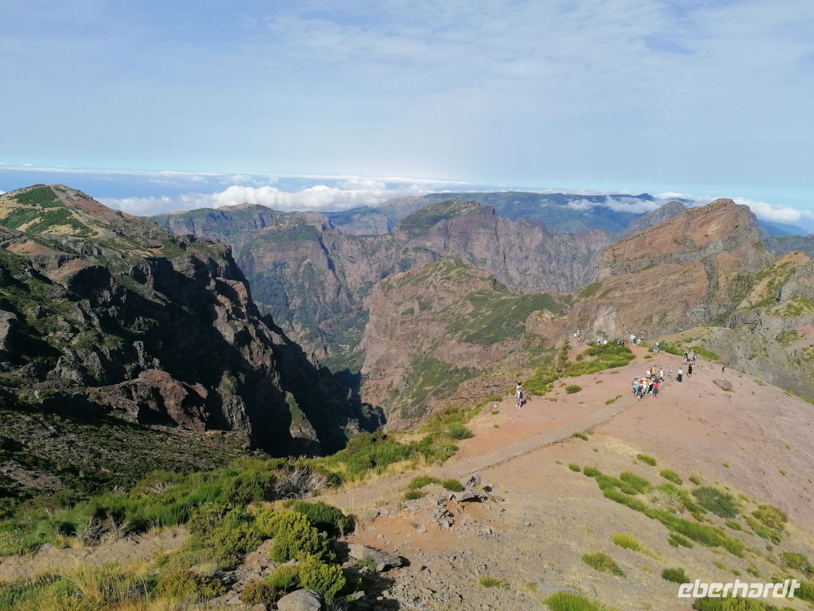 Wir starteten unser erstes gemeinsames Frühstück auf der Terrasse am Hotelpool. Neben warmen Speisen gab es auch leckeres Baguette und frisches Obst. So lässt es sich doch gemütlich und schön in den Tag starten. Nach dem Frühstück starten wir gemeinsam mit Claudio in Richtung Camacha. Camacha wird auch als das Zentrum der Korbflechterei bezeichnet. Unser erster Stopp erfolgte in einer privaten Garage, wo viele Probenstücke der Korbflechterei ausgestellt wurde. Wie immer, war leider unser Koffer zu klein, um die schönen Kunststücke mitzunehmen. Im Anschluss führte uns Claudio zum Aussichtspunkt des Pico do Arieiros. Der Berg ist mit seinen 1818 Meter der drittgrößte Berg der Insel und über den Poiso-Pass erreichbar. Hier oben erlebten wir einen wunderschönen Ausblick auf die Bergwelt Madeiras und konnten in der Ferne sogar die Nachbarinsel Porto Santo erkennen. Nach dem traumhaften Erlebnis oberhalb der Wolkengrenze, fuhren wir zurück ins Tal die kalten Flusses - Ribeiro Frio. Hier gibt es nicht nur eine Forellenzucht zu besichtigen, sondern es stand auch unsere erste kleine Wanderung zum Aussichtspunkt Balcoes auf dem Programm. Auch hier wurden wir wieder mit einer tollen Aussicht belohnt. Im Dorf gab es noch einen Poncha oder Expresso als Stärkung und wir fuhren in Richtung Santana. Santana ist bekannt für seine bunten Madeira-Häuser, die im Stadtzentrum zu finden sind. Einige Bilder später verließen wir auch schon wieder Santana und fuhren zur Quinta do Fruao. Hier findet jährlich das berühmte Weinfest statt. Gemeinsam mit unseren Gästen könnten wir Trauben trampeln und somit selbst Wein produzieren. Besonders die Folklore Tänzer mit ihren wunderbaren Trachten waren immer wieder ein schönes Fotomotiv für unsere Gruppe. Nach dem Weinfest wollten wir noch etwas raus in die einsame Natur. Bei einer Wanderung entlang der Levada do Castelejo könnten wir nochmal den Ausblick auf die Westküste genießen und eine schöne Levada-Wanderung absolvieren. Als letzter Tagespunkt stand nach das Fischerörtchen Machico auf der Agenda. Vom Aussichtspunkt Pico do Facho bestaunten wir die Landebahn des Flughafens und könnten den goldgelben Strand von Machico entdecken. Am Abend ließen wir den langen Tag bei einem Abendessen im örtlichen Restaurant Villa Ventura ausklingen.