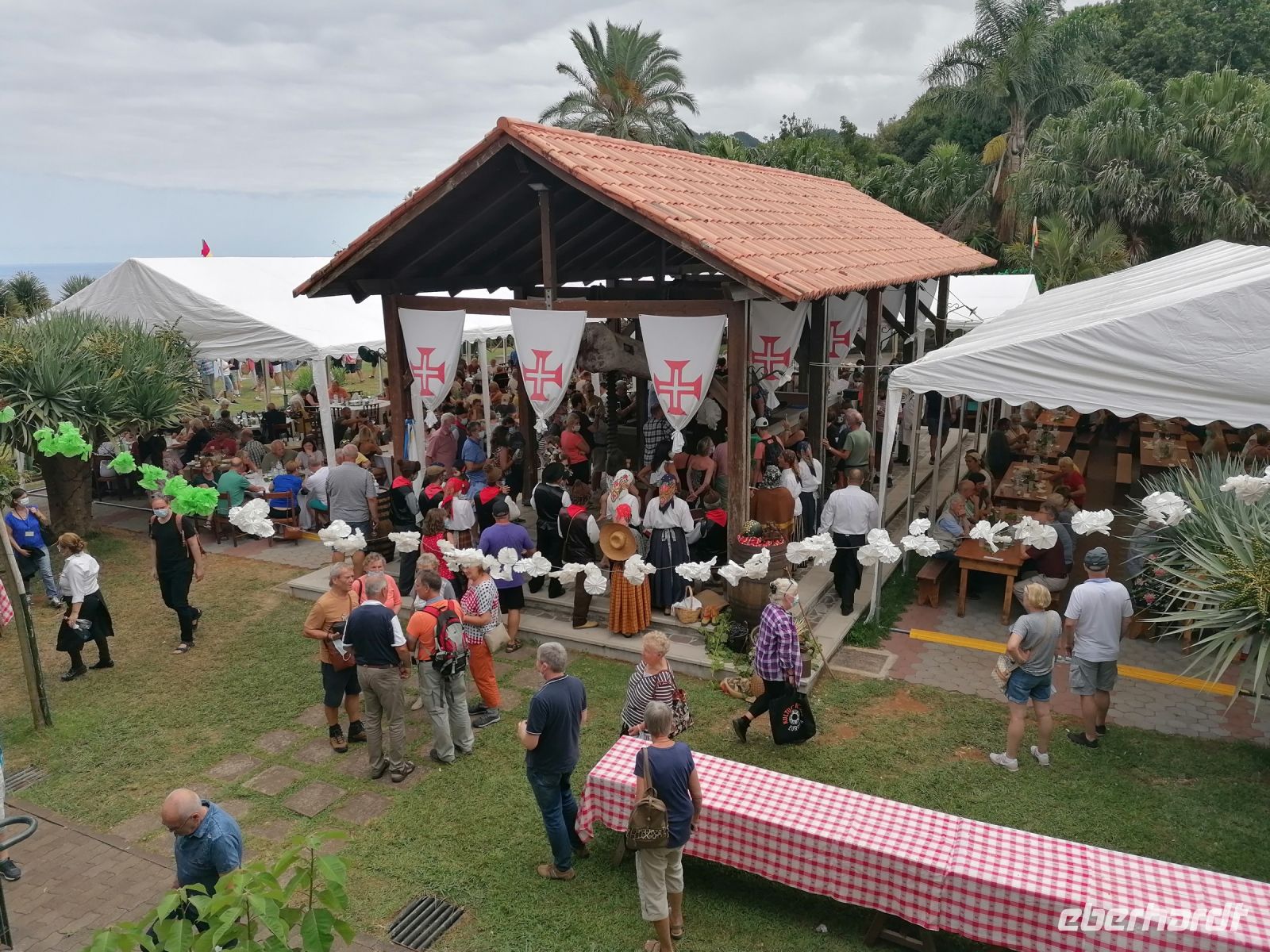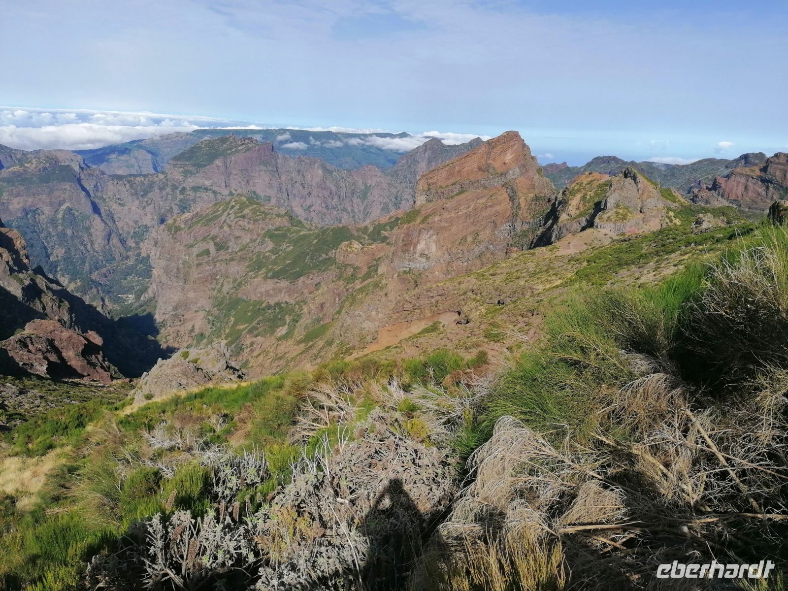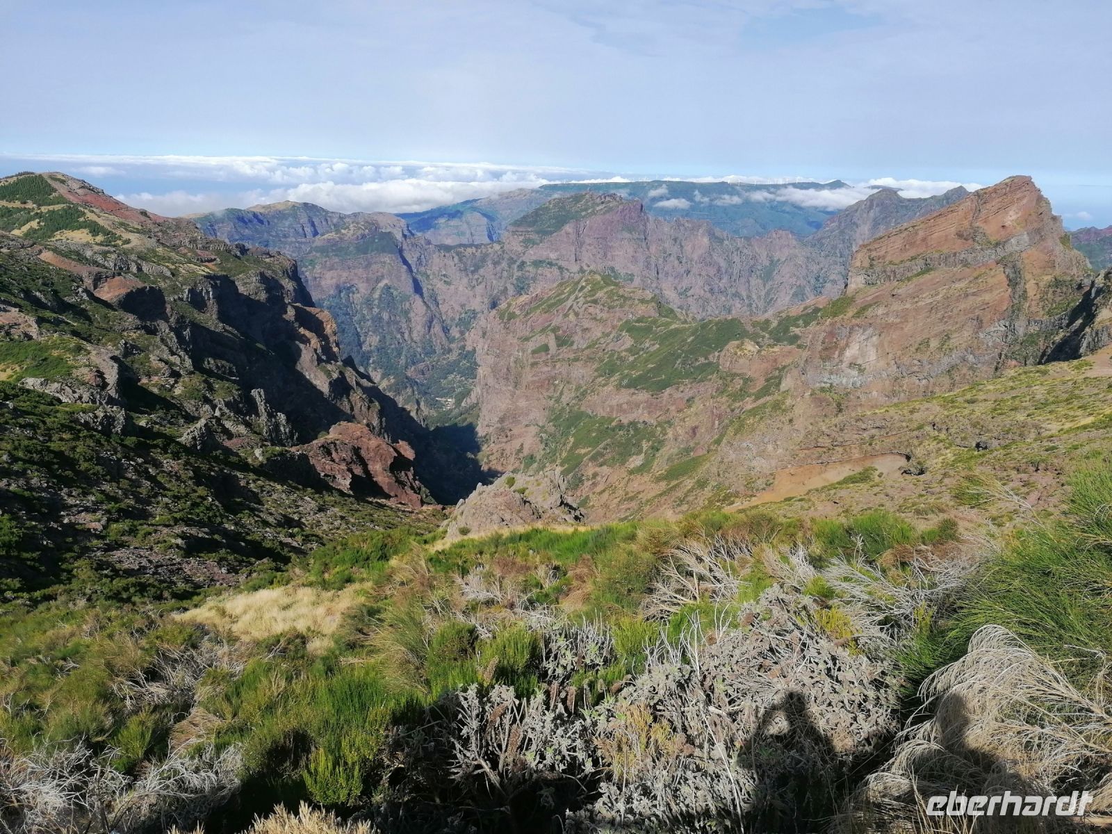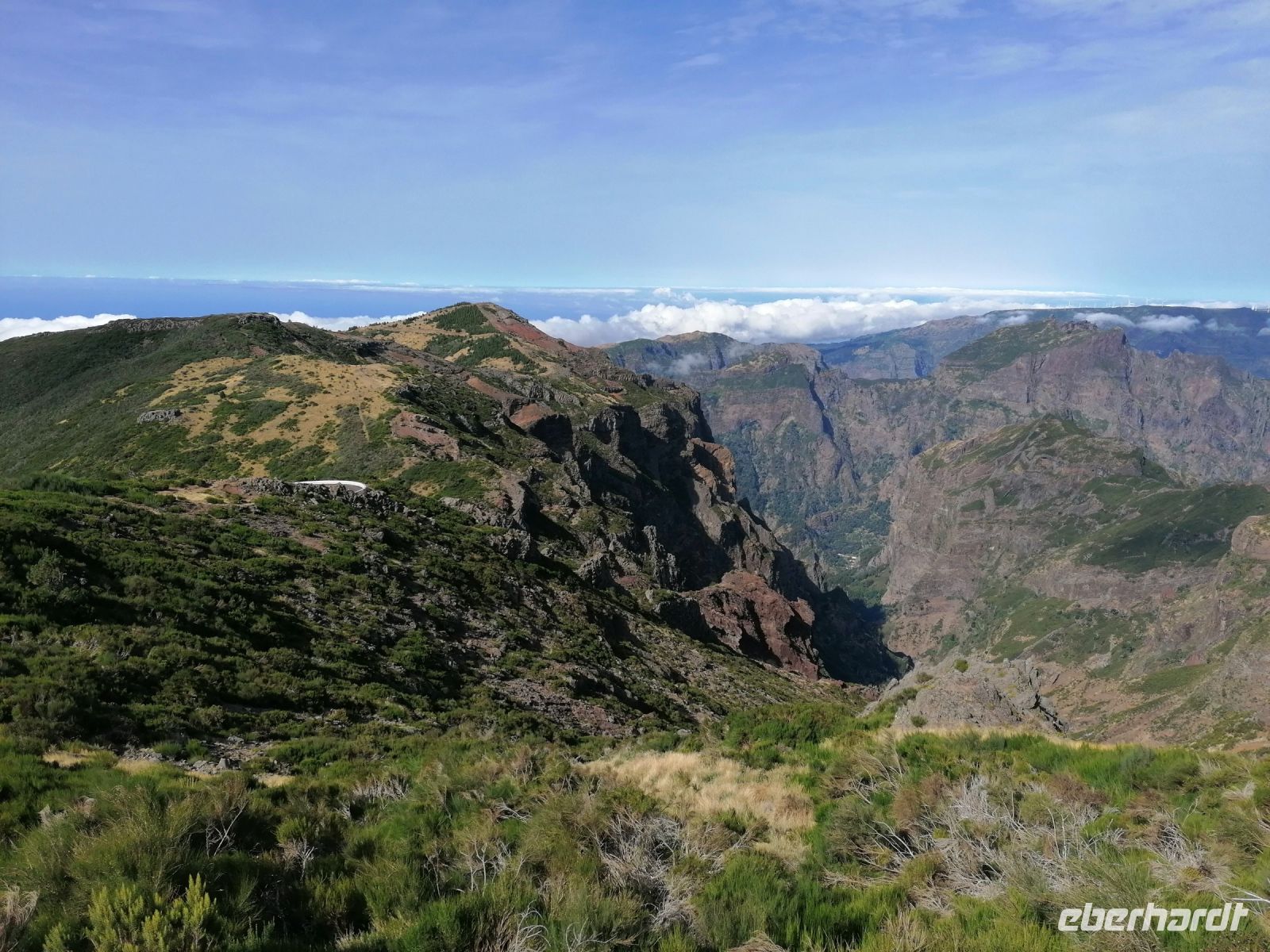 Wir starteten unser erstes gemeinsames Frühstück auf der Terrasse am Hotelpool. Neben warmen Speisen gab es auch leckeres Baguette und frisches Obst. So lässt es sich doch gemütlich und schön in den Tag starten. Nach dem Frühstück starten wir gemeinsam mit Claudio in Richtung Camacha. Camacha wird auch als das Zentrum der Korbflechterei bezeichnet. Unser erster Stopp erfolgte in einer privaten Garage, wo viele Probenstücke der Korbflechterei ausgestellt wurde. Wie immer, war leider unser Koffer zu klein, um die schönen Kunststücke mitzunehmen. Im Anschluss führte uns Claudio zum Aussichtspunkt des Pico do Arieiros. Der Berg ist mit seinen 1818 Meter der drittgrößte Berg der Insel und über den Poiso-Pass erreichbar. Hier oben erlebten wir einen wunderschönen Ausblick auf die Bergwelt Madeiras und konnten in der Ferne sogar die Nachbarinsel Porto Santo erkennen. Nach dem traumhaften Erlebnis oberhalb der Wolkengrenze, fuhren wir zurück ins Tal die kalten Flusses - Ribeiro Frio. Hier gibt es nicht nur eine Forellenzucht zu besichtigen, sondern es stand auch unsere erste kleine Wanderung zum Aussichtspunkt Balcoes auf dem Programm. Auch hier wurden wir wieder mit einer tollen Aussicht belohnt. Im Dorf gab es noch einen Poncha oder Expresso als Stärkung und wir fuhren in Richtung Santana. Santana ist bekannt für seine bunten Madeira-Häuser, die im Stadtzentrum zu finden sind. Einige Bilder später verließen wir auch schon wieder Santana und fuhren zur Quinta do Fruao. Hier findet jährlich das berühmte Weinfest statt. Gemeinsam mit unseren Gästen könnten wir Trauben trampeln und somit selbst Wein produzieren. Besonders die Folklore Tänzer mit ihren wunderbaren Trachten waren immer wieder ein schönes Fotomotiv für unsere Gruppe. Nach dem Weinfest wollten wir noch etwas raus in die einsame Natur. Bei einer Wanderung entlang der Levada do Castelejo könnten wir nochmal den Ausblick auf die Westküste genießen und eine schöne Levada-Wanderung absolvieren. Als letzter Tagespunkt stand nach das Fischerörtchen Machico auf der Agenda. Vom Aussichtspunkt Pico do Facho bestaunten wir die Landebahn des Flughafens und könnten den goldgelben Strand von Machico entdecken. Am Abend ließen wir den langen Tag bei einem Abendessen im örtlichen Restaurant Villa Ventura ausklingen.