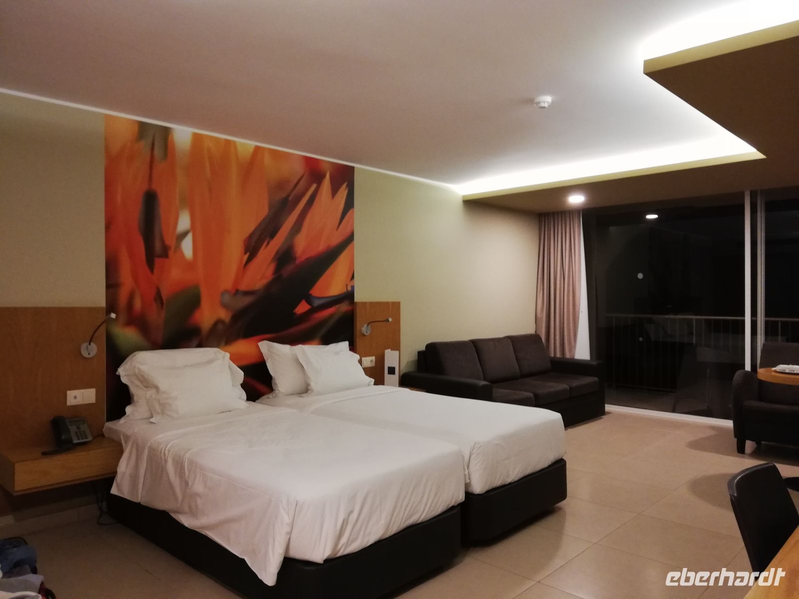 Unser Hotel The View Oasis liegt in dem benachbarten Ort Canico de Baixo direkt am Meer. Bevor wir die Zimmer beziehen, treffen wir uns alle in der Bar, um die Gäste über das Programm und den Ablauf der nächsten Tage zu informieren. Davor gibt es aber, wie anders – einen Madeira Wein. Also zum Wohl und auf eine schöne Woche. Da die meisten sehr früh aufstehen mussten, freuen wir uns auf das Abendessen im Hotelrestaurant. Also schnell die Koffer ins Zimmer bringen, etwas frisch machen. Das große, helle Restaurant erwartet uns mit riesigem Büffet voller leckerer Köstlichkeiten. Bei einer kleinen Runde in der Anlage mit beleuchtetem Swimming Pool entdecken wir schon die blühende Strelitzie und werfen noch Blick aufs Meer. Strelitzie schmückt auch die Zimmer, allerdings als Hintergrund von Bett an der Wand.