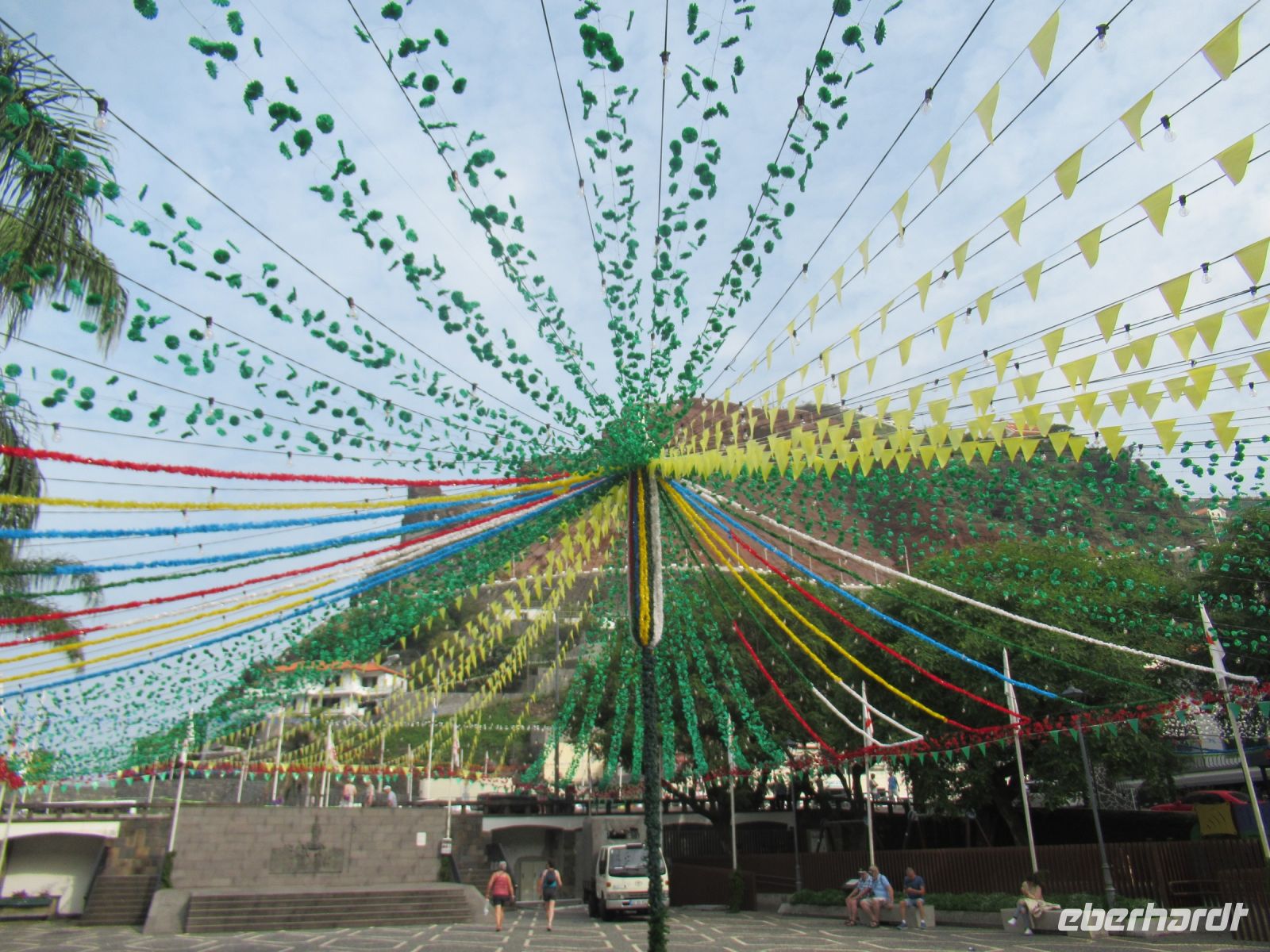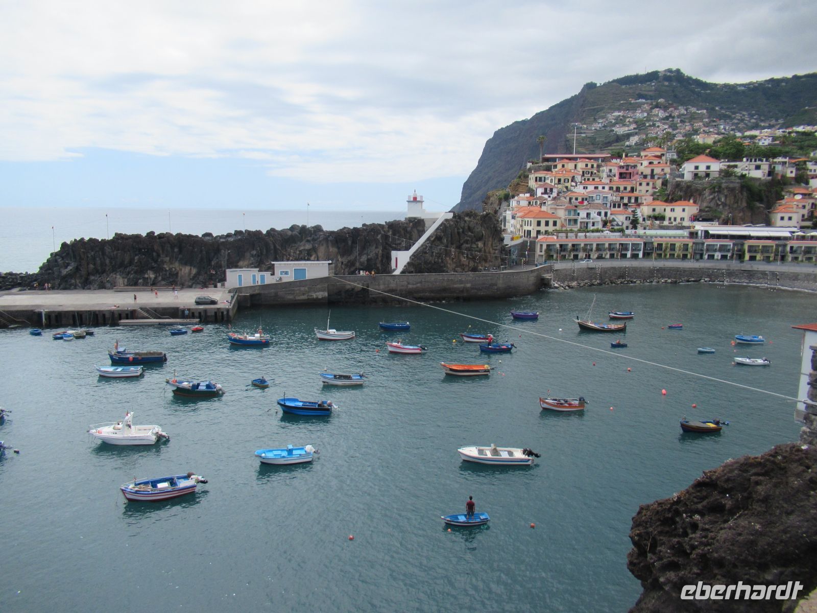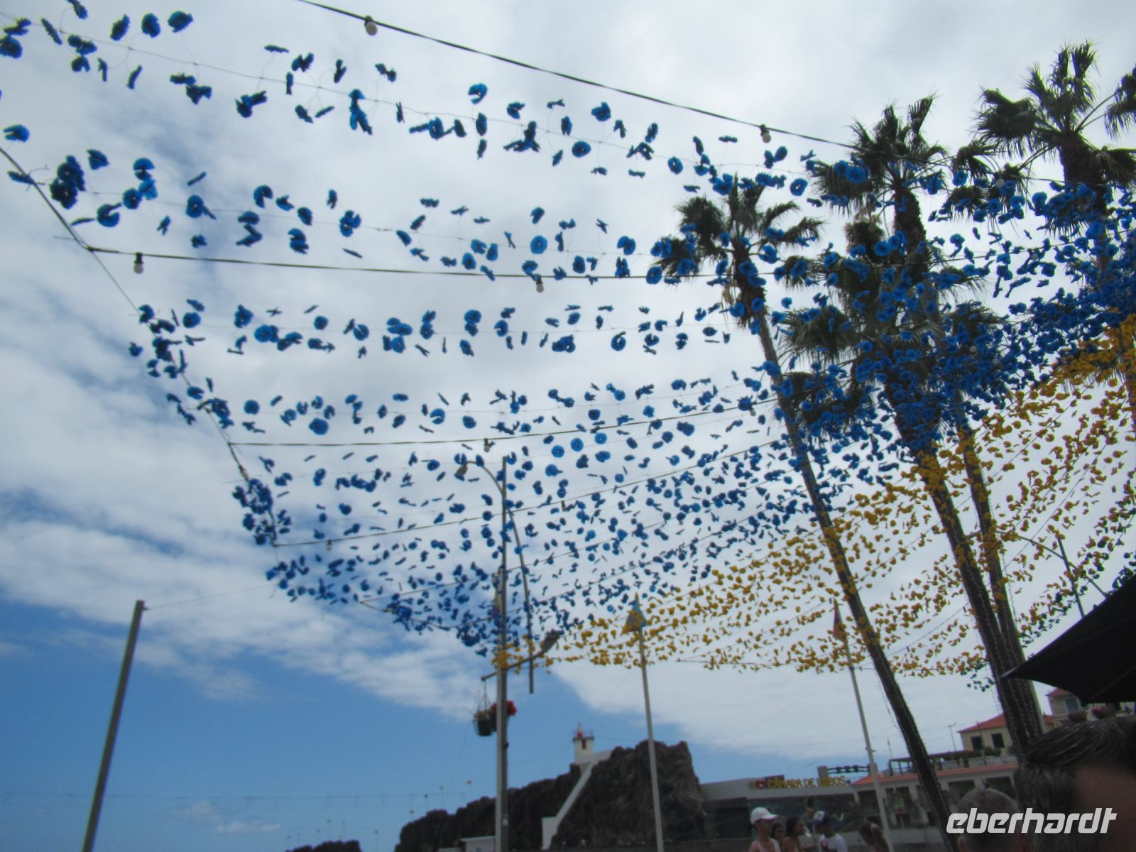 Da beginnt unser Nachmittagsprogramm. Wir fahren nach Camara de Lobos, steigen aber vorher aus und gingen einen sehr schönen kleinen Weg an der Küste bis zum Ort. An der Küste sehen wir auch einen sehr schön angelegtes Meeresschwimmbad mit einem Pool. In der Bucht von Camara de Lobos liegen bunt bemalte Fischerboote – eine wunderbare Kulisse. In einer kleinen Auszeit trinken manche Gäste mit Sergio einen frischen Poncha oder erkunden die bunt dekorierten Straßen für das Johannesfest, das morgen hier stattfindet.