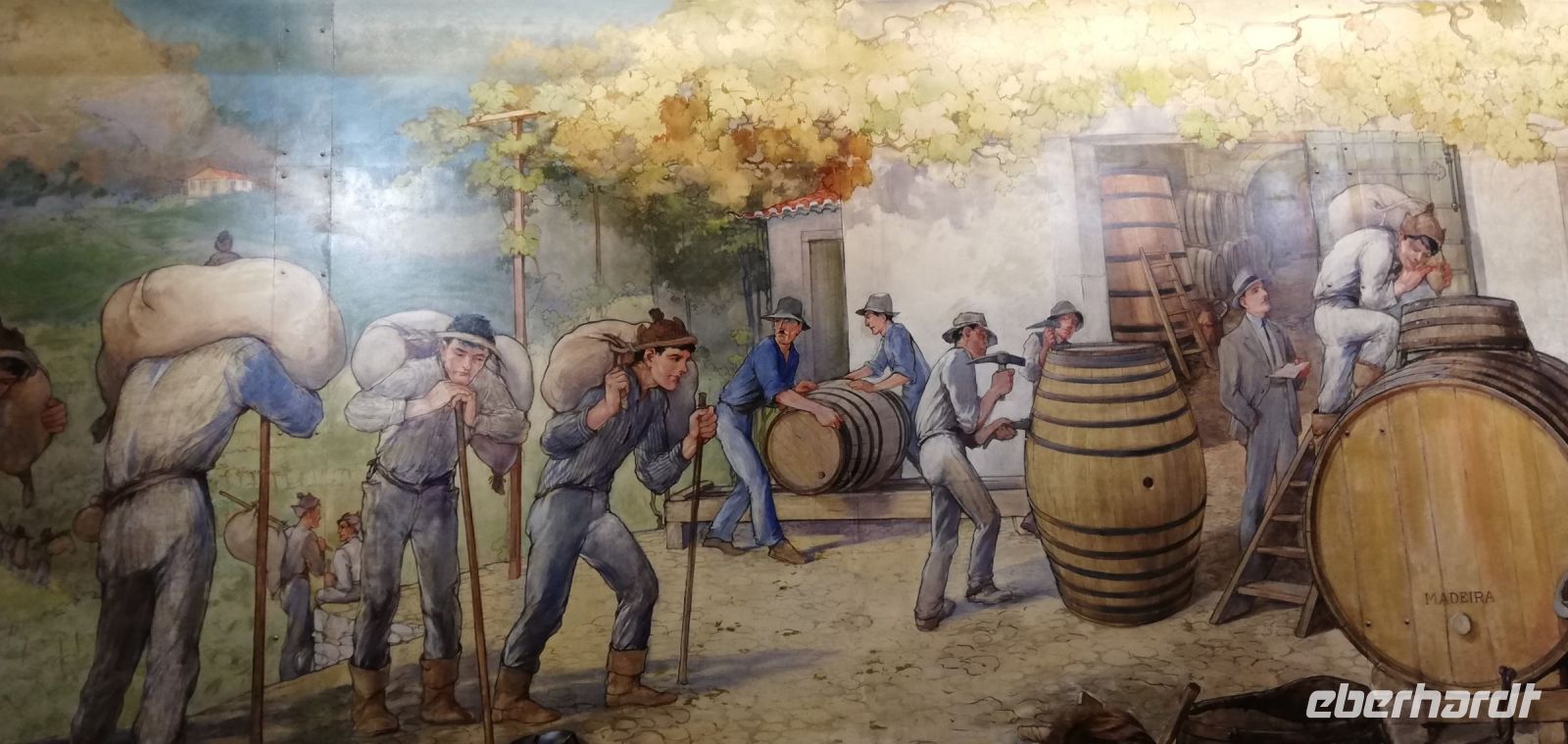 erklärt. Umgeben von großen Holzweinfässer dürfen wir in einem mit Gemälden verzierten Raum die Madeira Weine probieren und auch kaufen. Immerhin werden für Madeira Wein 20 verschiedene Rebsorten verwendet, die bekanntesten sind Sercial, Verdelho und Malvasia.