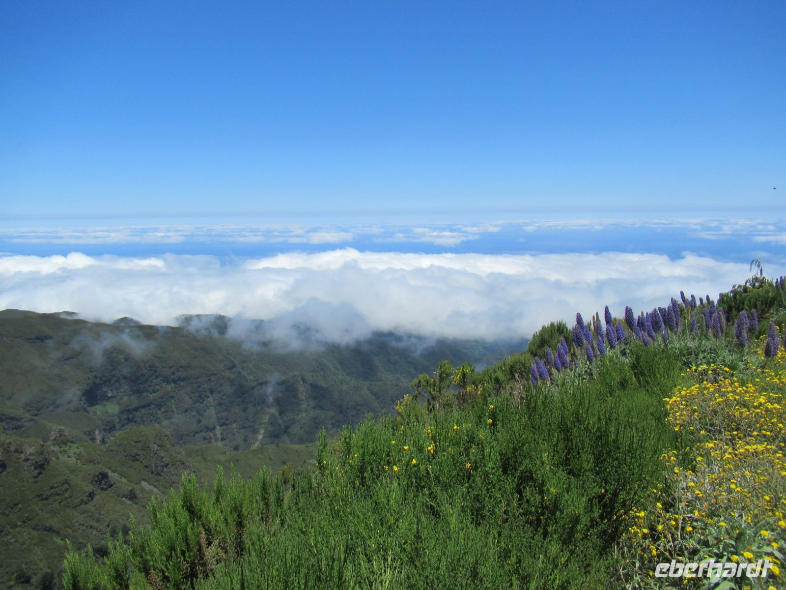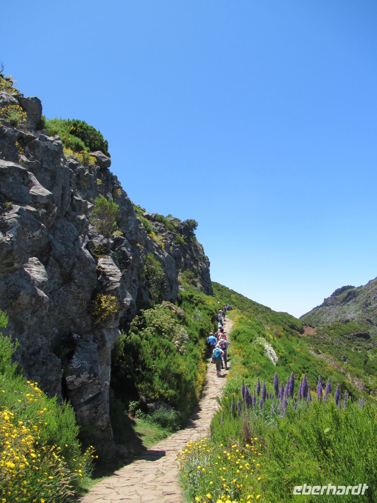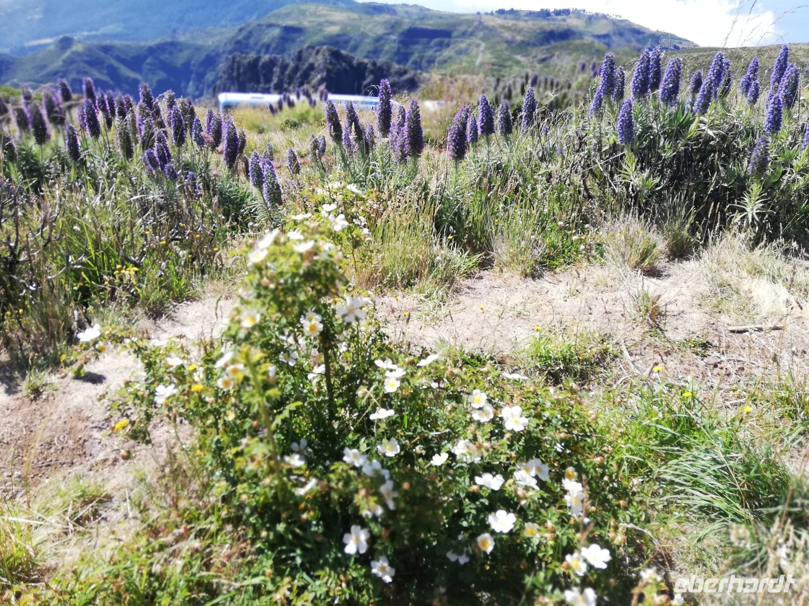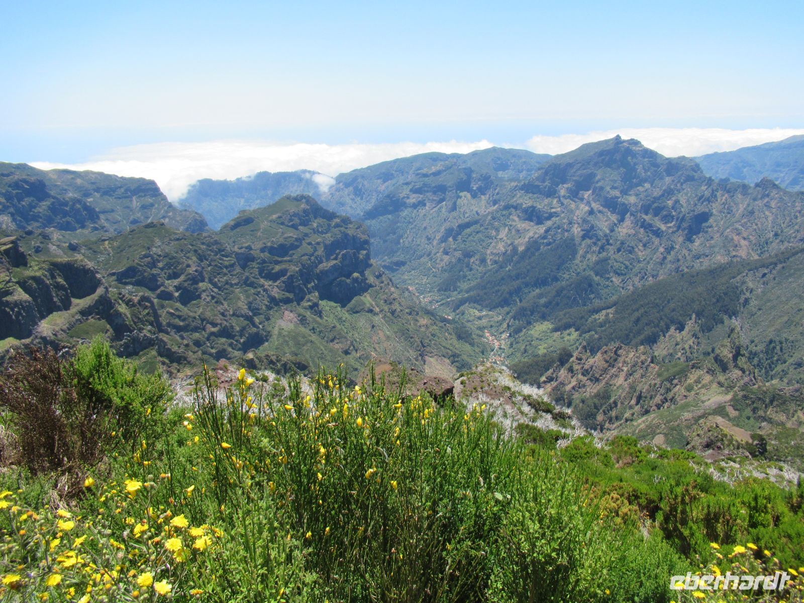 Alle anderen schreiten weiter und an vielen Stellen bewundern wir nicht nur die umliegende Berge, Schluchten aber auch die Vielfalt der Pflanzen – Madeira Stolz, Margeriten, Ginster und viele andere Blümchen schmücken den Weg – und dass in dieser Höhe.