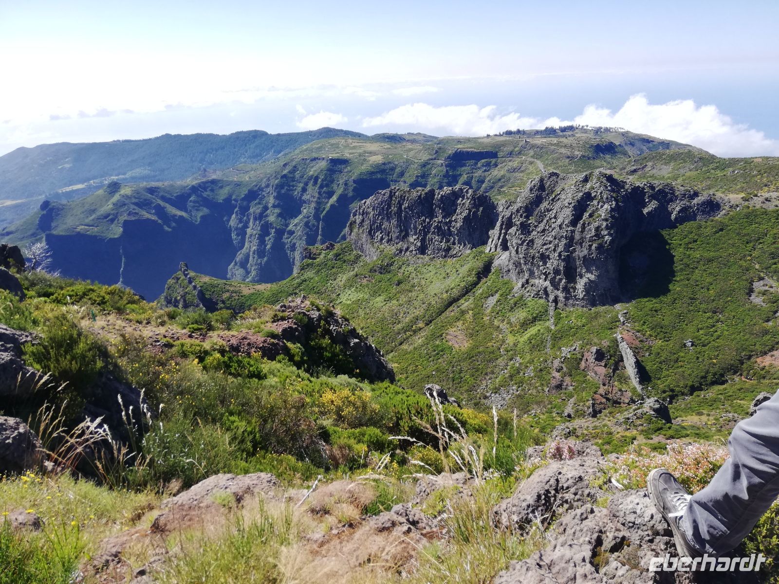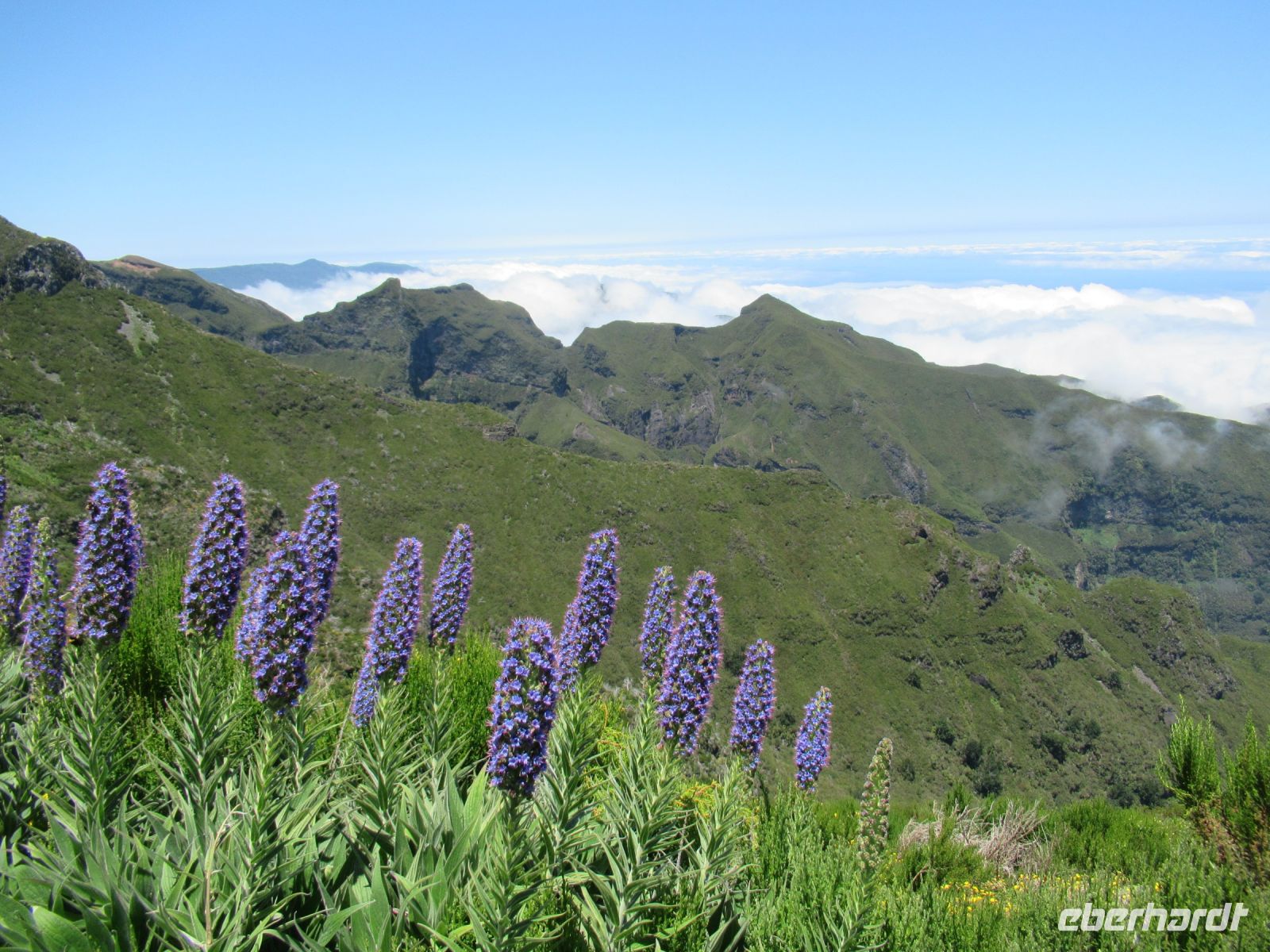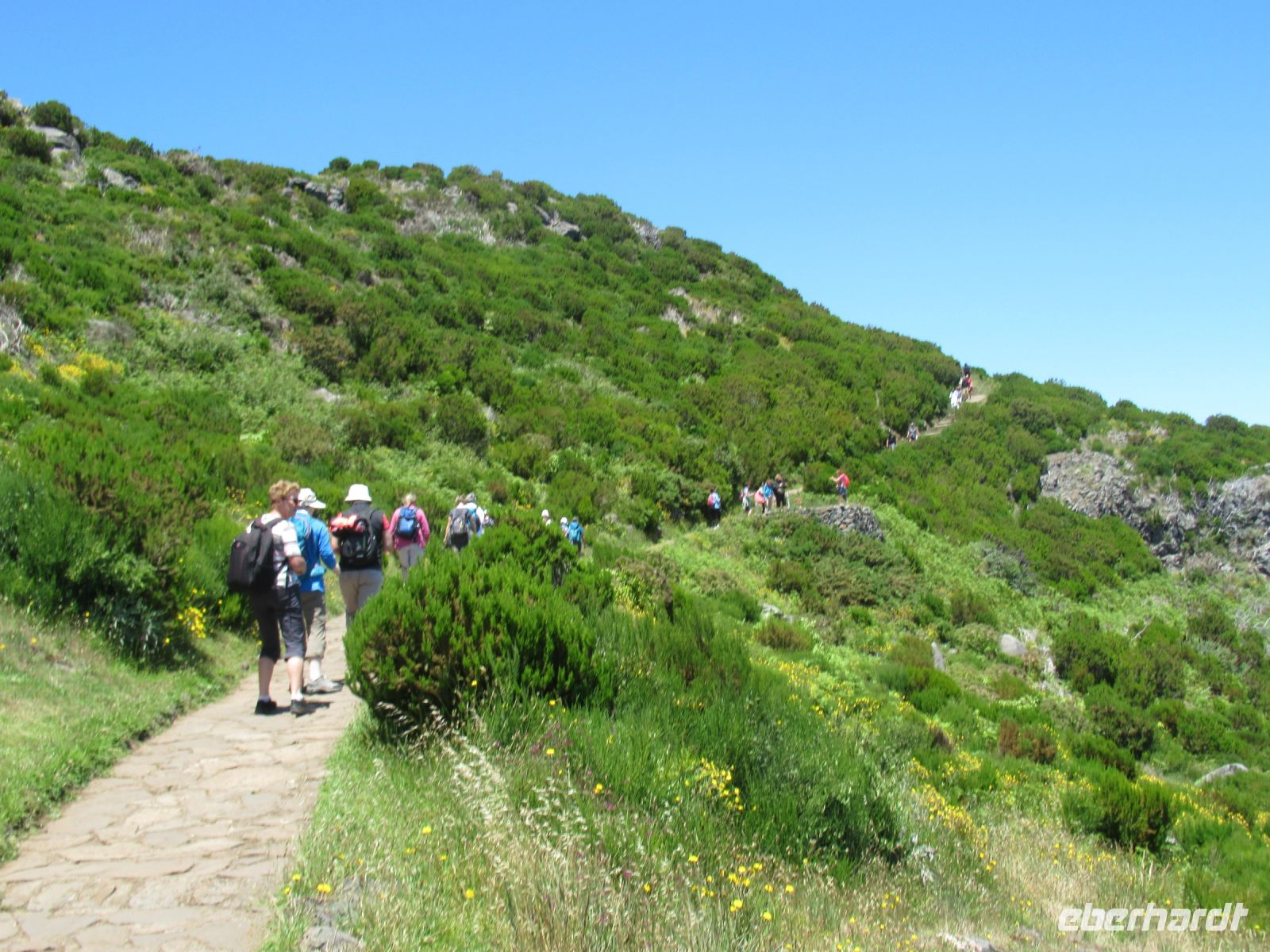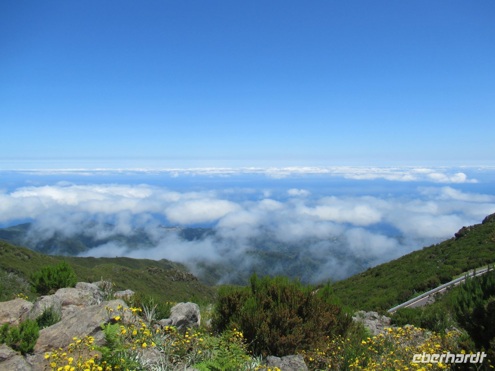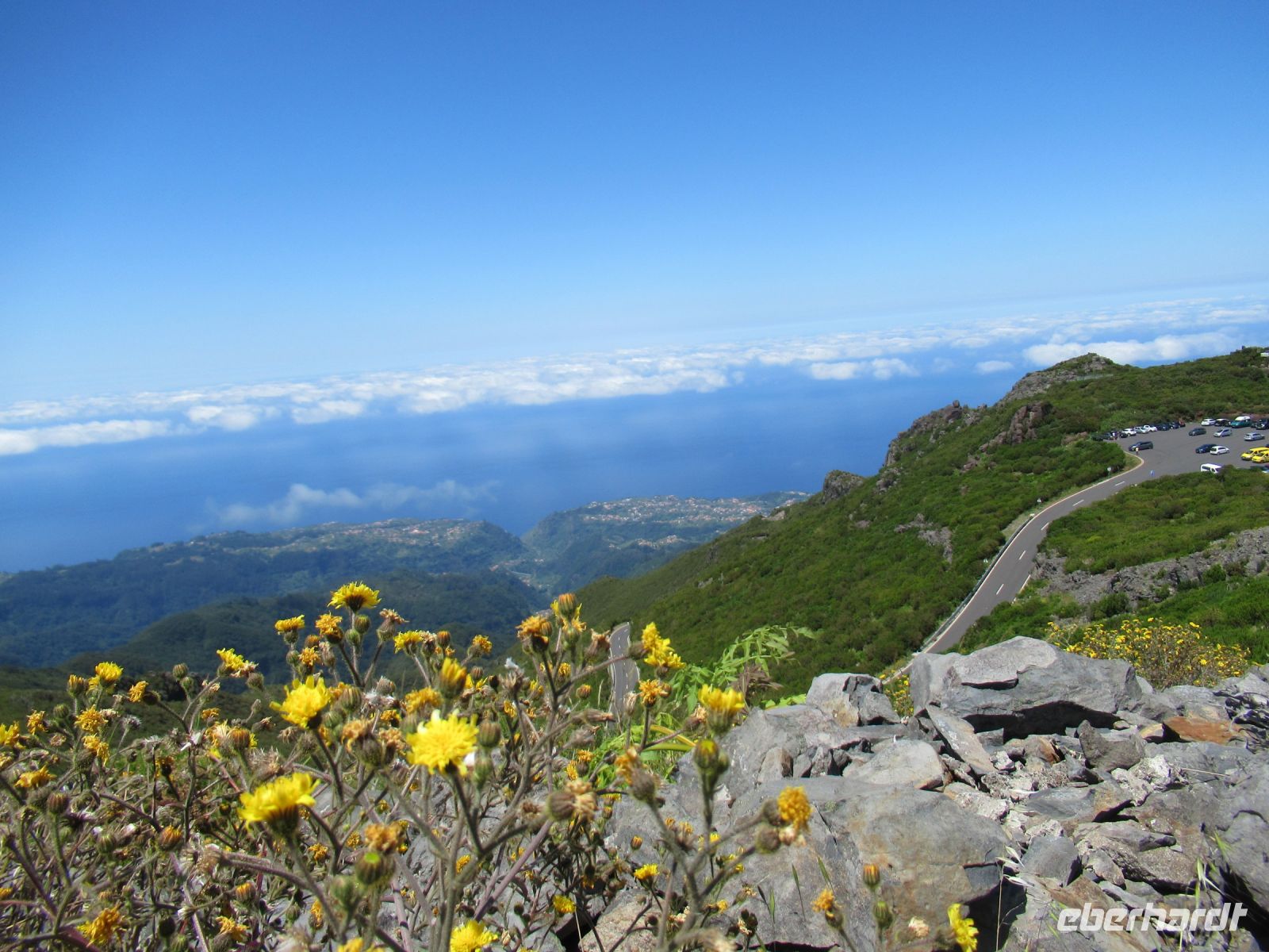 Alle anderen schreiten weiter und an vielen Stellen bewundern wir nicht nur die umliegende Berge, Schluchten aber auch die Vielfalt der Pflanzen – Madeira Stolz, Margeriten, Ginster und viele andere Blümchen schmücken den Weg – und dass in dieser Höhe.