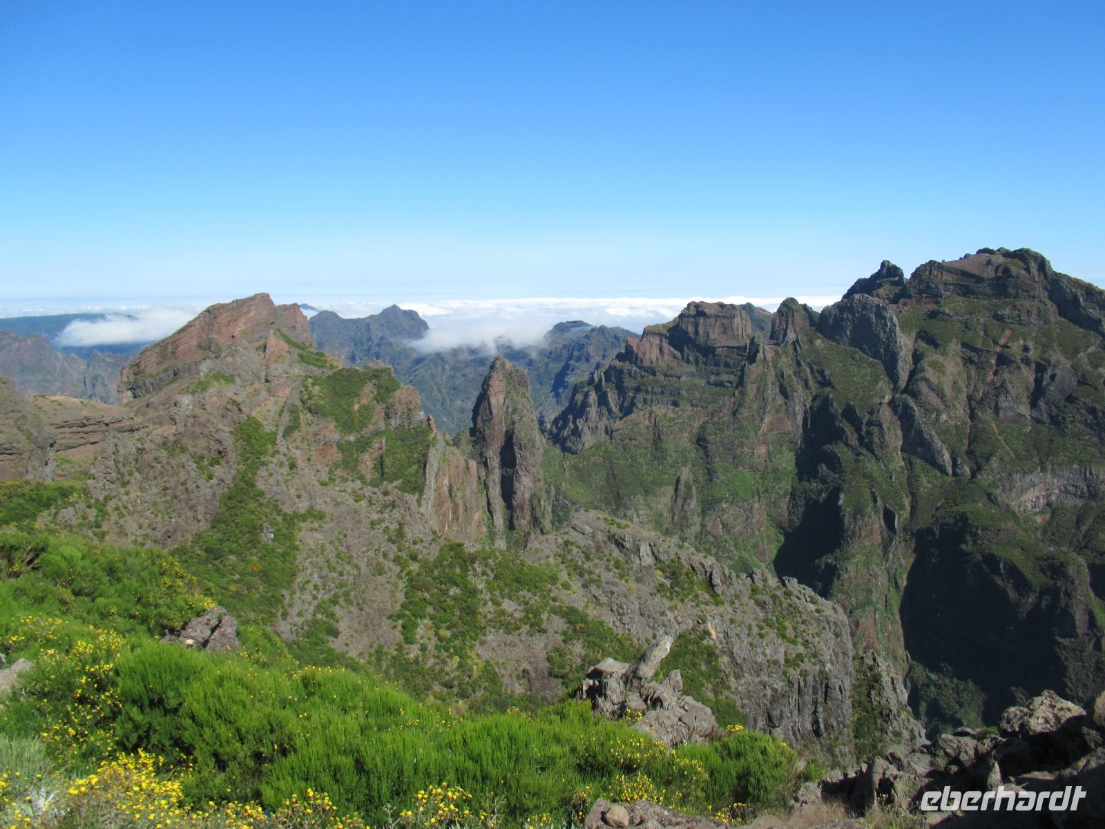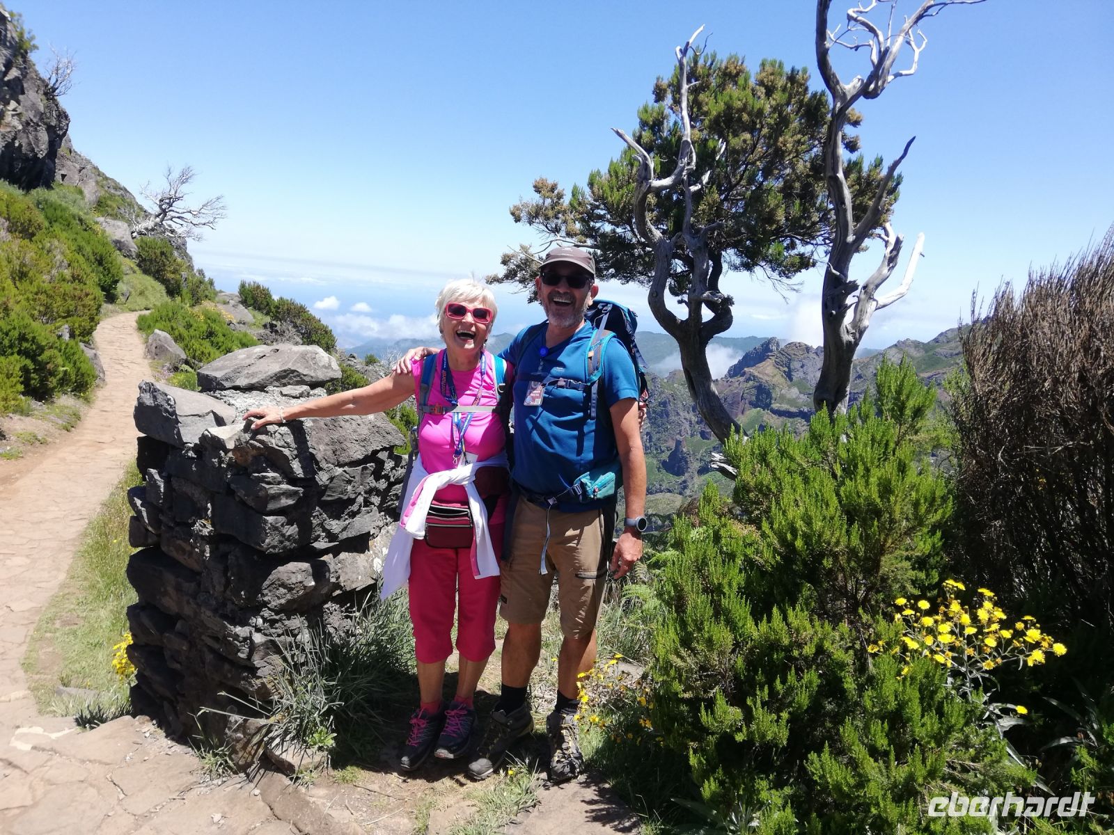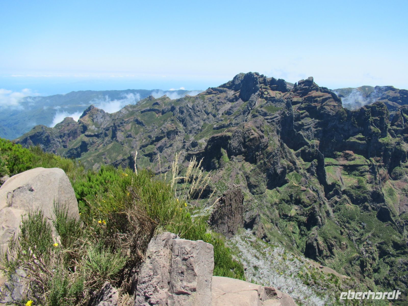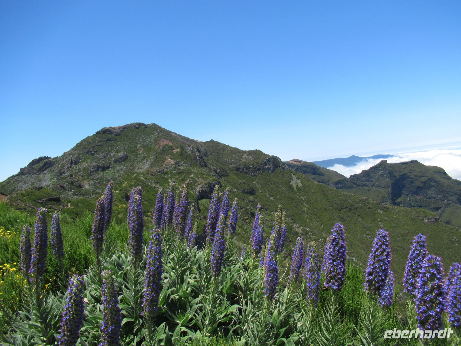 Alle anderen schreiten weiter und an vielen Stellen bewundern wir nicht nur die umliegende Berge, Schluchten aber auch die Vielfalt der Pflanzen – Madeira Stolz, Margeriten, Ginster und viele andere Blümchen schmücken den Weg – und dass in dieser Höhe.