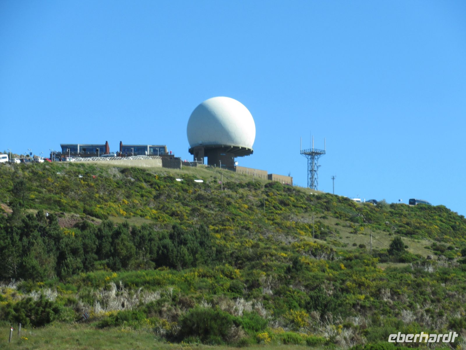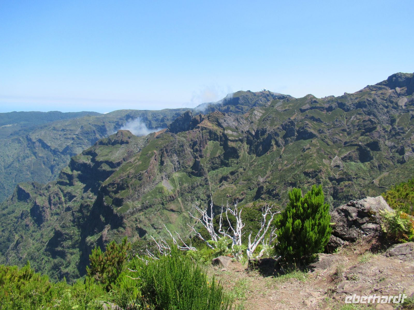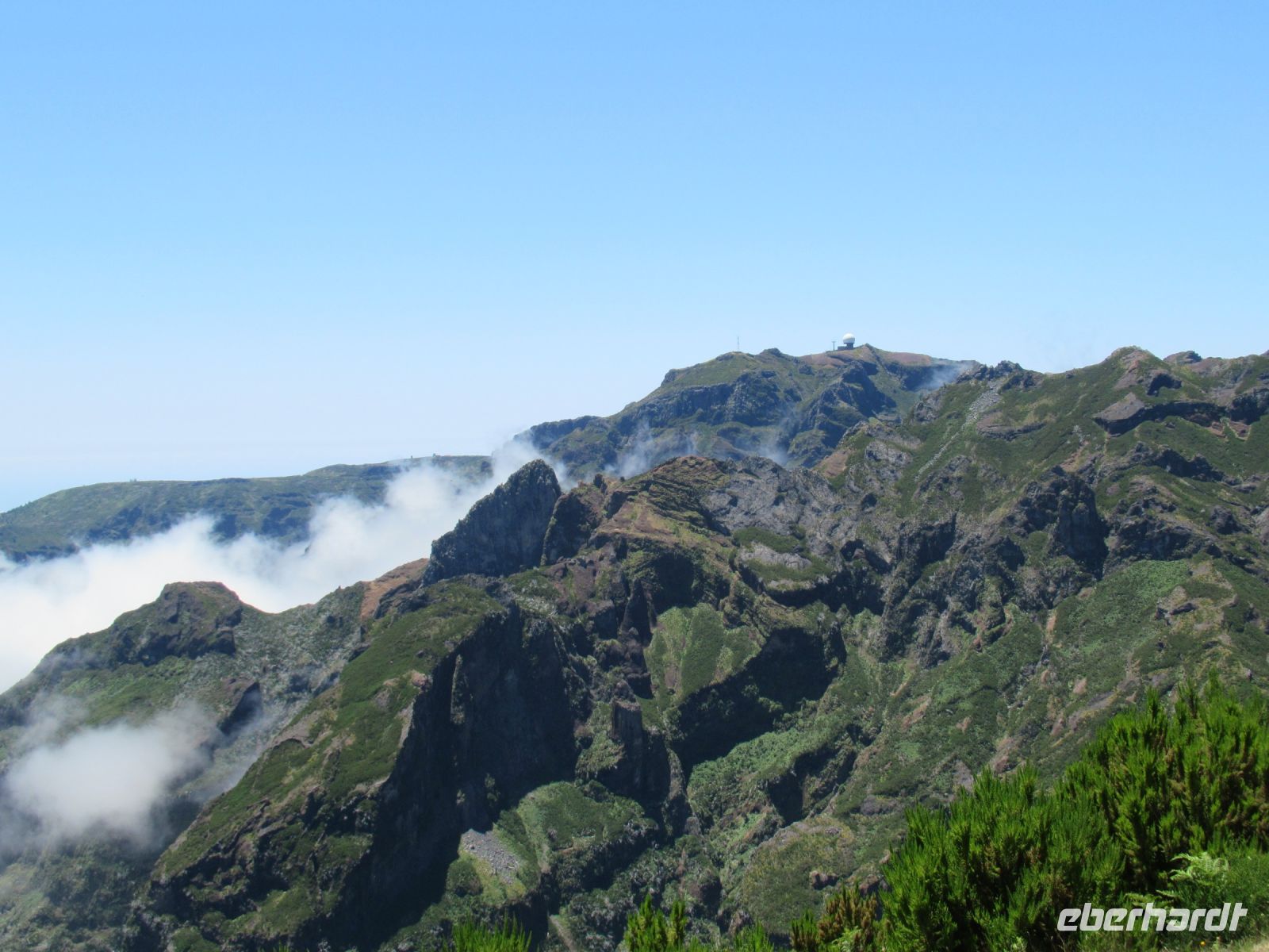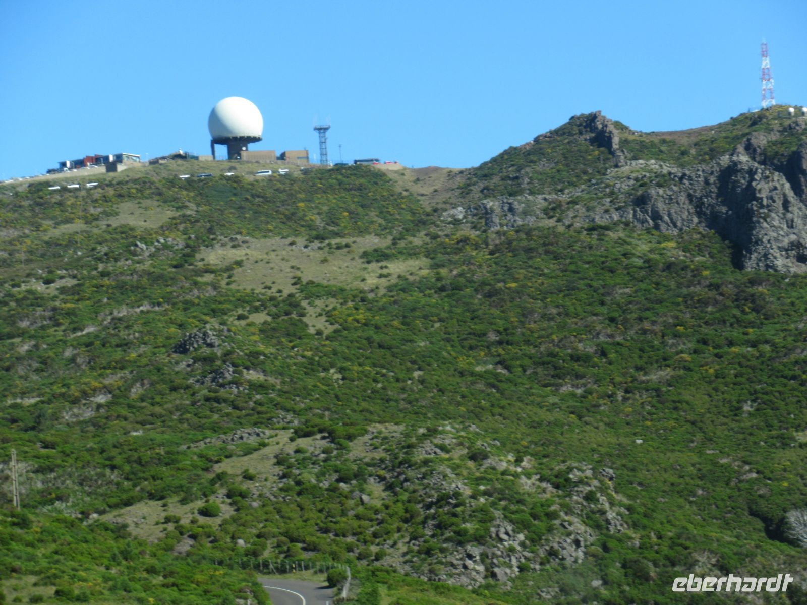 Unser Busfahrer Hugo fährt mit dem großen Bus die Serpentinen hoch. Manche Autos parken unorthodox an den Straßenseiten. Ab den Parkplatz führt uns Sergio nicht gleich zur Kuppel von Pico Arieiro, der mit 1818 der dritthöchste Berg von Madeira ist, sondern wir umrunden erst über einem sehr schönen Pfad den Funkturm und genießen wunderschöne Ausblicke in die Schluchten und auf die umliegende Berge. Wir beobachten eine Übung einer Bergrettungstruppe. Später erfahren wir aber, dass es keine Übung war, sondern eine echte Rettung eines gestürzten Touristen. Berge können auch gefährlich sein, daher ist Achtsamkeit bei jedem Schritt gefordert. Wir kommen wieder zum Ausgangspunkt und einige gehen noch zu dem Arieiro und der weißen Kuppel des Observatoriums. Von hier kann man einige Wanderwege starten, einer führt auch zu dem Pico Ruivo, den höchsten Berg Madeiras, den wir aber von einem anderen Ausgangspunkt heute besteigen werden.