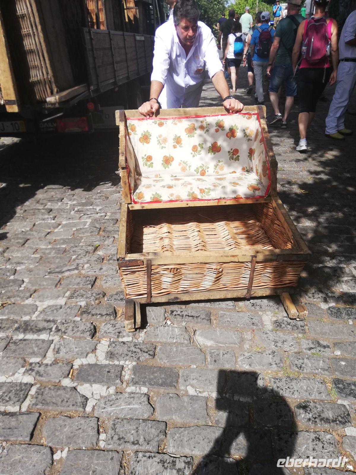 Jetzt laufen wir von der Kapelle nach unten zu Startstation der Korbschlitten – ja auch ohne Schnee kann man auf Madeira Schlittenfahren. Was heute als einzigartige touristische Attraktion gilt, war früher für Transport der Waren der Einwohner und später auch zur schnelleren Beförderung der Personen den Berg hinunter nach Funchal. Die Geschichte der Monte-Korbschlittenfahrten geht bis auf das Jahr 1890 zurück.
