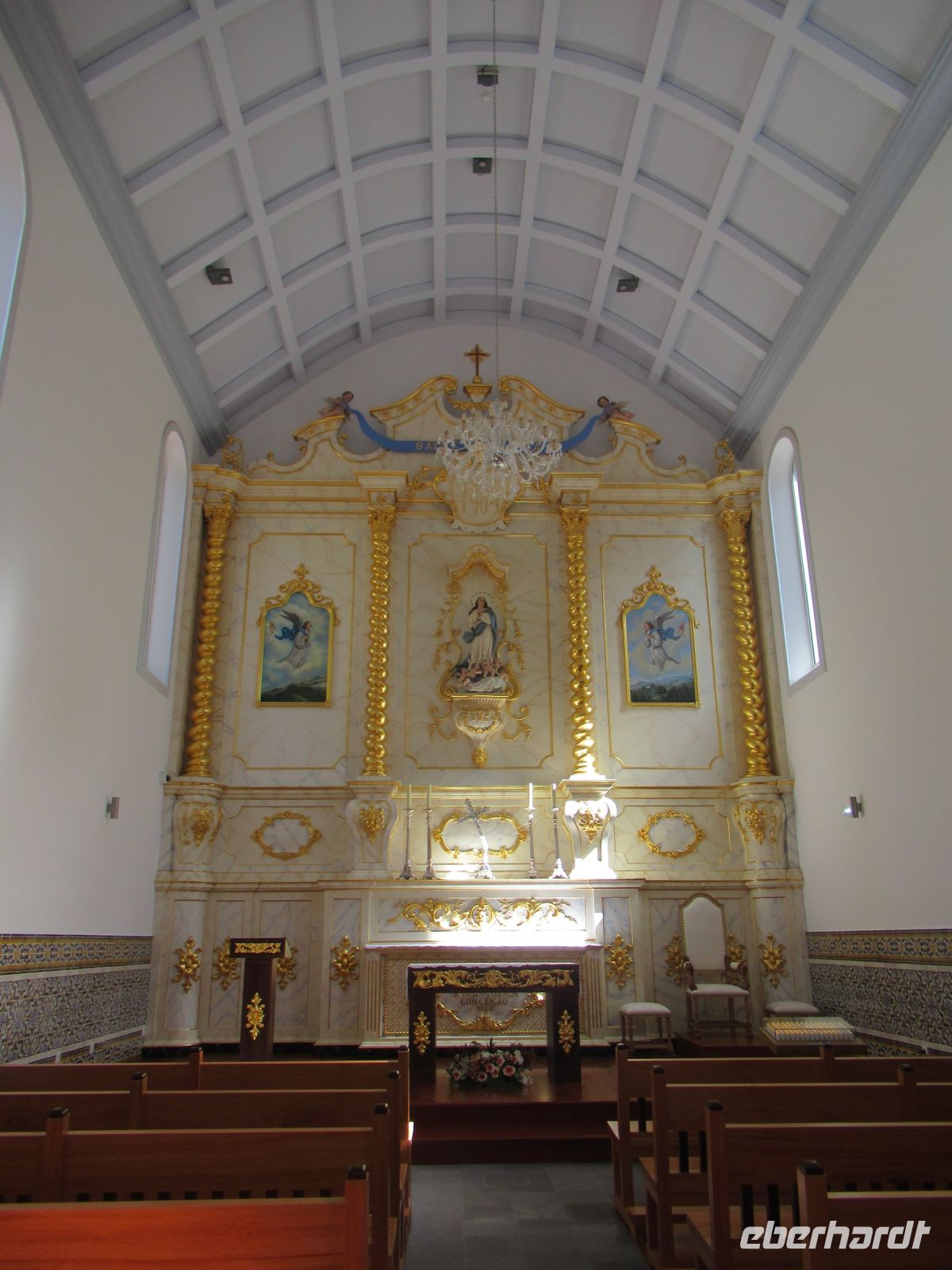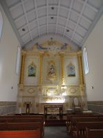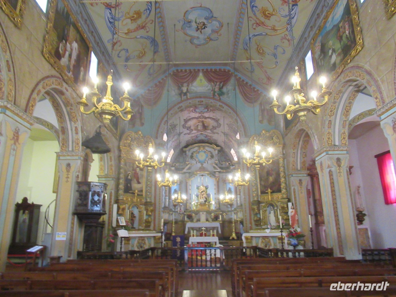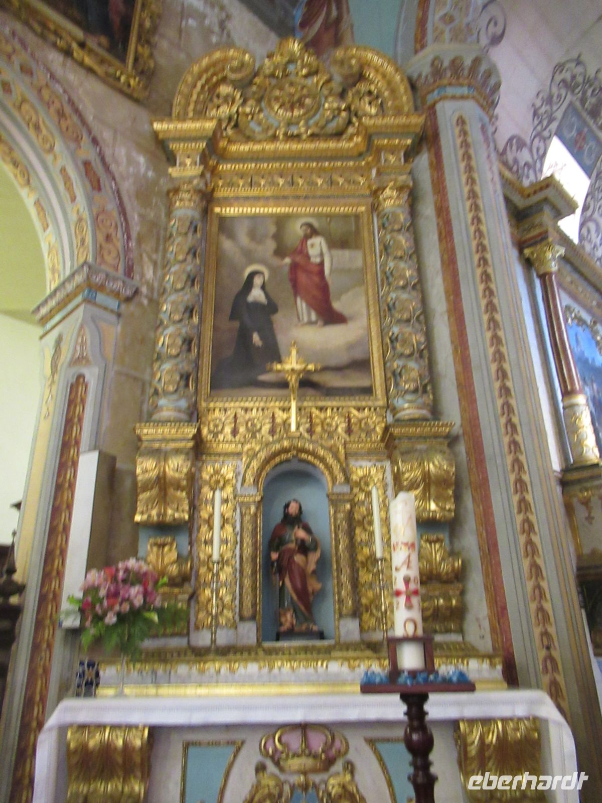 Angekommen an dem großen schön gepflasterten Platz betreten wir die Kirche. Der vergoldete Altar und der Boden sind mit lila Blumen geschmückt, alles für das heutige Fest vorbereitet.