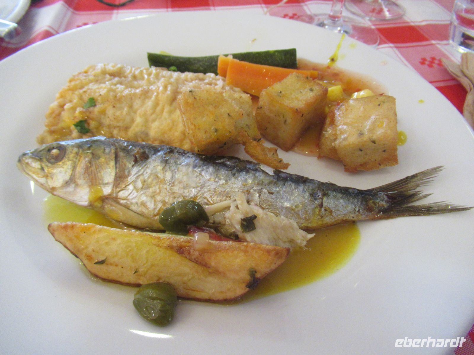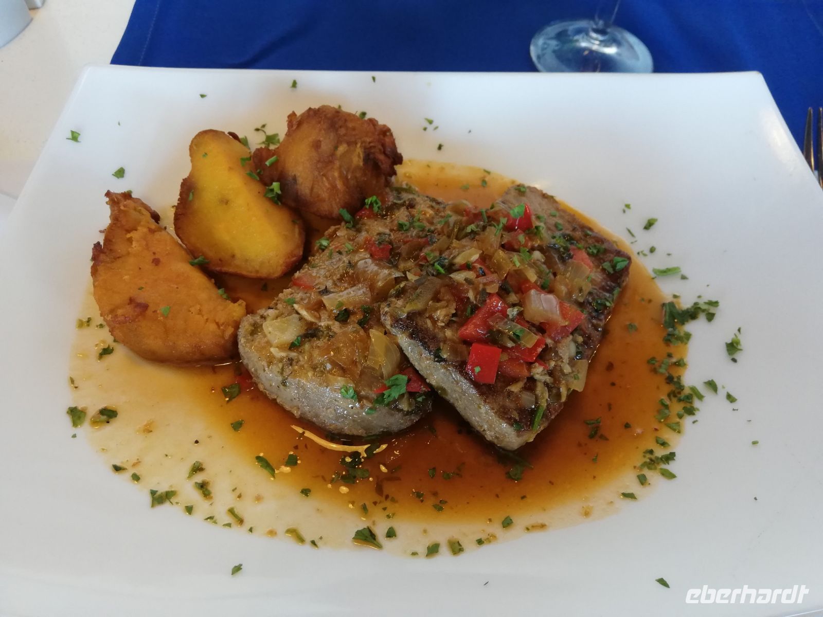 Serviert wird erst geröstetes Knoblauchbrot und dann die Spezialität, Degenfisch mit Banane und Maracuja, gegartes Gemüse und Kartoffeln. Guter Rose, Weiß- oder Rotwein begleitet das köstliche Essen.