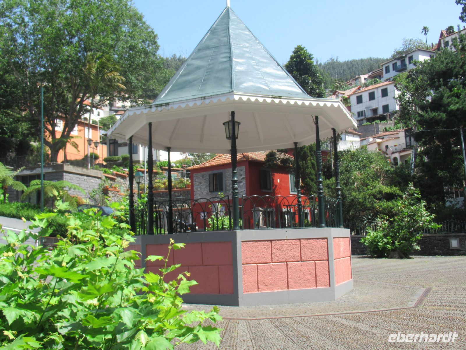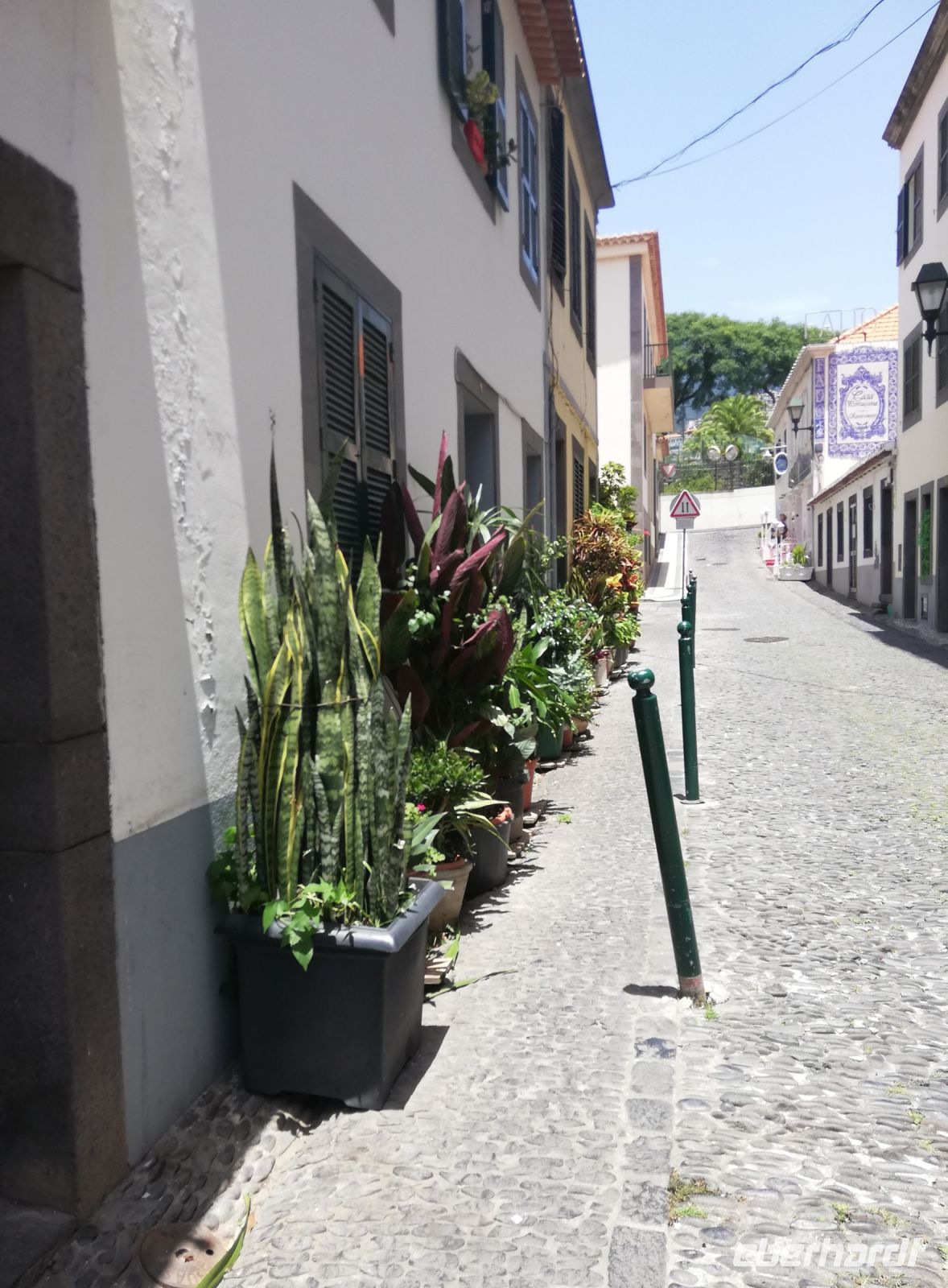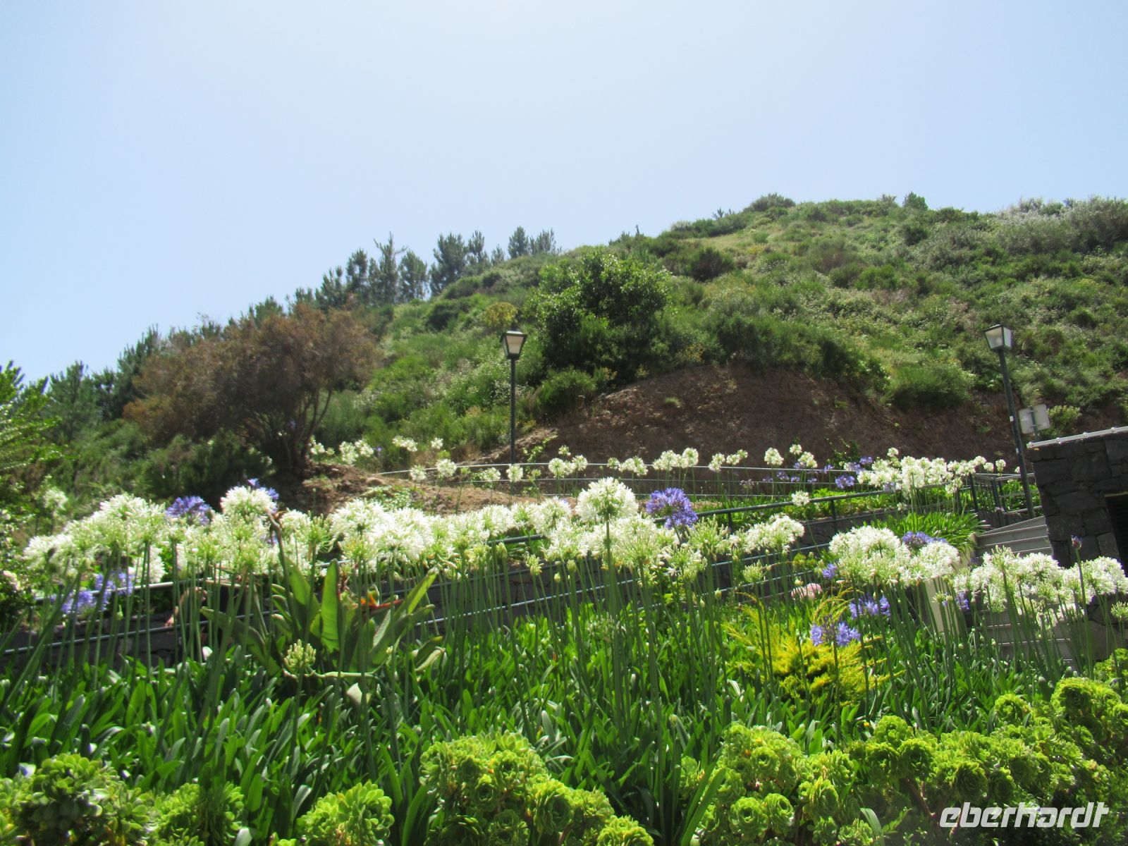 Wir starten am Curral dos Romeiros auf einem gepflasterten Weg durch den Wald, recht steil nach unten und dann wieder nach oben zu Monte. Natur pur, viele Blumen, kleine Felsenformationen, Steinbrücke über den Bach. Einfach herrlich, dennoch beim warmen Wetter für manche etwas anstrengend. Nach etwa 70 Minuten sind wir oben. Hier machen wir eine Pause im „Pátio das Babosas“und löschen unseren Durst mit frischgepressten Säften.