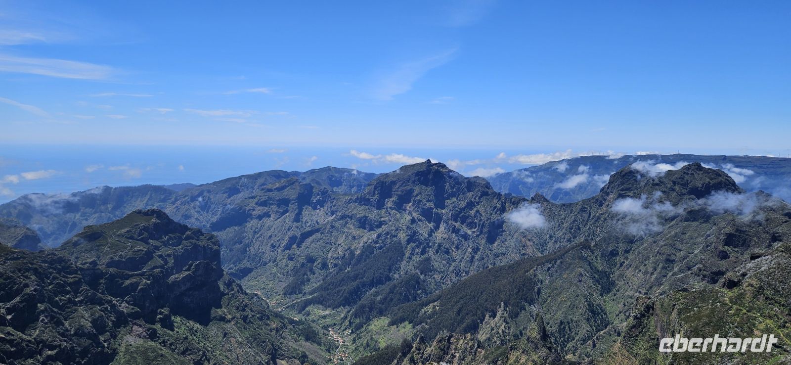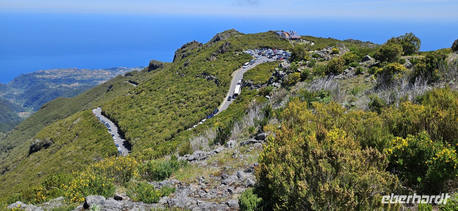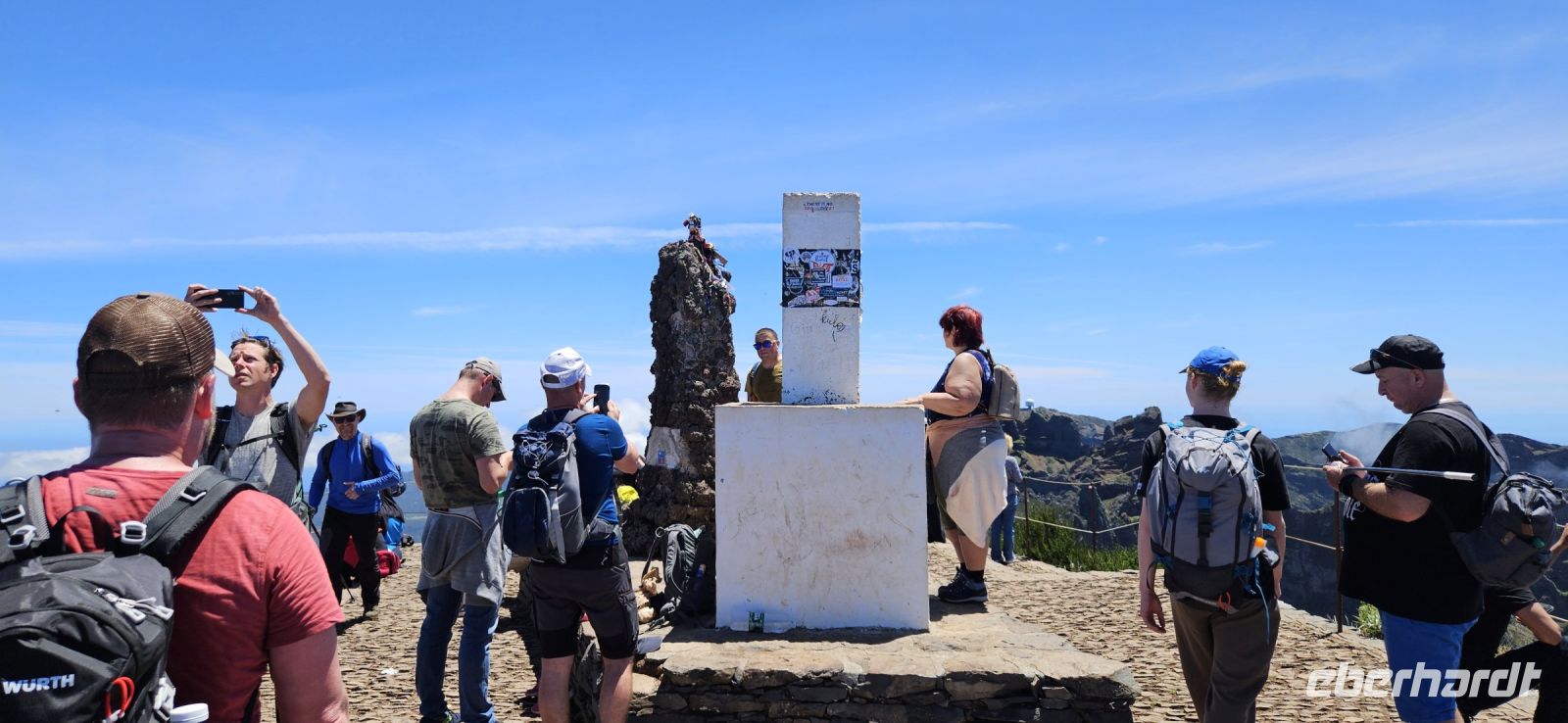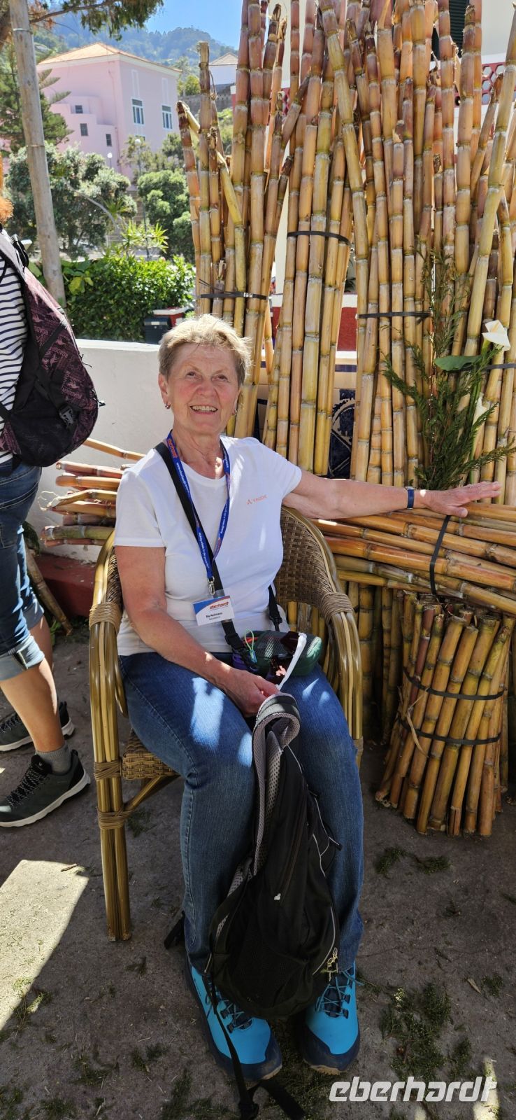 Nach dem Frühstück trafen wir wieder Berthold und unseren Fahrer Umberto. Wir fuhren über Monte hinauf zum Poiso Pass und dann weiter zu unserem ersten Ziel, dem Pico do Arieiro. Leider kamen wir nicht weit, die Strasse war völlig zugeparkt und überfüllt und so versuchte Umberto zu wenden. Das allein war schon ein Meisterwerk. Schliesslich waren wir wieder am Poiso Pass und fuhren nun talwärts nach Ribeira Frio. Dort gab es eine Forellenzucht, Souvenir Geschäfte, Restaurants usw. Wir nutzten nur die Toiletten und begannen danach unsere Wanderung auf der Levada Furada nach Balcoes - einem Aussichtsbalkon mit Blick auf die Nordküste und den Hauptkamm mit den höchsten Gipfeln Madeiras. Zurück nahmen wir den Weg ins benachbarte Tal und dort gab es in einer Bar zur Begrüßung einen Poncha und das traditionelle Knoblauchbrot Bolo do Caco. Auf der Weiterfahrt nach Santana war wieder Stau wegen einer Baustelle und so fuhren wir gleich hinauf zum Parkplatz an der Achada do Teixeira auf 1592 m Höhe. Unser Fahrer fand kaum einen Parkplatz wegen der vielen parkenden Mietwagen und da ahnten wir schon, dass wir auf dem Weg zum Pico Ruivo - dem höchsten Berg der Insel mit 1861 m Höhe - nicht allein sein würden. Wir wanderten auf einem gut ausgebauten Weg immer bergan und hatten einen fantastischen Blick hinüber zum Pico do Arieiro und zum Pico das Torres. Immer wieder mussten wir den entgegen kommenden Wanderern ausweichen und das kostete Zeit. An der Pico Ruivo Hütte auf 1800 m Höhe stärkten wir uns erst einmal und das letzte Stück hinauf zum Gipfel gingen nur noch einige wenige Singles. Der Blick vom Gipfel des Pico Ruivo war atemberaubend und reichte von der Hochebene Paul de Serra, zum Pico Grande, ins Nonnental, zu den Gipfeln von Pico das Torres und Pico do Arieiro und hinunter an die Nordküste nach Santana und Sao Jorge. Wieder zurück an der Achada gönnten wir uns noch einen Kaffee und dann fuhren wir hinunter nach Santana, um die traditionellen Schilf gedeckten Häuschen zu besuchen. Auf unserer aussichtsreichen Fahrt immer entlang der Nordküste legten wir einen Stopp in Porto da Cruz ein und besuchten die Zuckerrohr Fabrik. Die Ernte des Zuckerrohrs war in vollem Gange und so konnten wir der Verarbeitung in der Fabrik beiwohnen. Der Besuch wurde mit einem Gläschen Rum und leckeren Keksen aus Zuckerrohrmelasse abgerundet. Auf der Rückfahrt kamen wir an Machico vorbei und fuhren unter der Start- und Landebahn des Flughafens hindurch. Zum Abendessen gingen einige Singles mit mir ins nahe gelegene Restaurant Imperfeito und danach noch zu einem Spaziergang auf der Uferpromenade.
