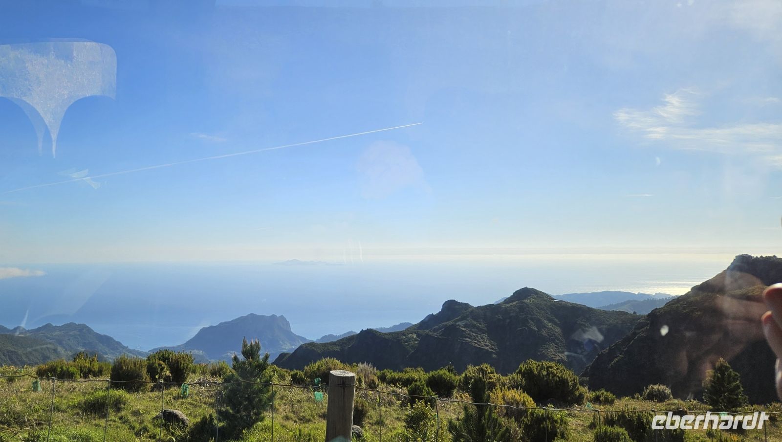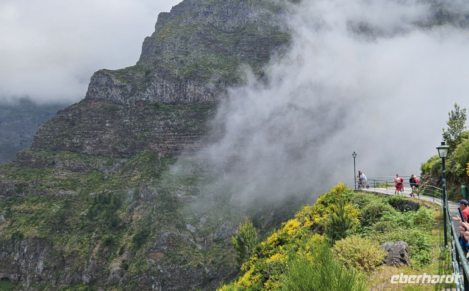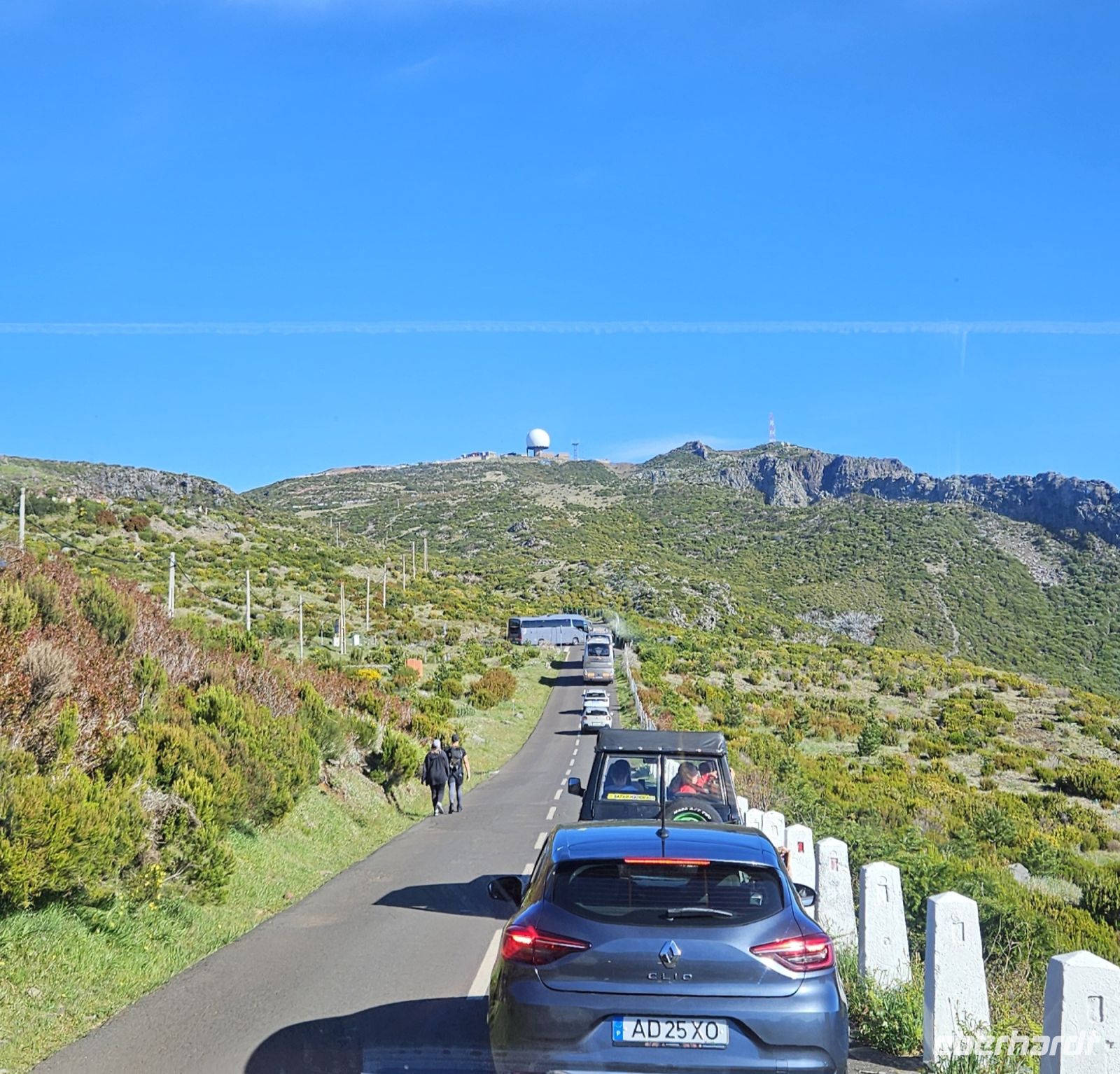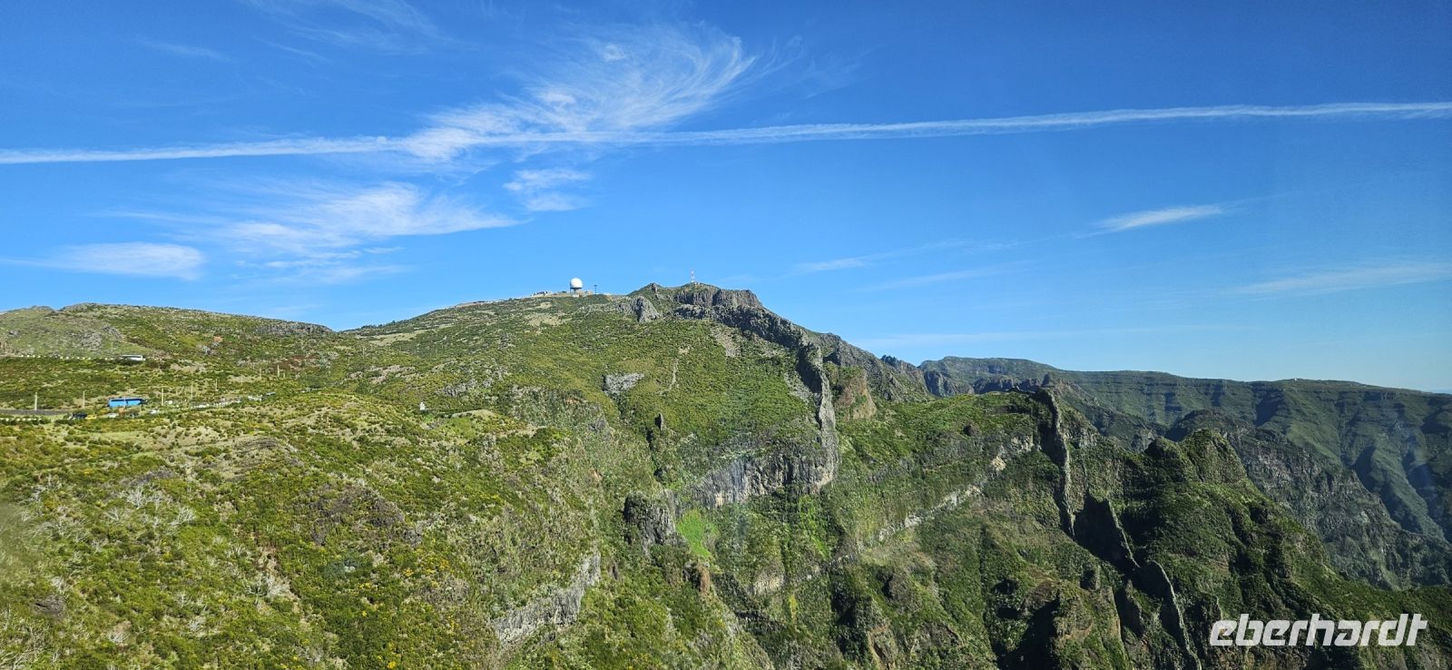 Nach dem Frühstück trafen wir wieder Berthold und unseren Fahrer Umberto. Wir fuhren über Monte hinauf zum Poiso Pass und dann weiter zu unserem ersten Ziel, dem Pico do Arieiro. Leider kamen wir nicht weit, die Strasse war völlig zugeparkt und überfüllt und so versuchte Umberto zu wenden. Das allein war schon ein Meisterwerk. Schliesslich waren wir wieder am Poiso Pass und fuhren nun talwärts nach Ribeira Frio. Dort gab es eine Forellenzucht, Souvenir Geschäfte, Restaurants usw. Wir nutzten nur die Toiletten und begannen danach unsere Wanderung auf der Levada Furada nach Balcoes - einem Aussichtsbalkon mit Blick auf die Nordküste und den Hauptkamm mit den höchsten Gipfeln Madeiras. Zurück nahmen wir den Weg ins benachbarte Tal und dort gab es in einer Bar zur Begrüßung einen Poncha und das traditionelle Knoblauchbrot Bolo do Caco. Auf der Weiterfahrt nach Santana war wieder Stau wegen einer Baustelle und so fuhren wir gleich hinauf zum Parkplatz an der Achada do Teixeira auf 1592 m Höhe. Unser Fahrer fand kaum einen Parkplatz wegen der vielen parkenden Mietwagen und da ahnten wir schon, dass wir auf dem Weg zum Pico Ruivo - dem höchsten Berg der Insel mit 1861 m Höhe - nicht allein sein würden. Wir wanderten auf einem gut ausgebauten Weg immer bergan und hatten einen fantastischen Blick hinüber zum Pico do Arieiro und zum Pico das Torres. Immer wieder mussten wir den entgegen kommenden Wanderern ausweichen und das kostete Zeit. An der Pico Ruivo Hütte auf 1800 m Höhe stärkten wir uns erst einmal und das letzte Stück hinauf zum Gipfel gingen nur noch einige wenige Singles. Der Blick vom Gipfel des Pico Ruivo war atemberaubend und reichte von der Hochebene Paul de Serra, zum Pico Grande, ins Nonnental, zu den Gipfeln von Pico das Torres und Pico do Arieiro und hinunter an die Nordküste nach Santana und Sao Jorge. Wieder zurück an der Achada gönnten wir uns noch einen Kaffee und dann fuhren wir hinunter nach Santana, um die traditionellen Schilf gedeckten Häuschen zu besuchen. Auf unserer aussichtsreichen Fahrt immer entlang der Nordküste legten wir einen Stopp in Porto da Cruz ein und besuchten die Zuckerrohr Fabrik. Die Ernte des Zuckerrohrs war in vollem Gange und so konnten wir der Verarbeitung in der Fabrik beiwohnen. Der Besuch wurde mit einem Gläschen Rum und leckeren Keksen aus Zuckerrohrmelasse abgerundet. Auf der Rückfahrt kamen wir an Machico vorbei und fuhren unter der Start- und Landebahn des Flughafens hindurch. Zum Abendessen gingen einige Singles mit mir ins nahe gelegene Restaurant Imperfeito und danach noch zu einem Spaziergang auf der Uferpromenade.